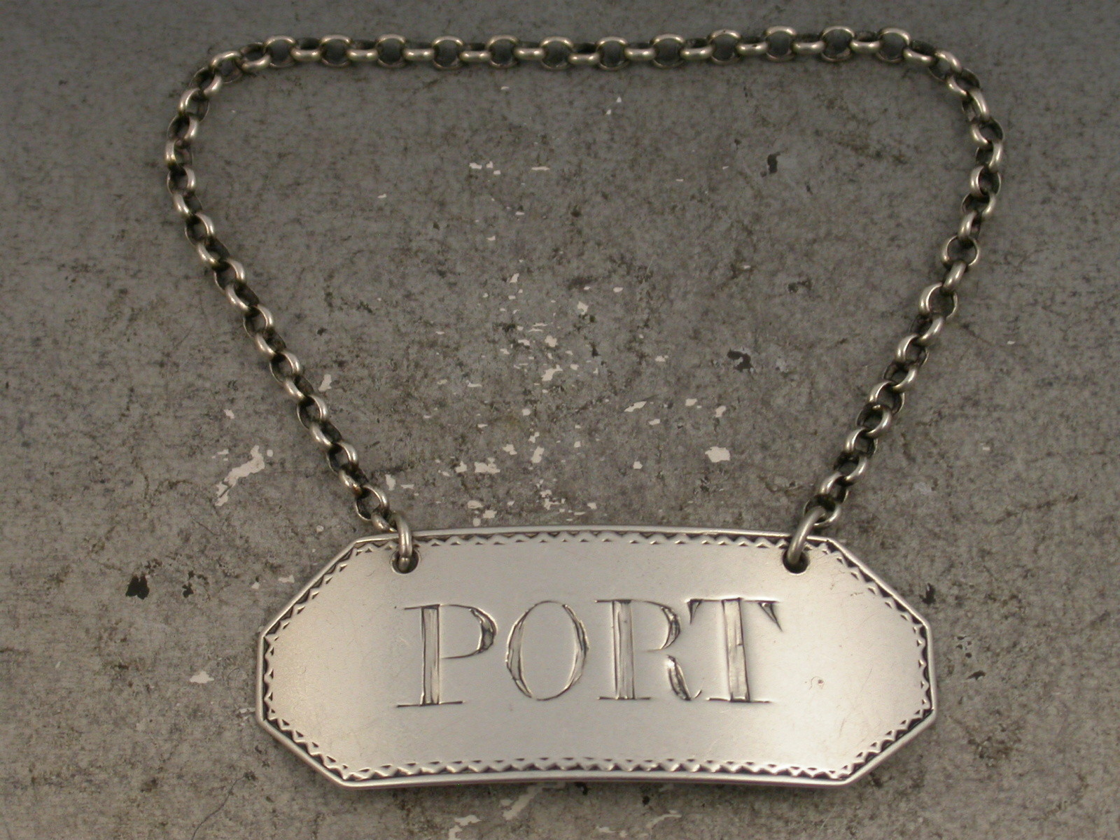 An extremely rare George III 18th century Provincial silver Wine Label of narrow rectangular form with distinctively broad cut-corners and feather edge border, incised for Port