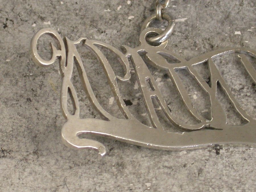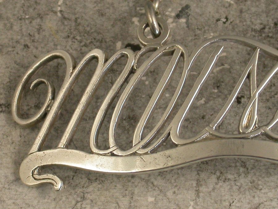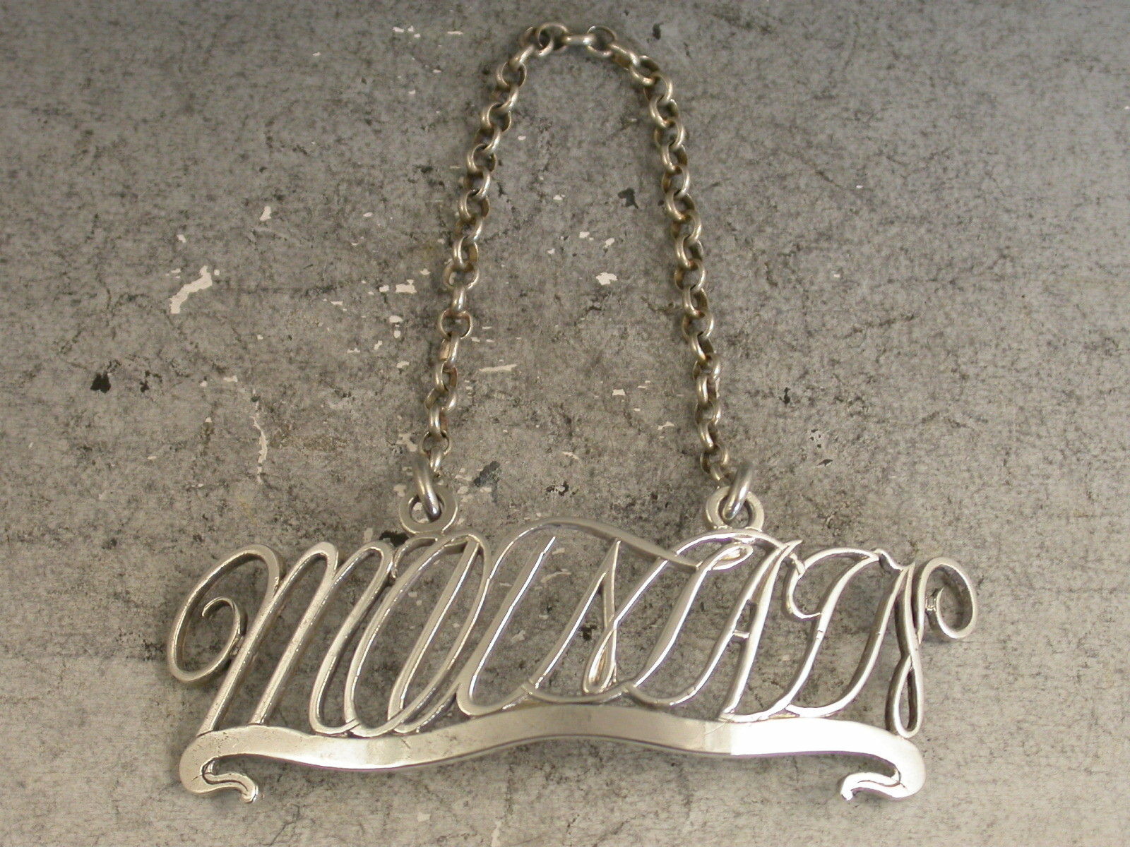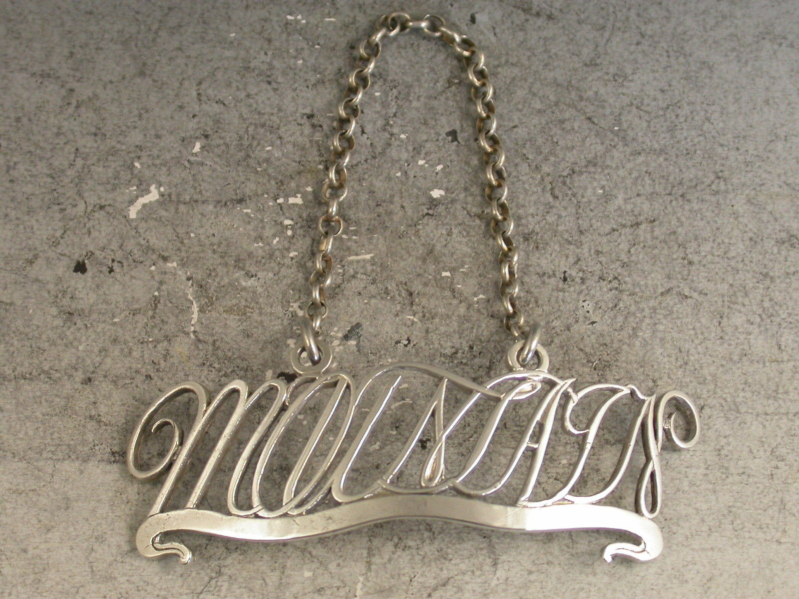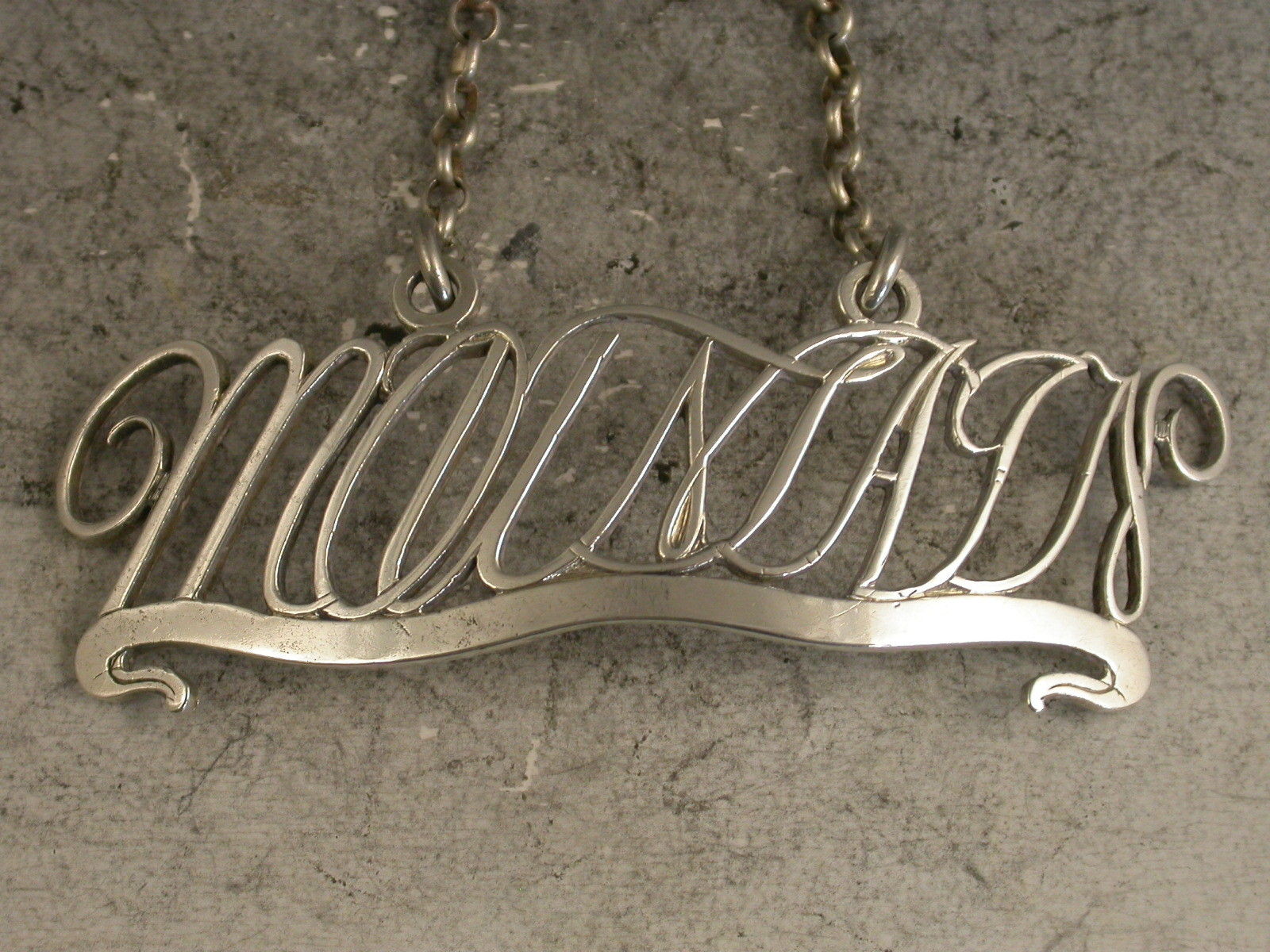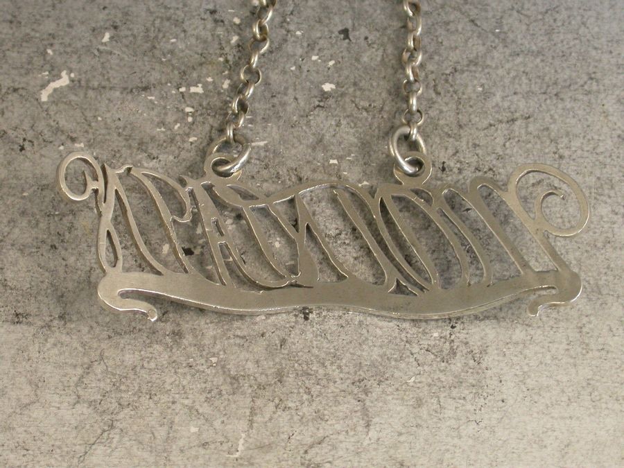 A very unusual antique silver Wine Label of cut-out script letter form, creating the title for Mountain upon a scrolled banner with raised eyelets.