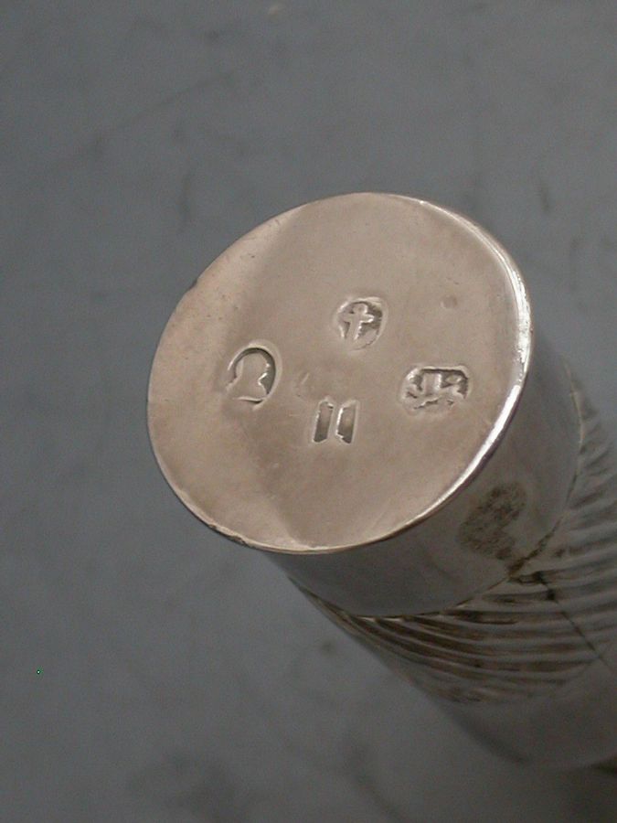 A rare George III silver Penner, the tapering Ink Pot with a band of fluted decoration that is repeated on the shaft, the pot has a threaded neck to accept the screw on Penner with reversible pull-out nib to the terminal, a cork stopper to inkwell.