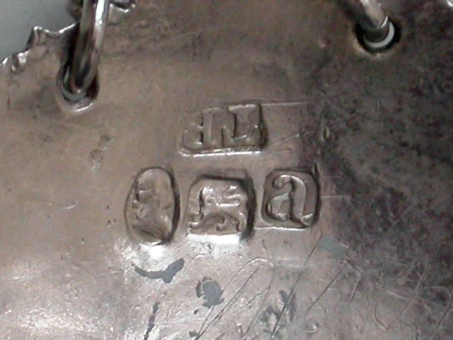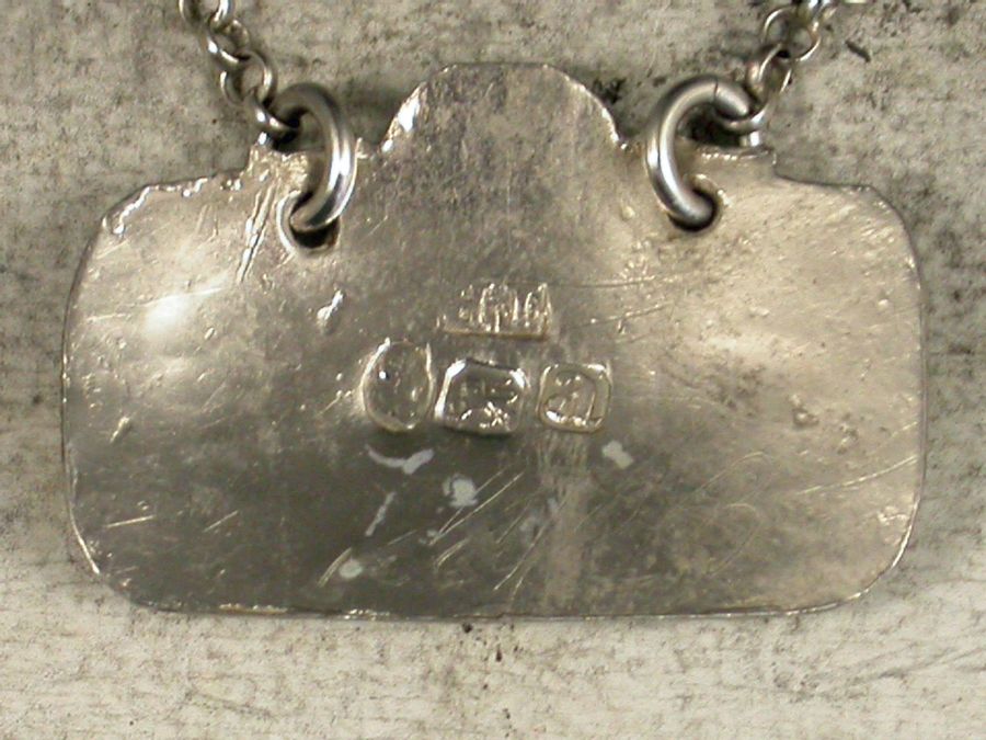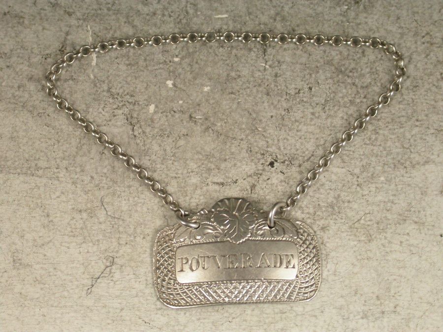 A rare George III silver Sauce Label of rounded rectangular form with hobnail cut border, a domed surmount engraved with a leaf and scrolls, incised for Pouverade (an alternative spelling of the French Sauce - Poivrade. Sauce Poivrade is a traditional French recipe for a classic peppered brown sauce made from a brown stock base with red wine, vinegar, vegetables, peppercorns and juniper berries that's typically served with game and barbecued meats).