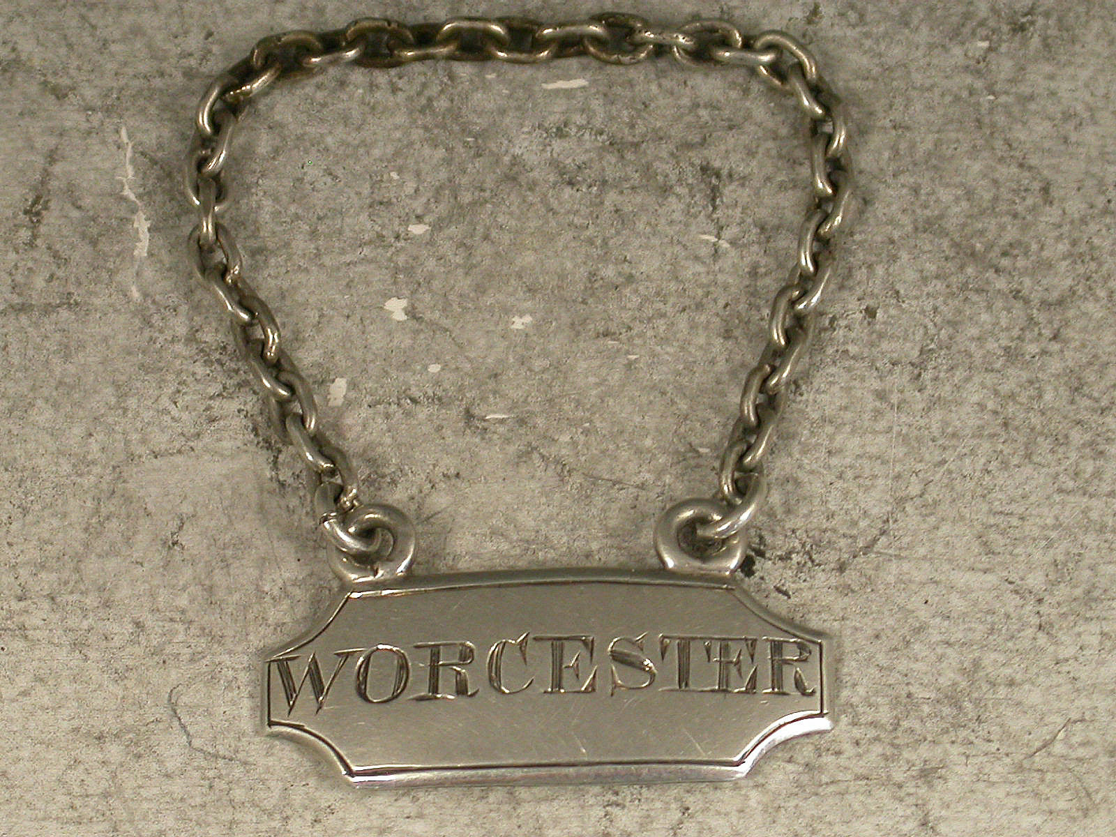 A rare George III silver Sauce Label of narrow rectangular form with concave cut-corners and raised eyelets, single reeded border, incised for Worcester.