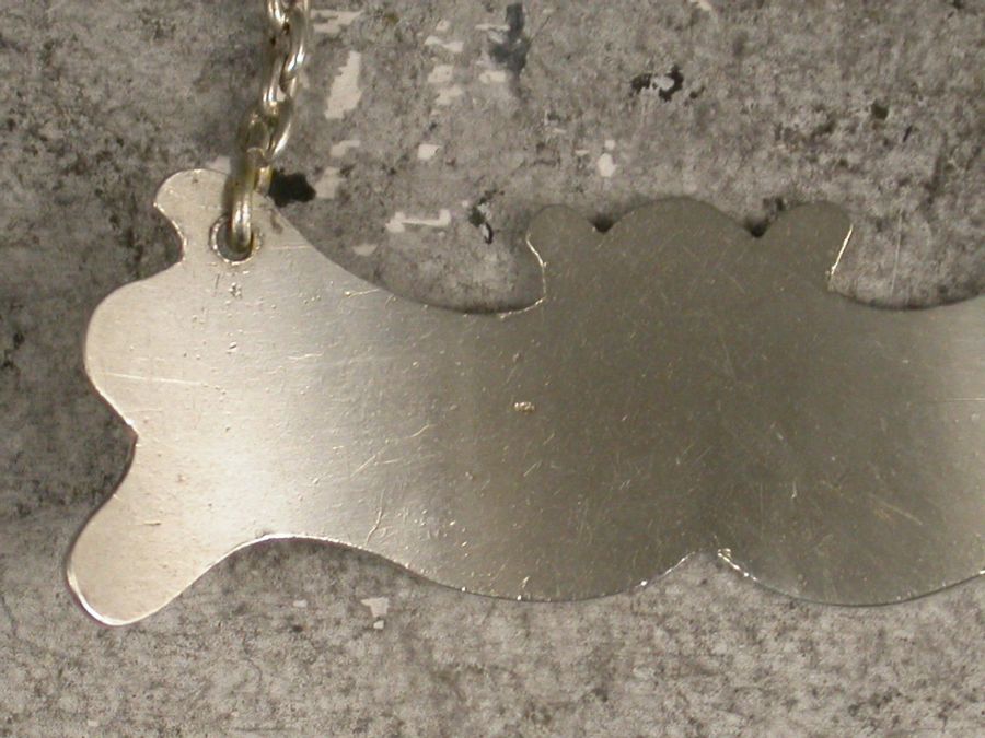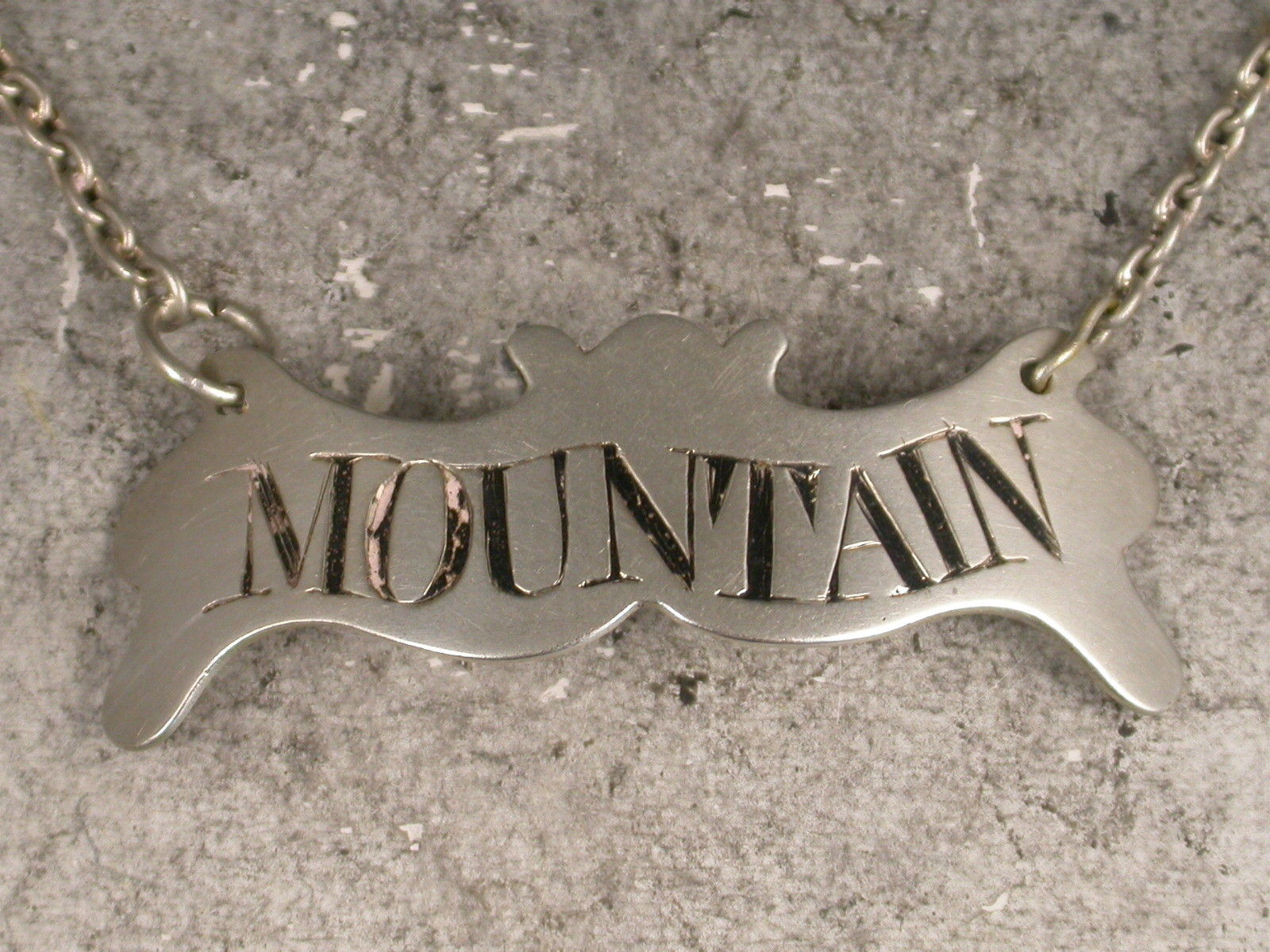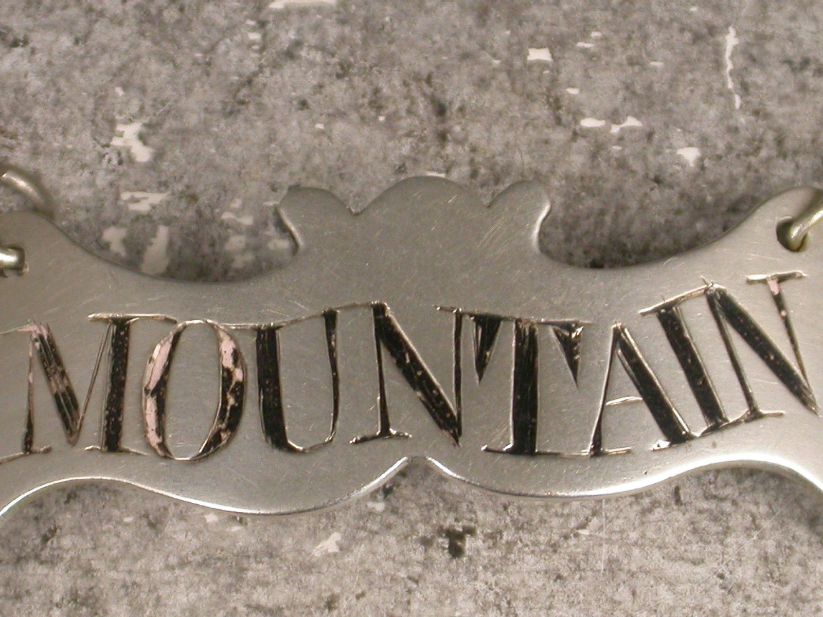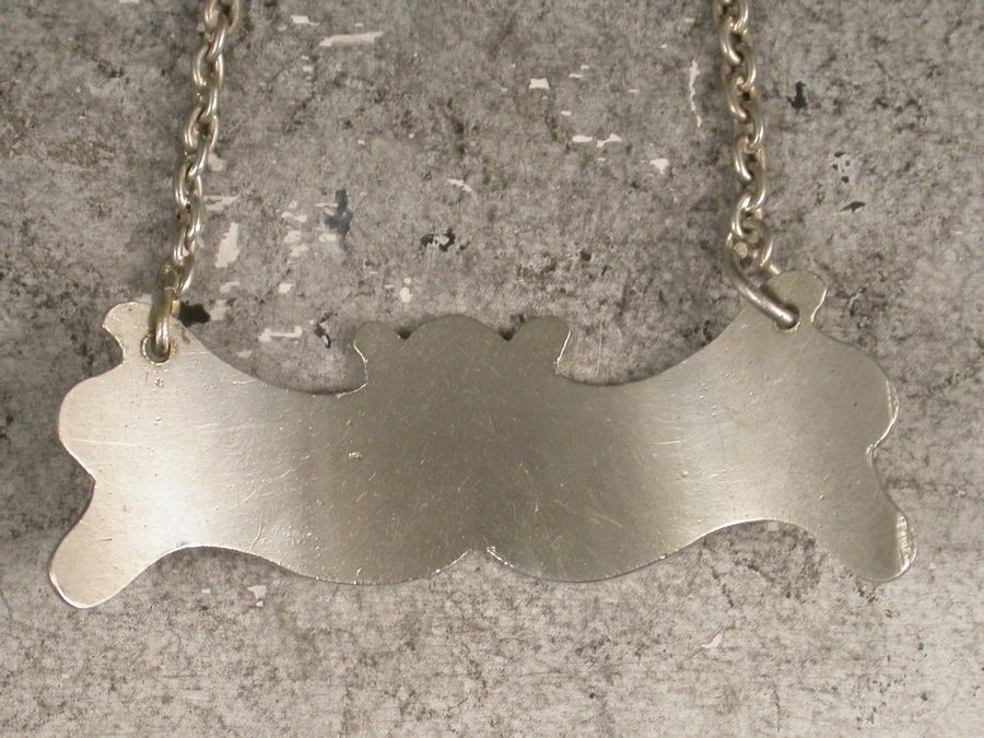 A rare and unusual George III silver Wine Label of narrow flattened escutcheon shape with waved sides and top, ogee base (not unlike a batman symbol). Incised and niello filled for Mountain.