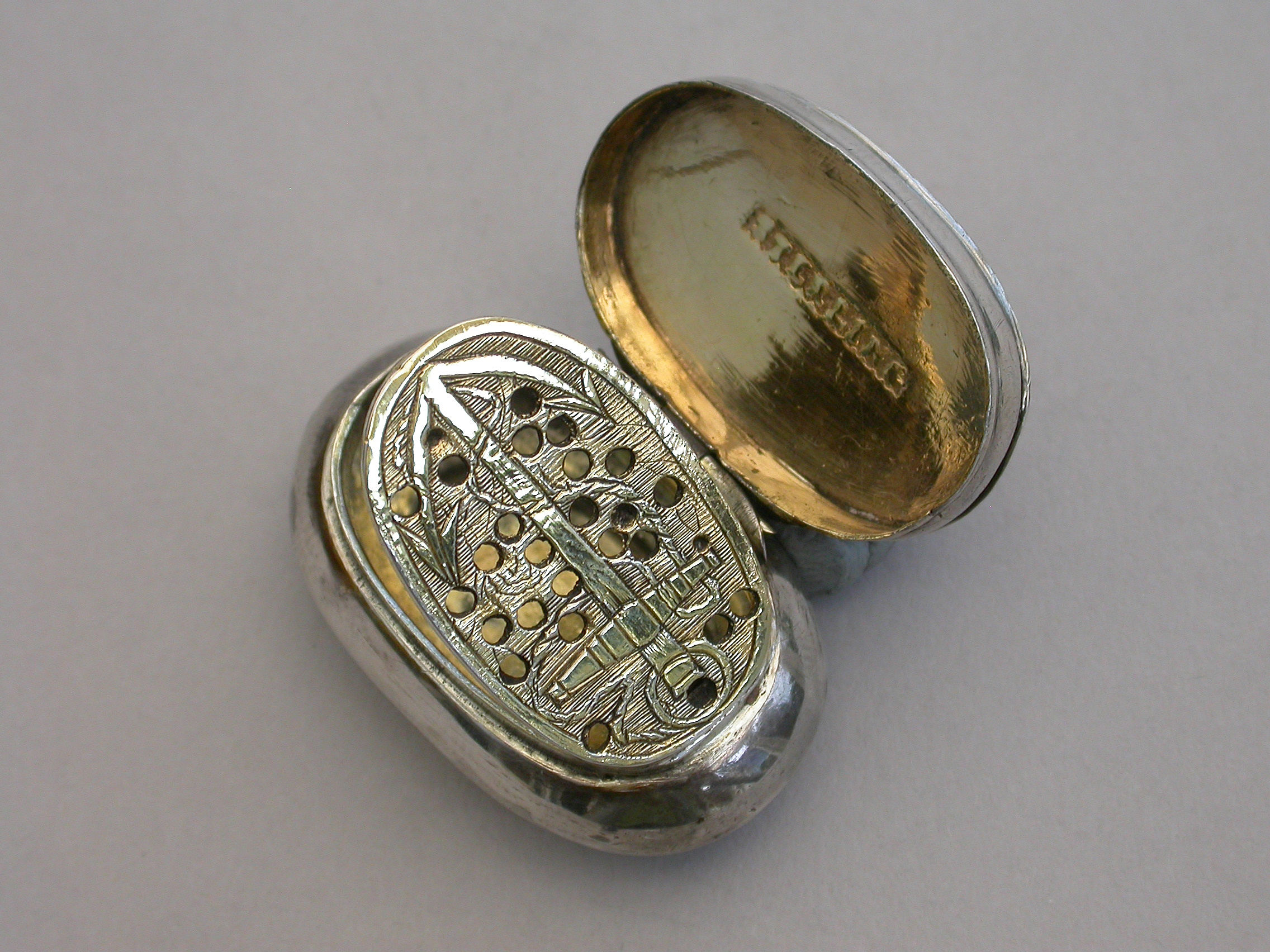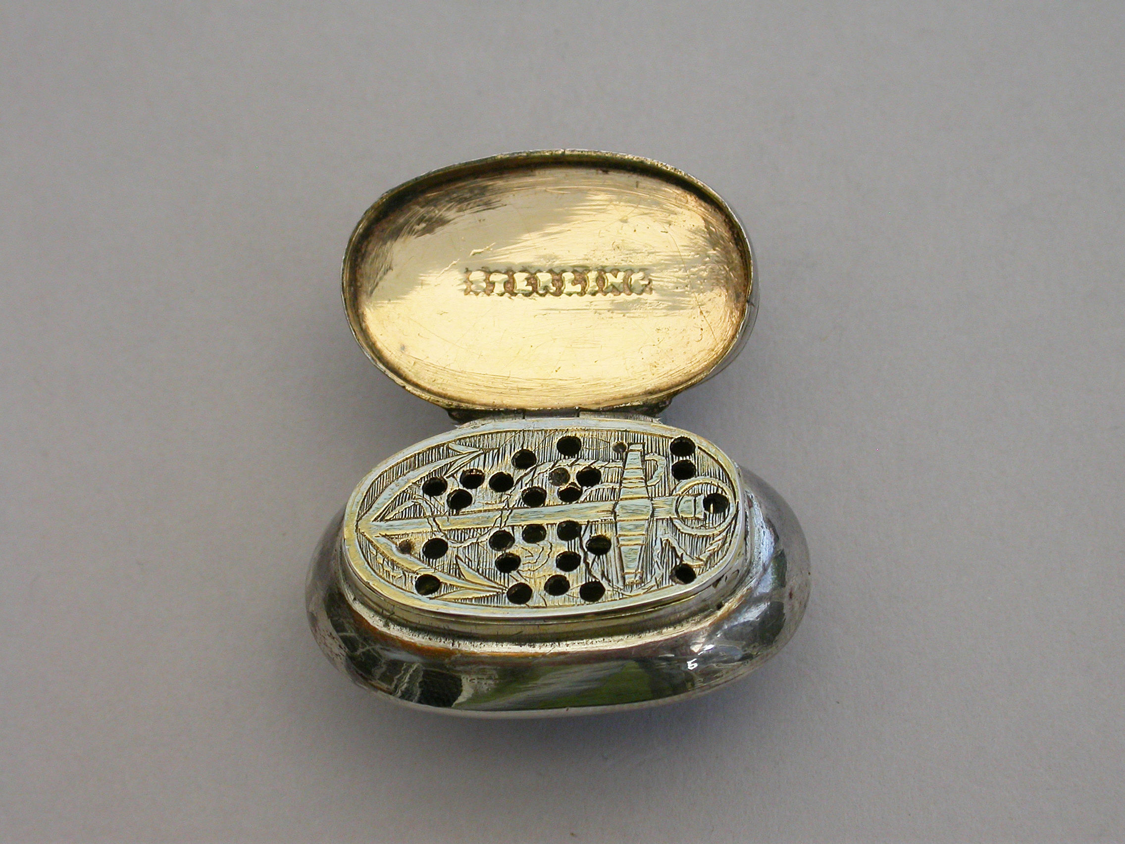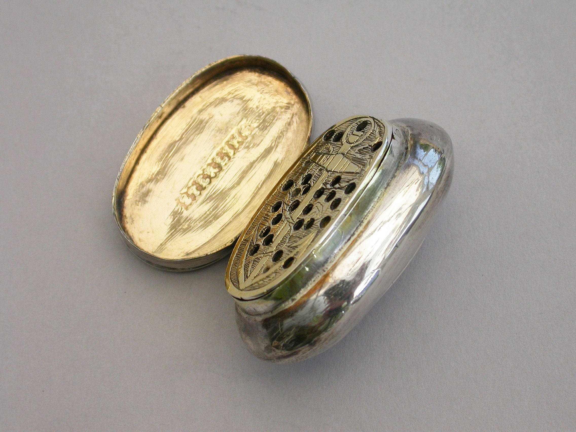 n extremely rare George III Irish Provincial silver Vinaigrette, with plain waisted oval form, the cover engraved with contemporary initials, silver gilt grille pierced with plain holes and engraved with a fouled anchor.