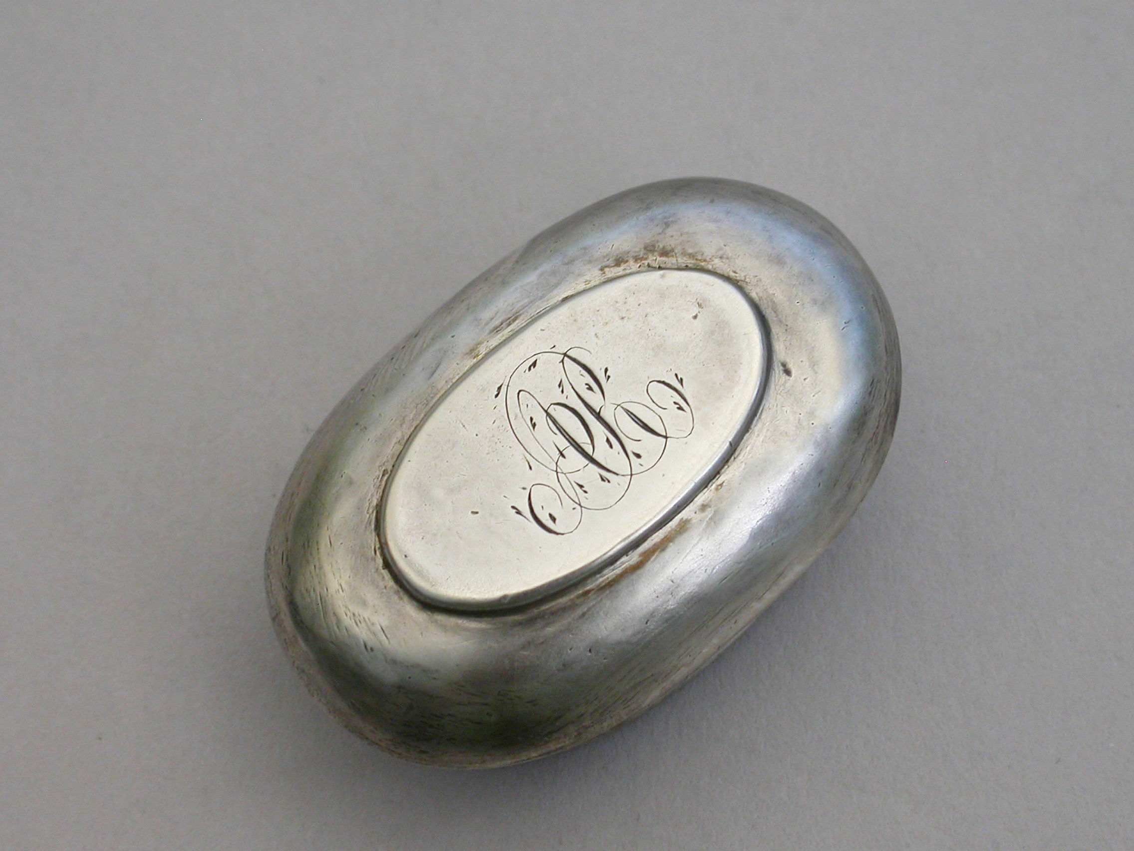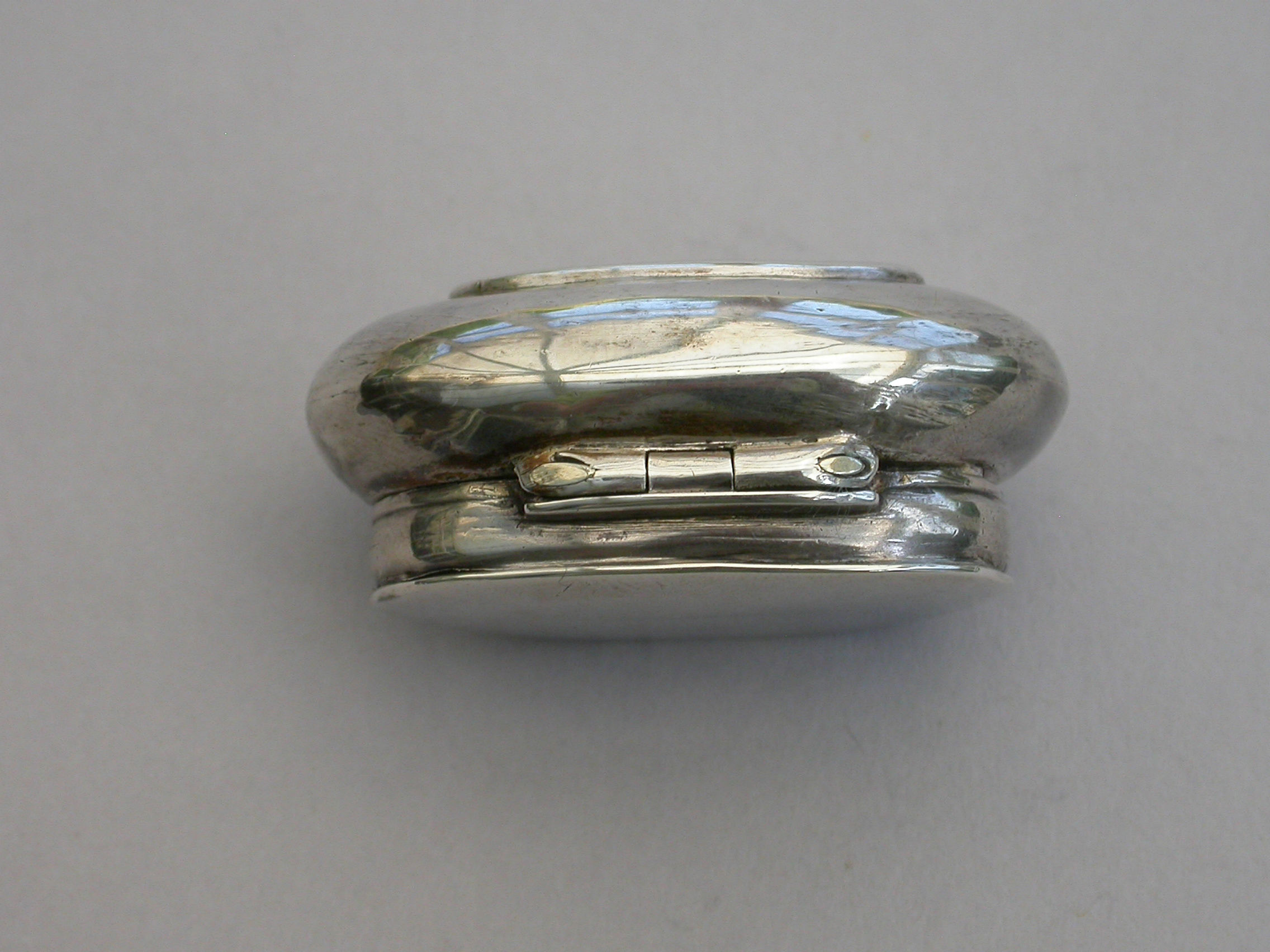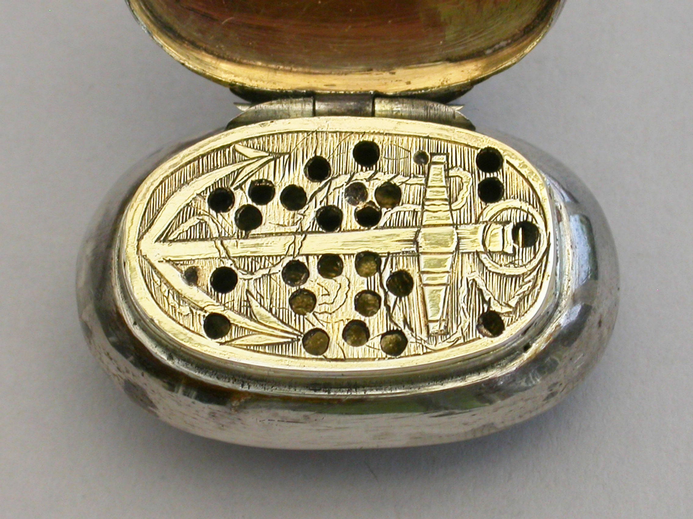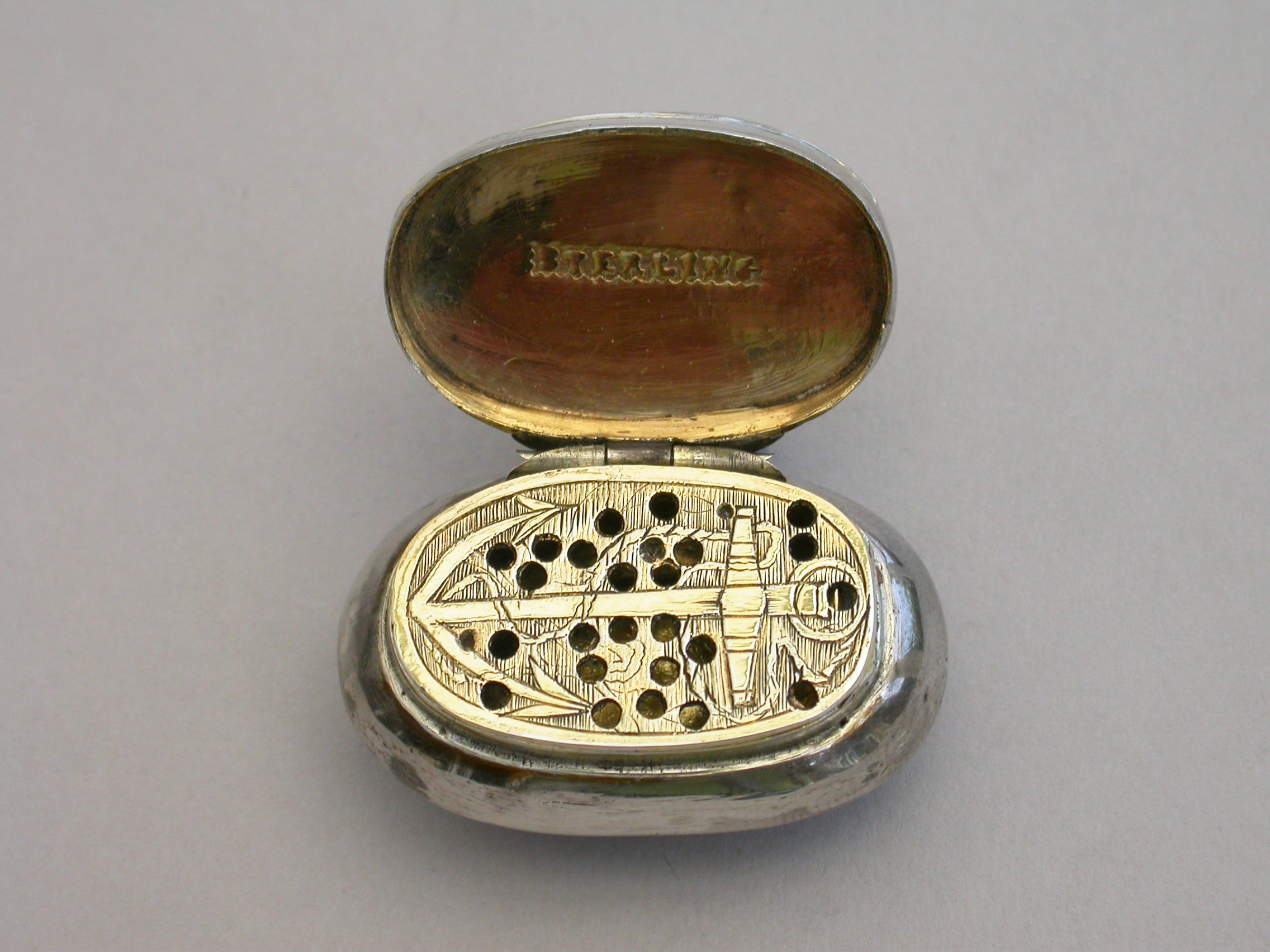 n extremely rare George III Irish Provincial silver Vinaigrette, with plain waisted oval form, the cover engraved with contemporary initials, silver gilt grille pierced with plain holes and engraved with a fouled anchor.