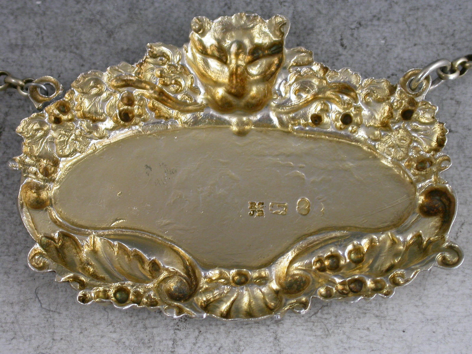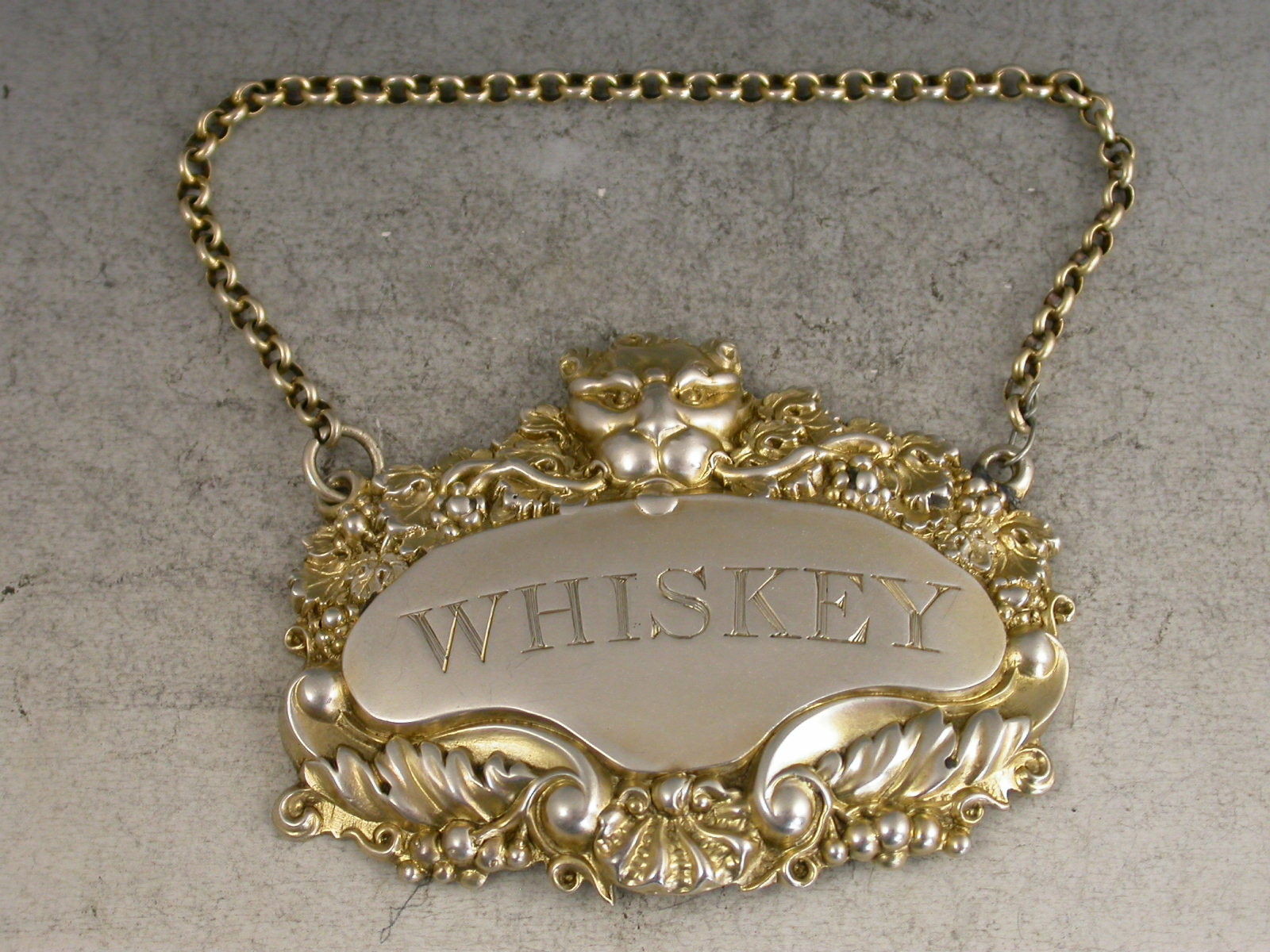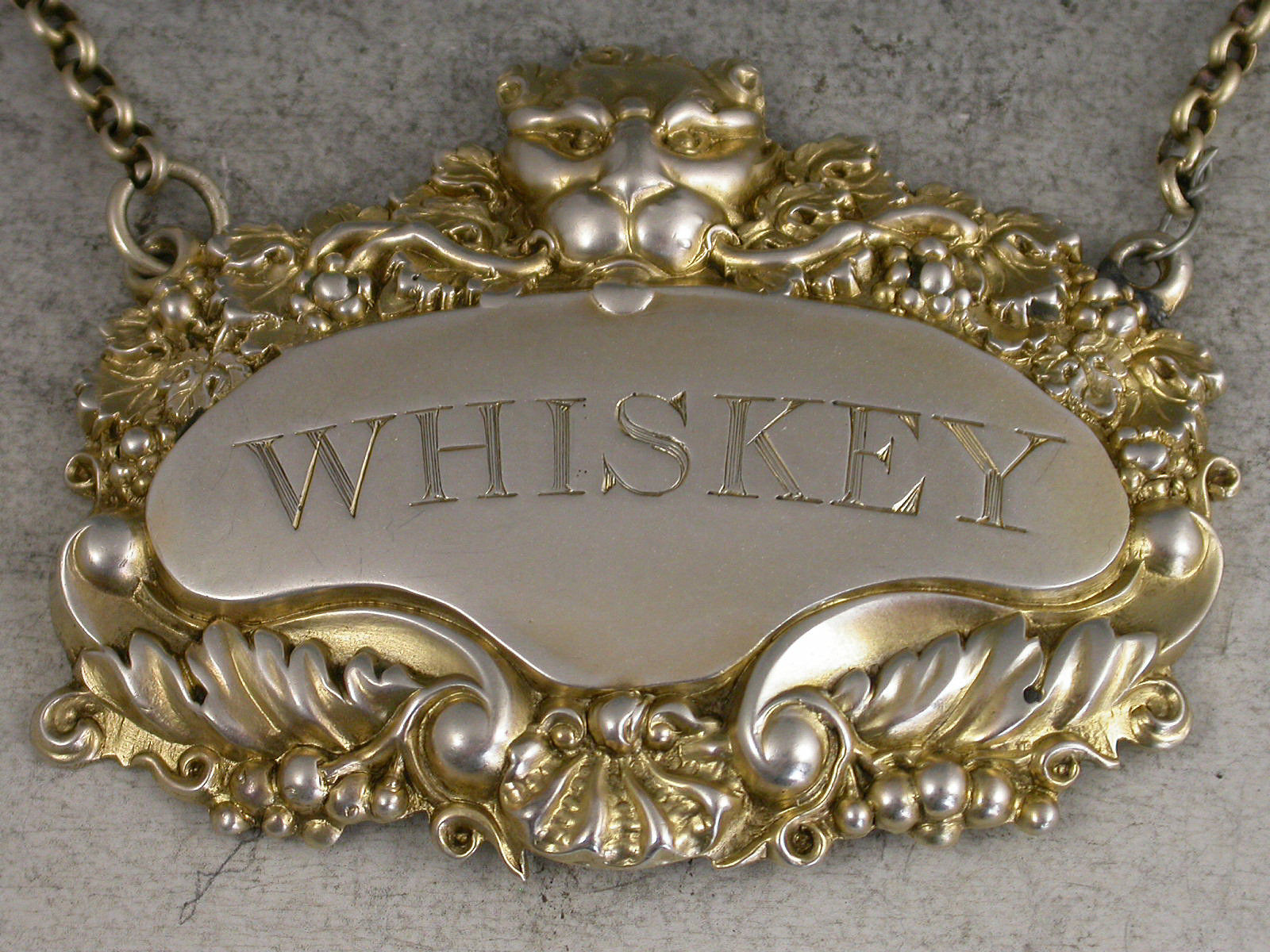 An extremely rare George III parcel gilt silver Wine Label of large cartouche form with elaborate border of shells, scrolls, acanthus leaves and fruiting vines with a leopards mask head surmount, incised for Whiskey.