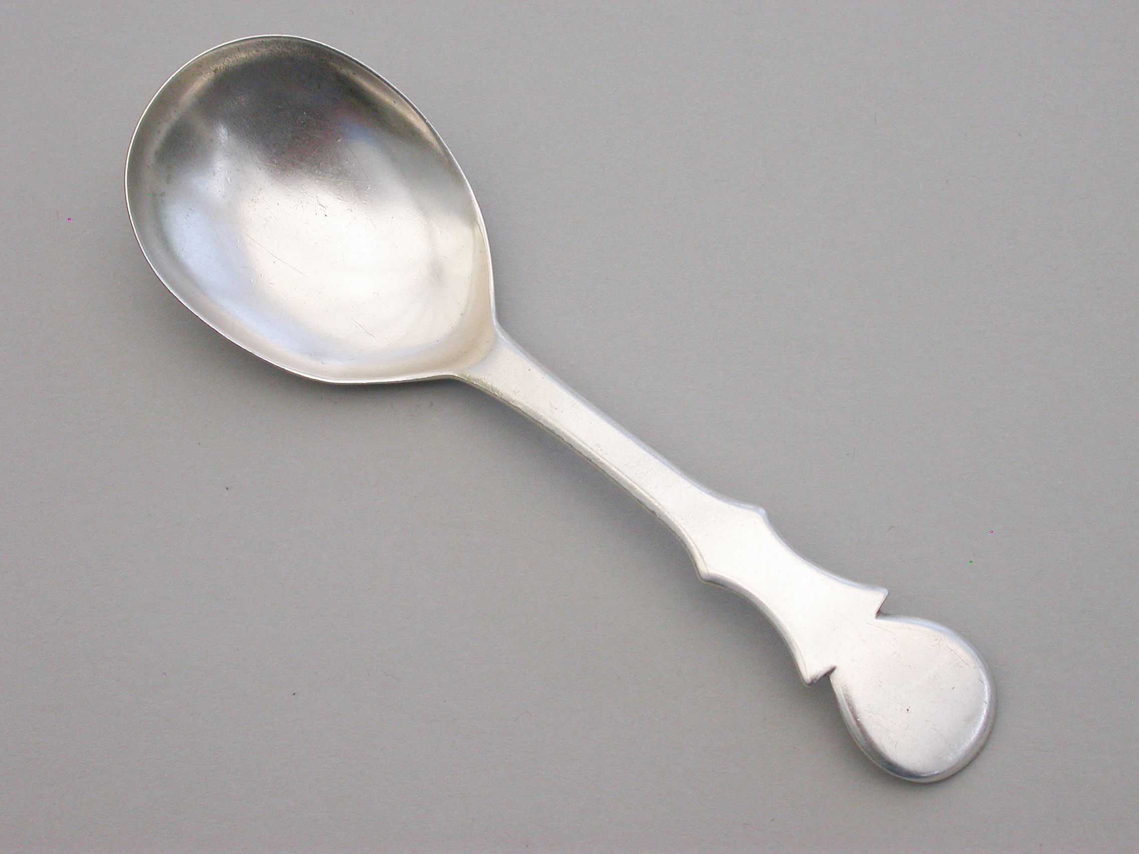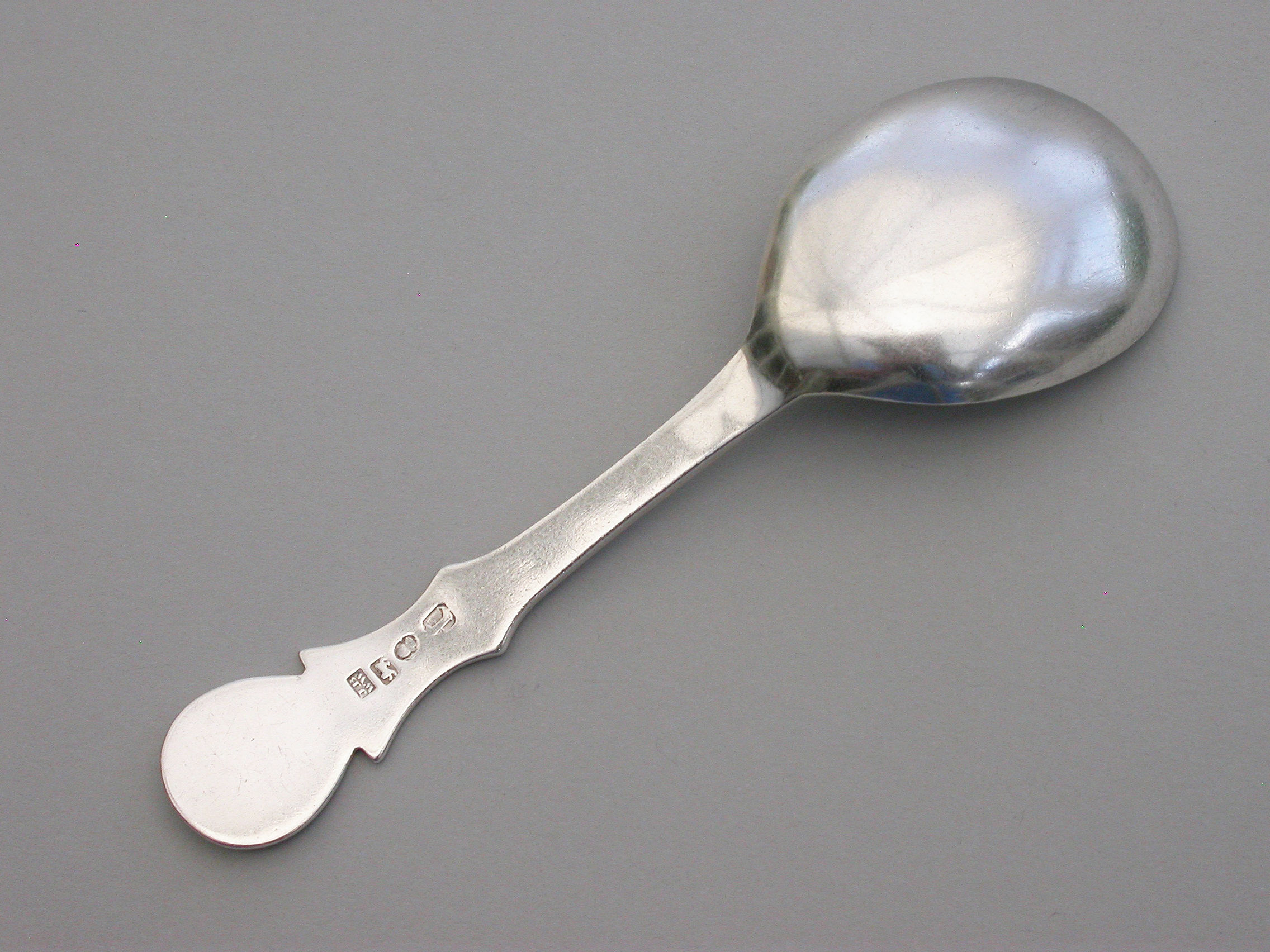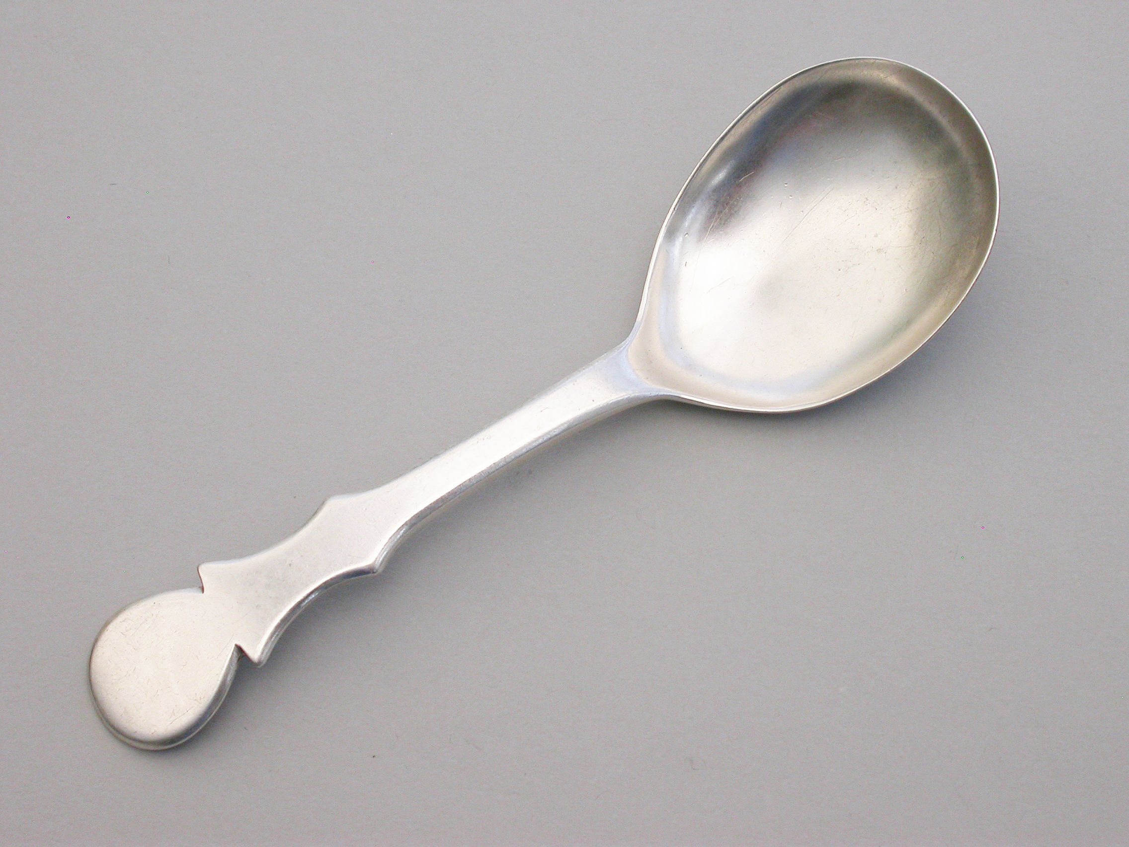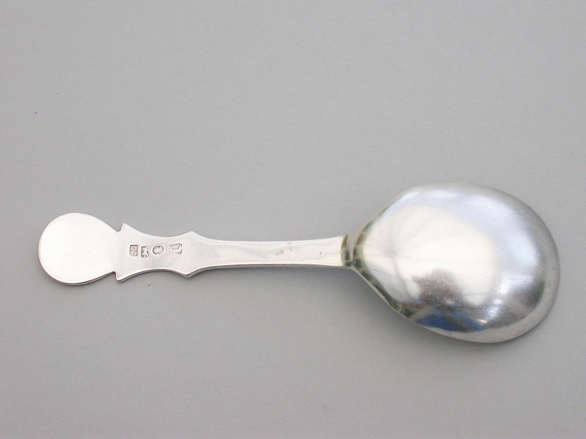 An extremely rare George III Provincial silver Caddy Spoon with plain pear shaped bowl and cut-out shaped handle.