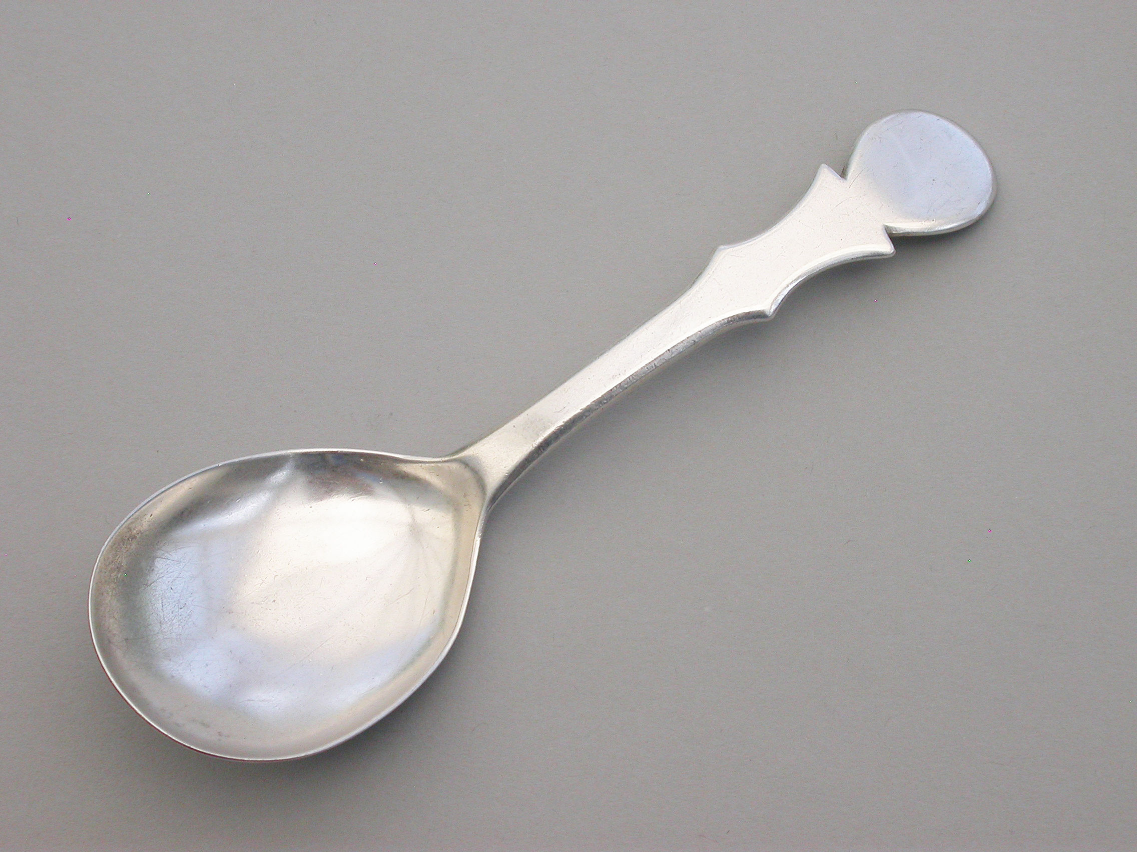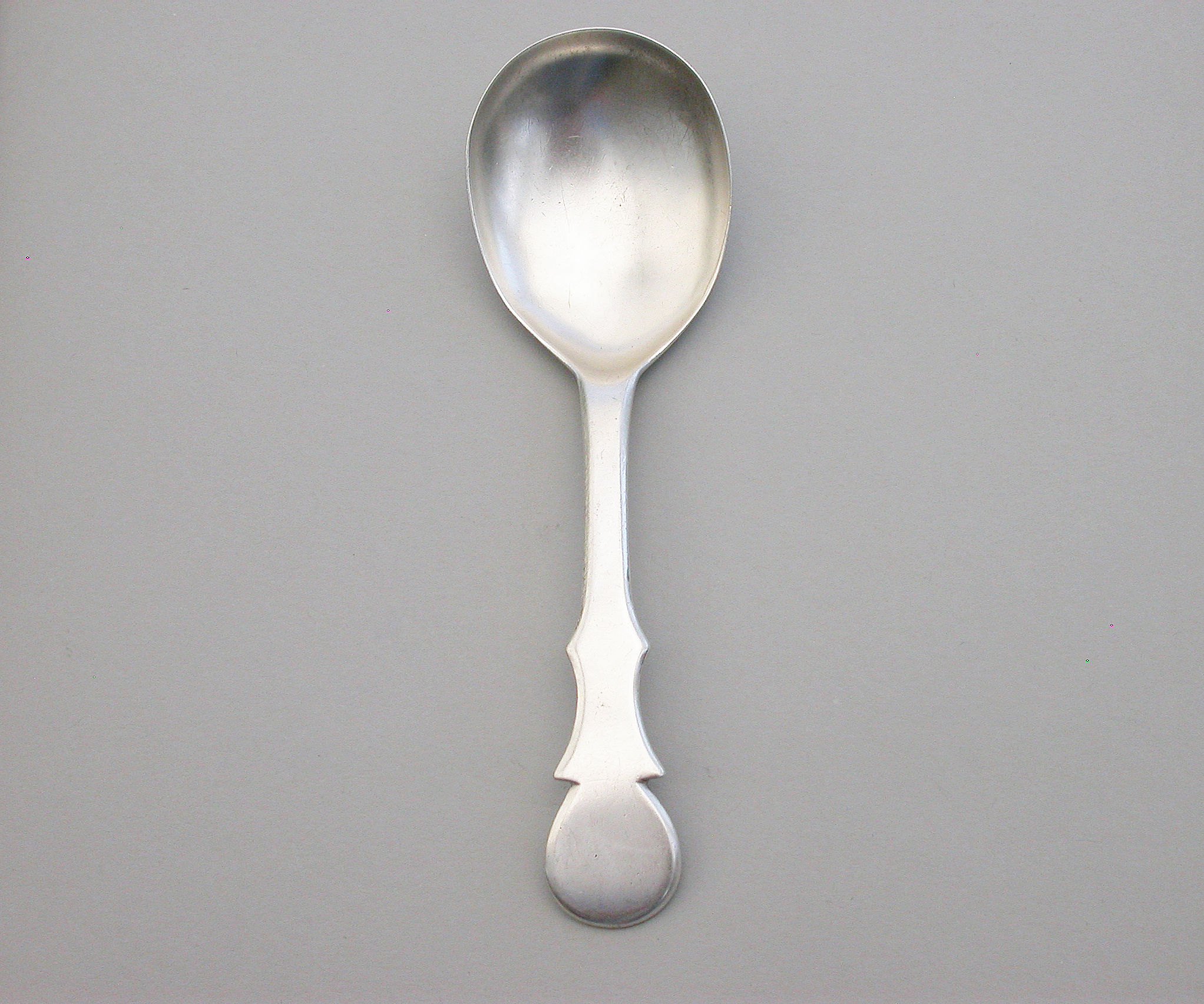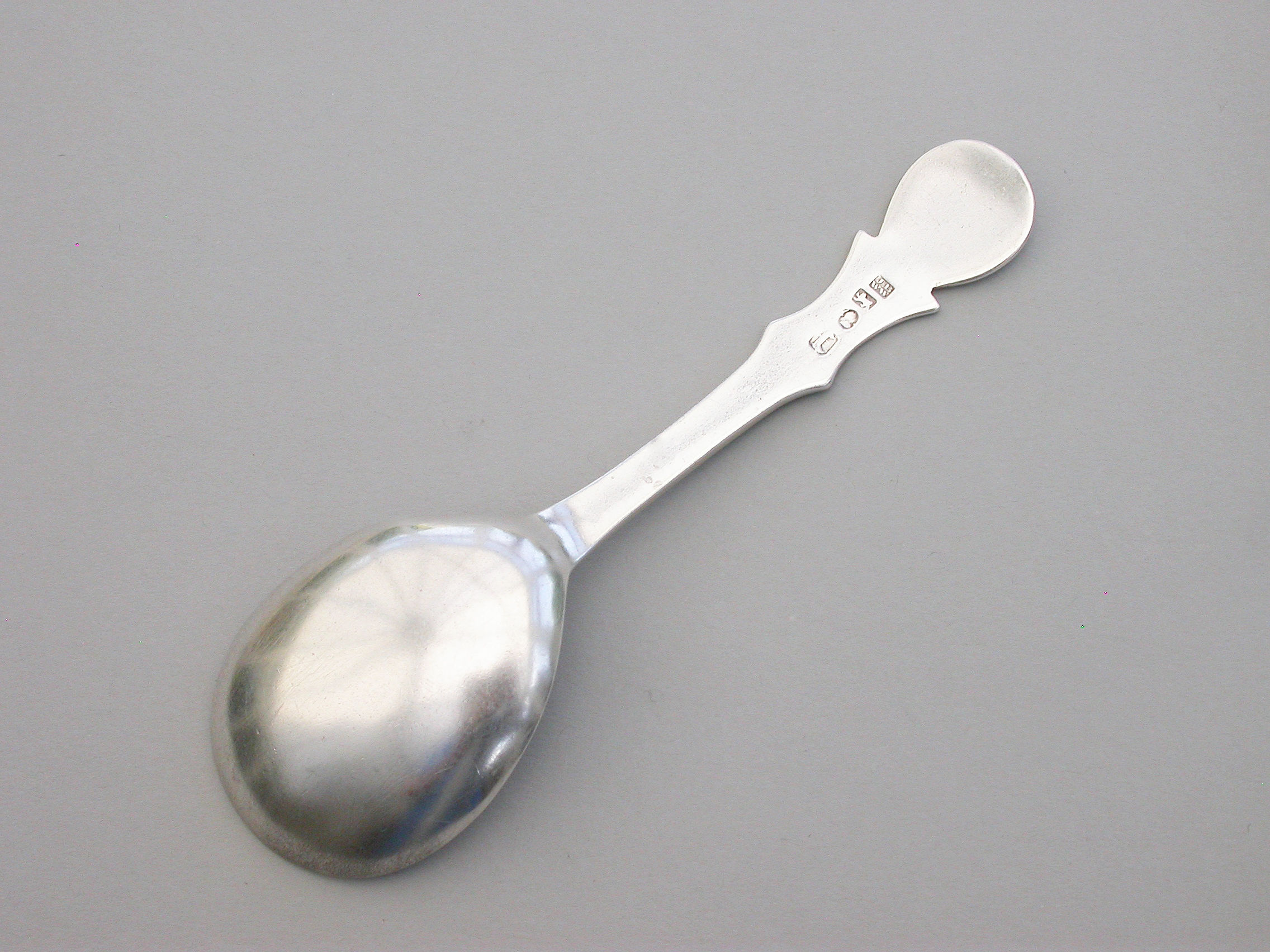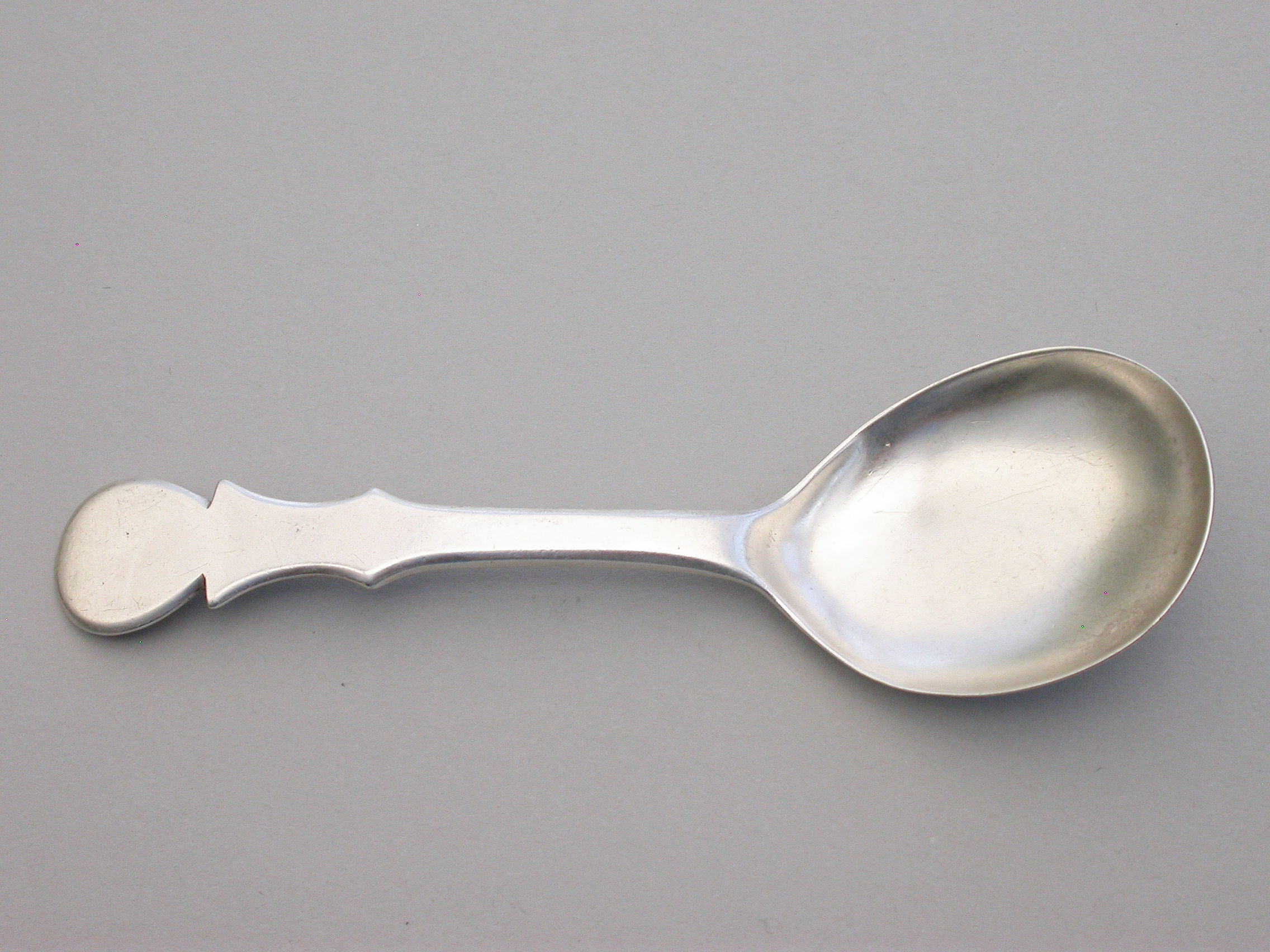An extremely rare George III Provincial silver Caddy Spoon with plain pear shaped bowl and cut-out shaped handle.