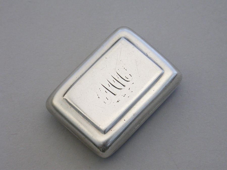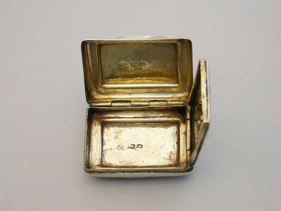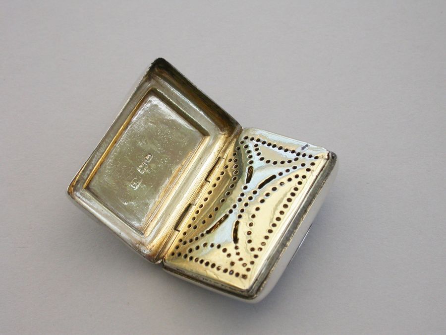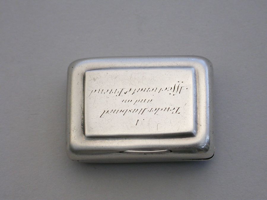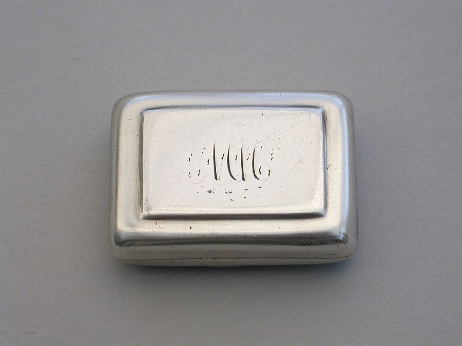 An extremely rare George III Provincial silver Vinaigrette of plain rounded rectangular form with raised panels to the lid and base, the cover inscribed with contemporary initials 'MM', the base inscribed - ""A tender husband and an affectionate friend"". The silver gilt grille with a pattern of pierced holes.