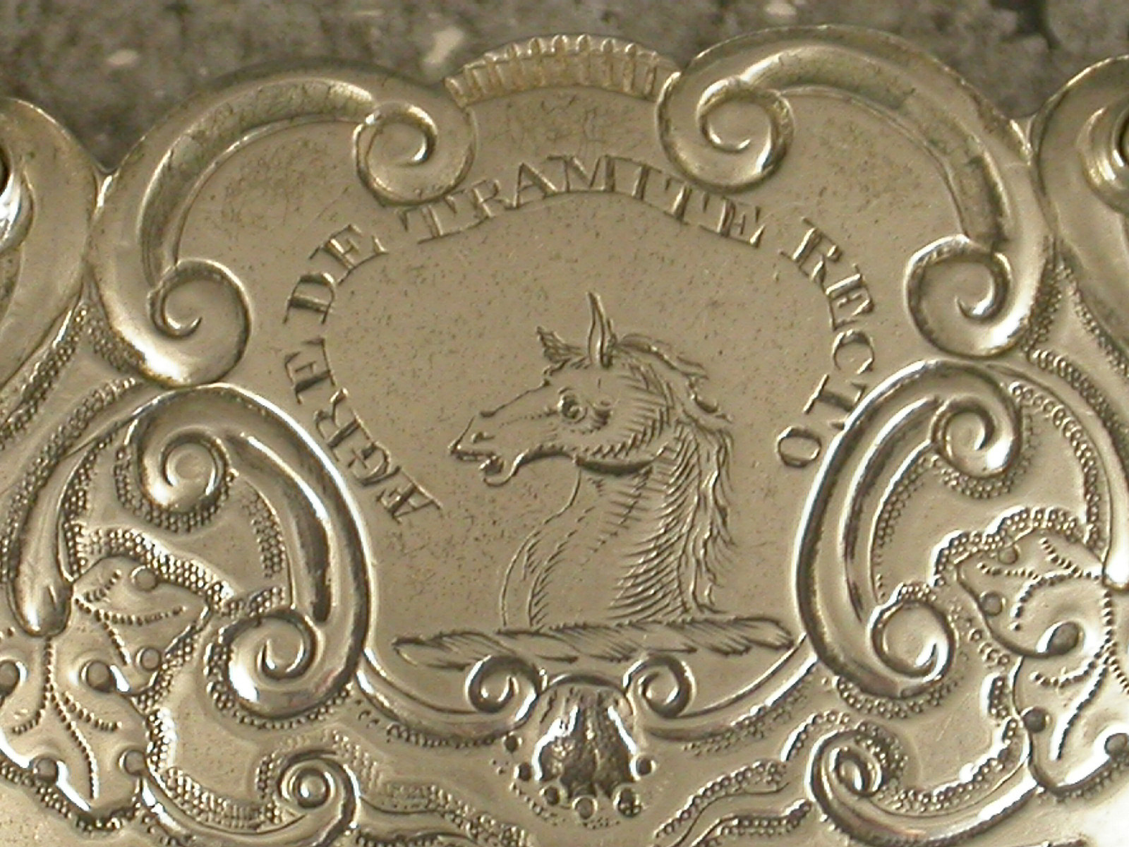 An extremely rare George III Scottish silver Wine Label of large shaped escutcheon form, chased with fruiting vines and scrolls, a shell below and above an incorporated shield engraved with the crest and motto of the Horseburgh or Horsburgh family of Scotland.