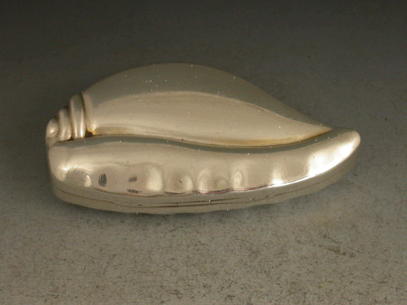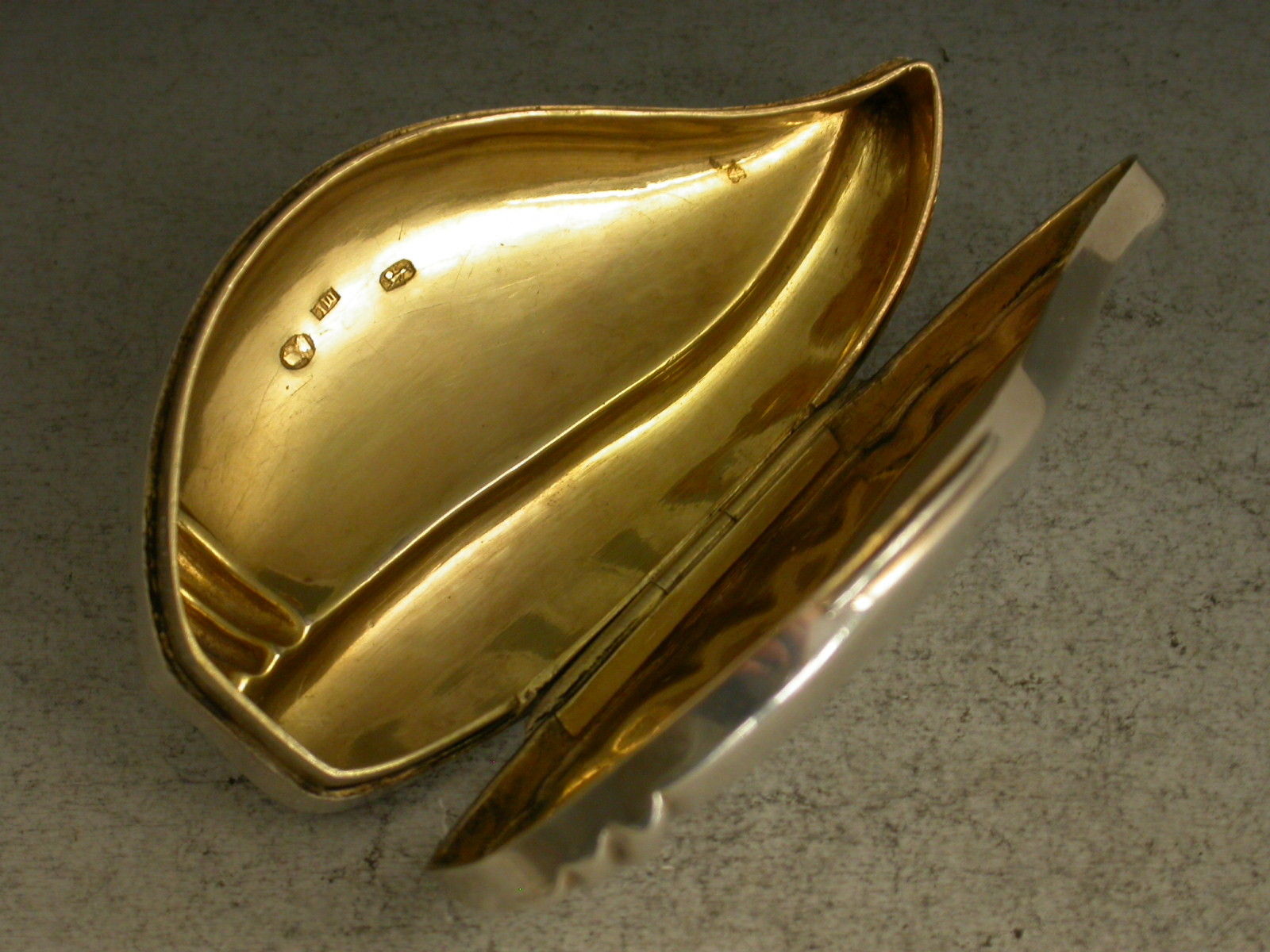 A very rare and unusual George III silver Snuff Box made in the form of a double sided Conch Shell, the central hinged lid opening to reveal a silver gilt interior.