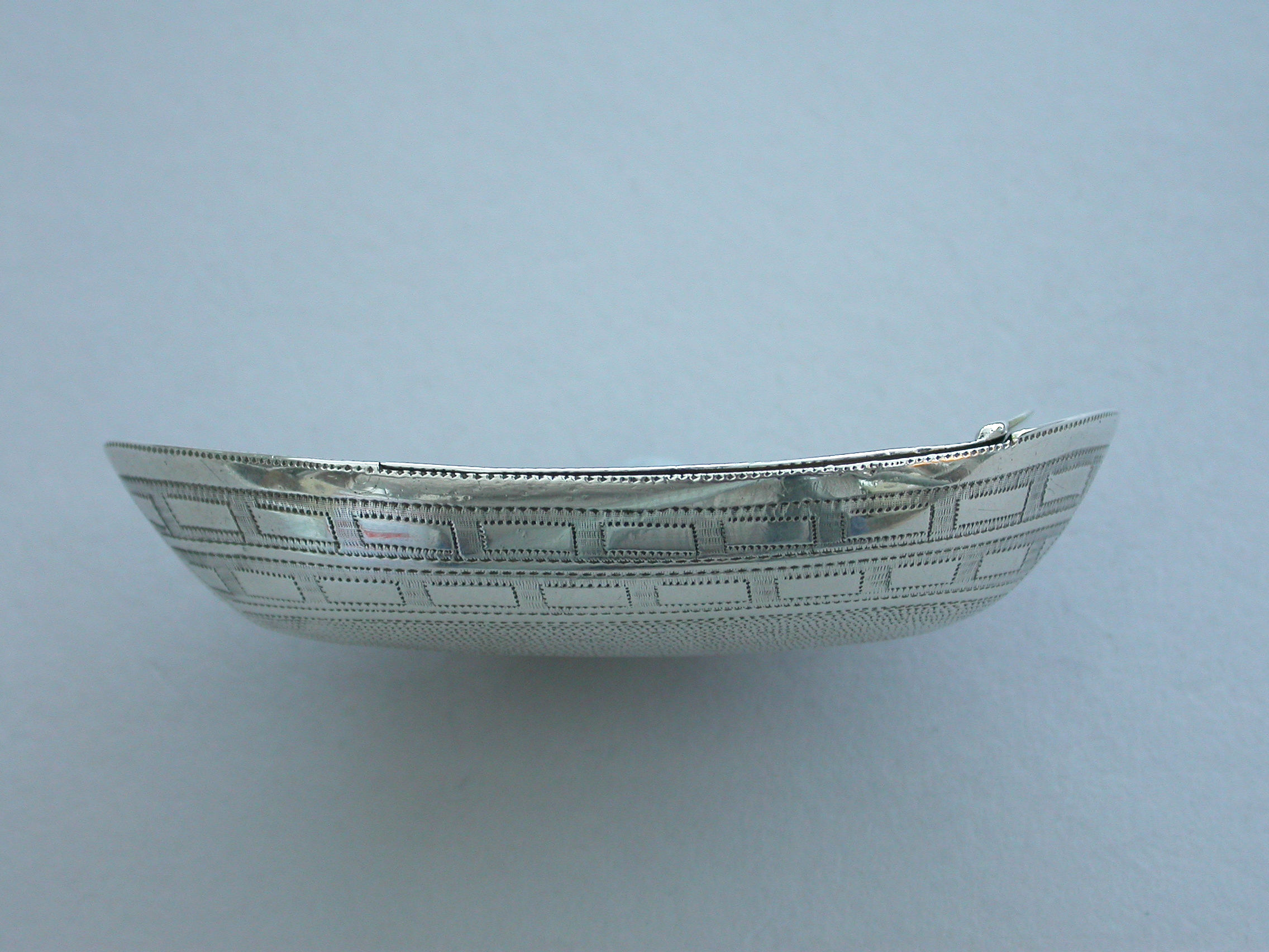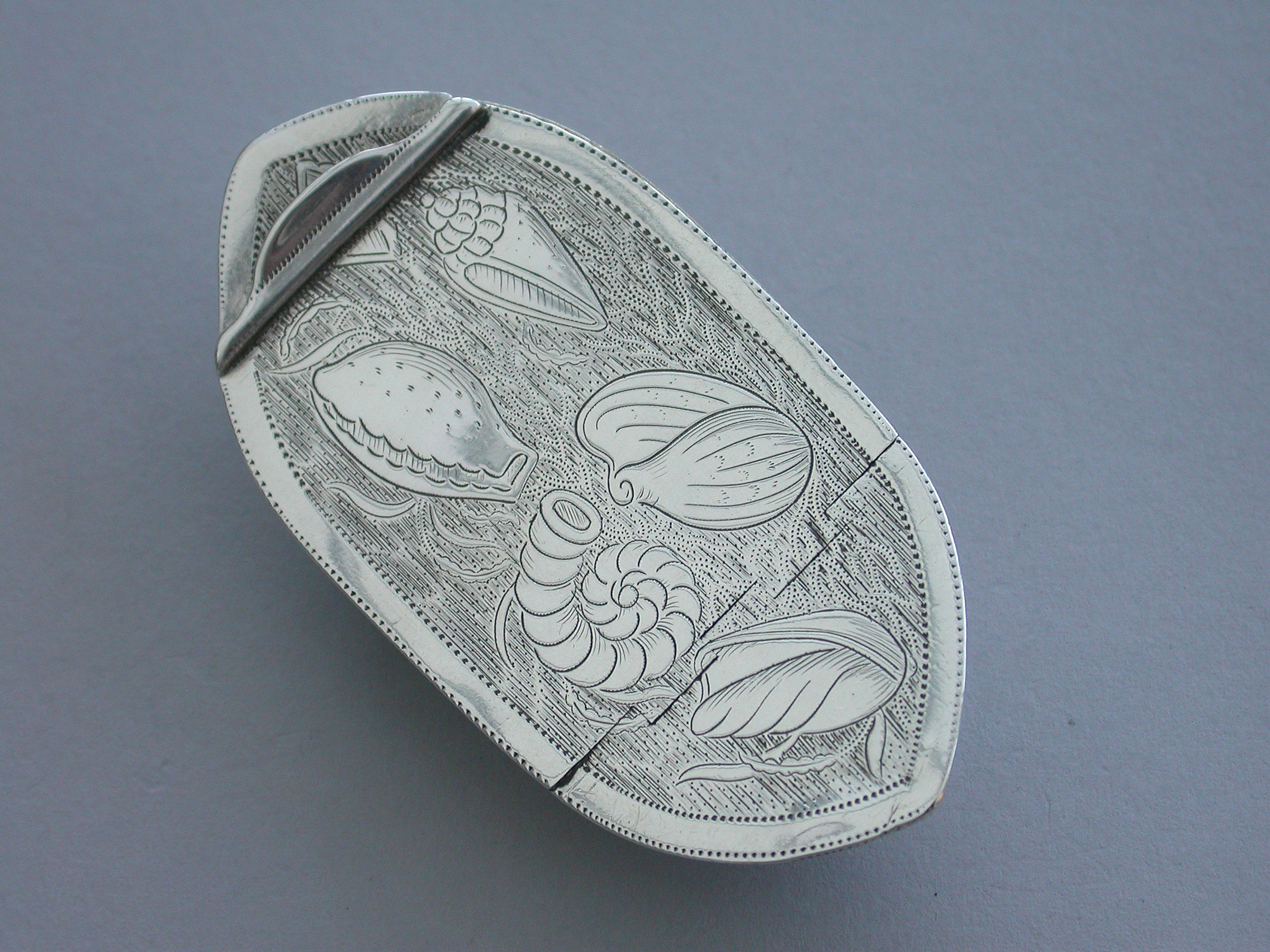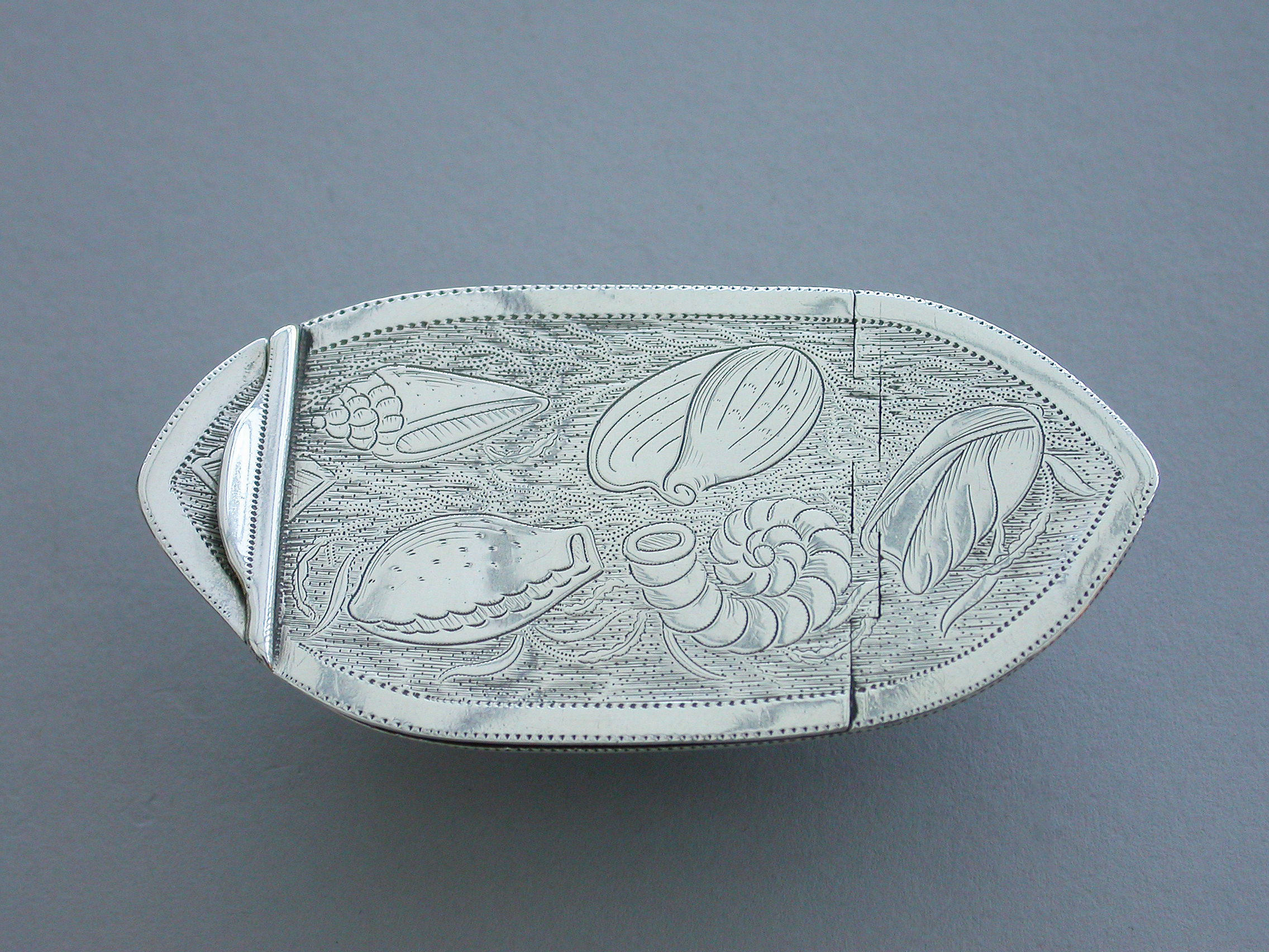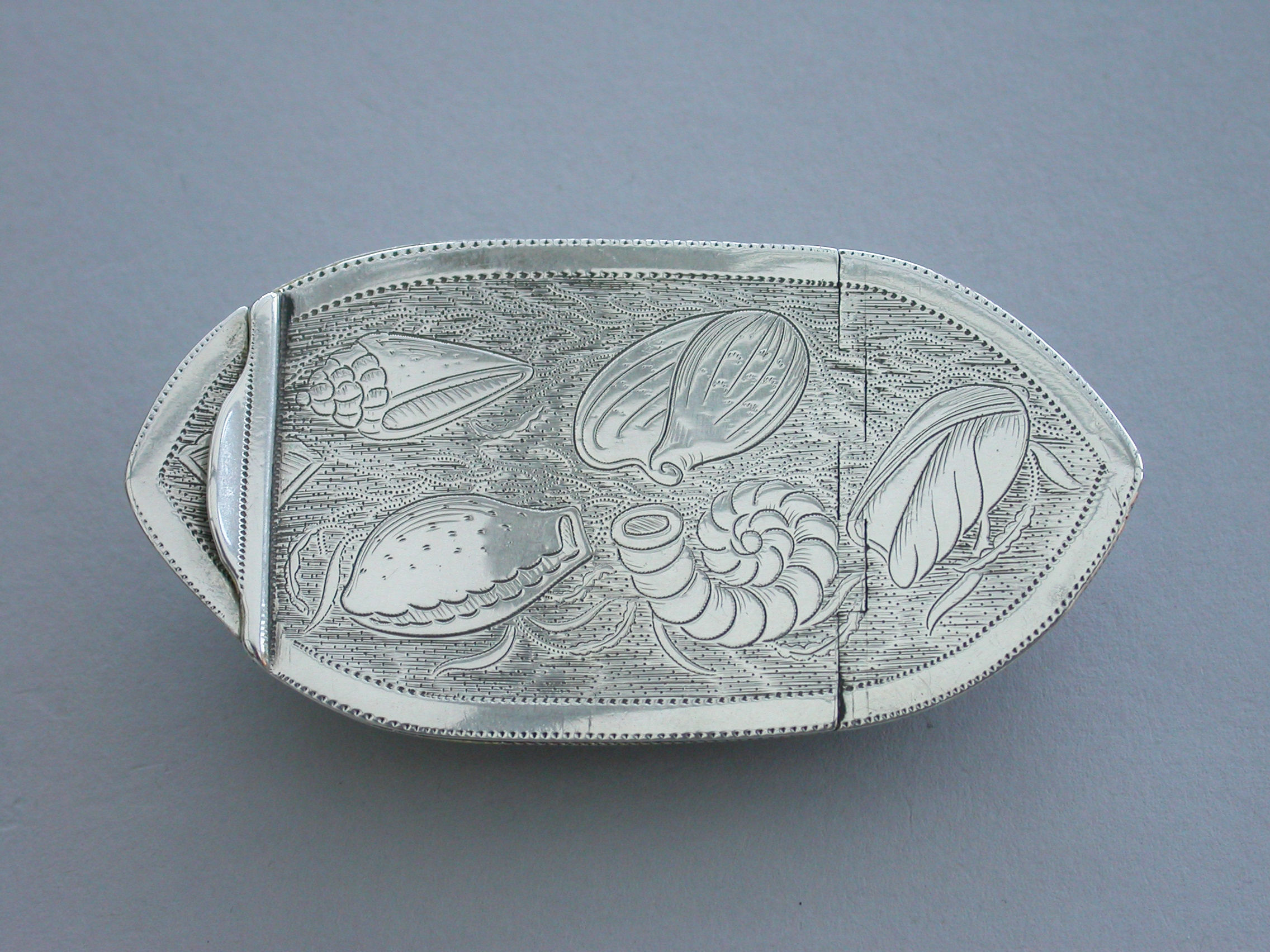 An extremely rare George III silver Snuff Box made in the form of a Skiff, with prick-dot engraved work to the base to simulate a clinker-built hull, the cover with bright-cut and prick-dot engraved decoration depicting various sea shells.