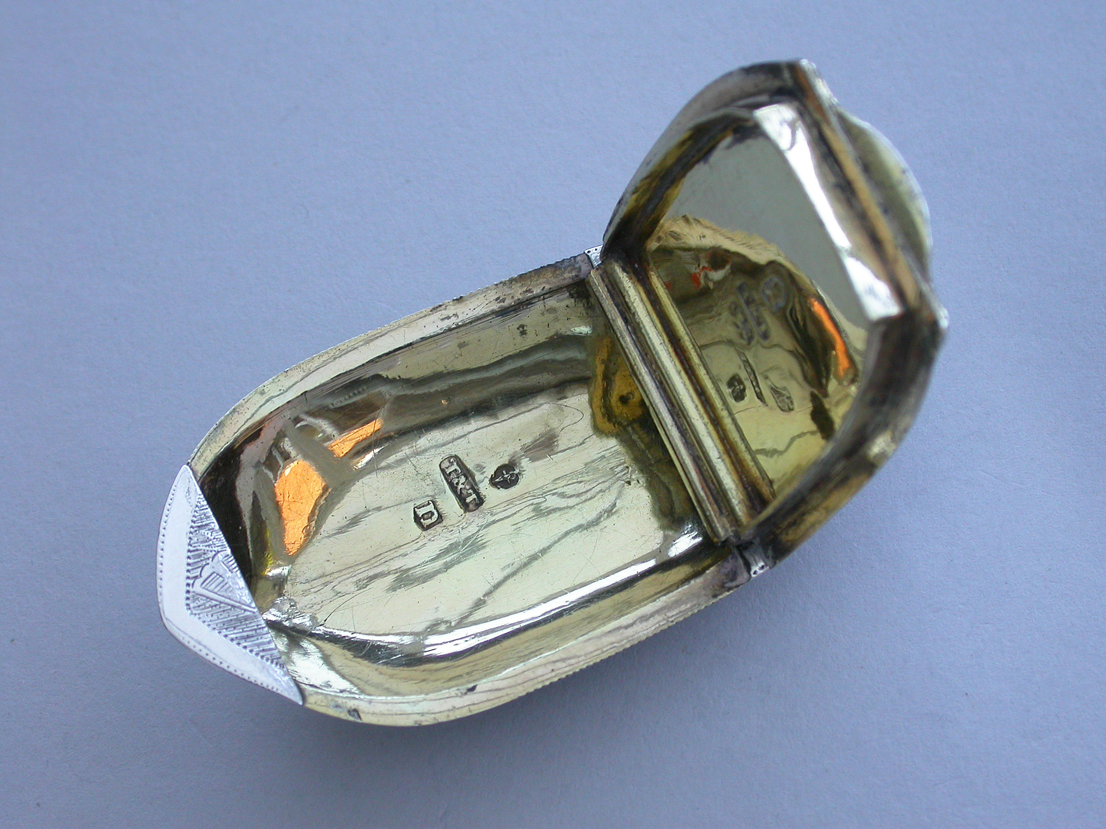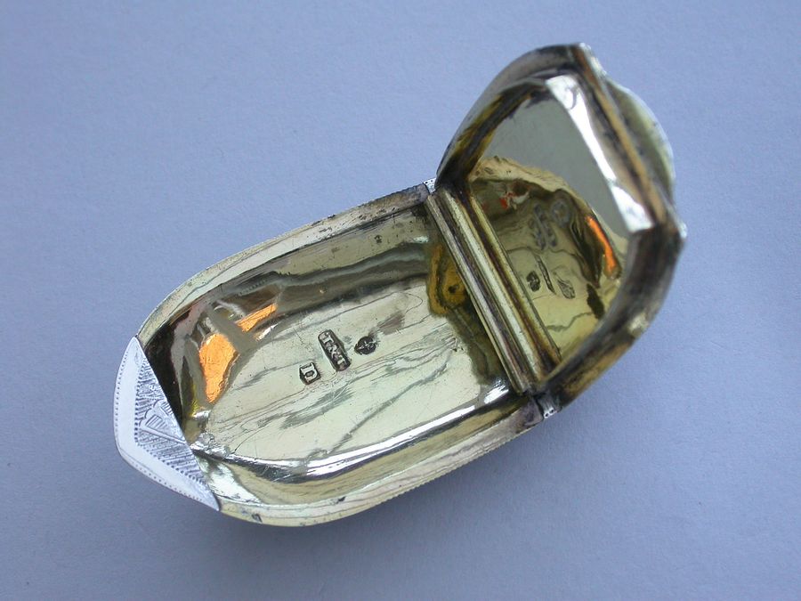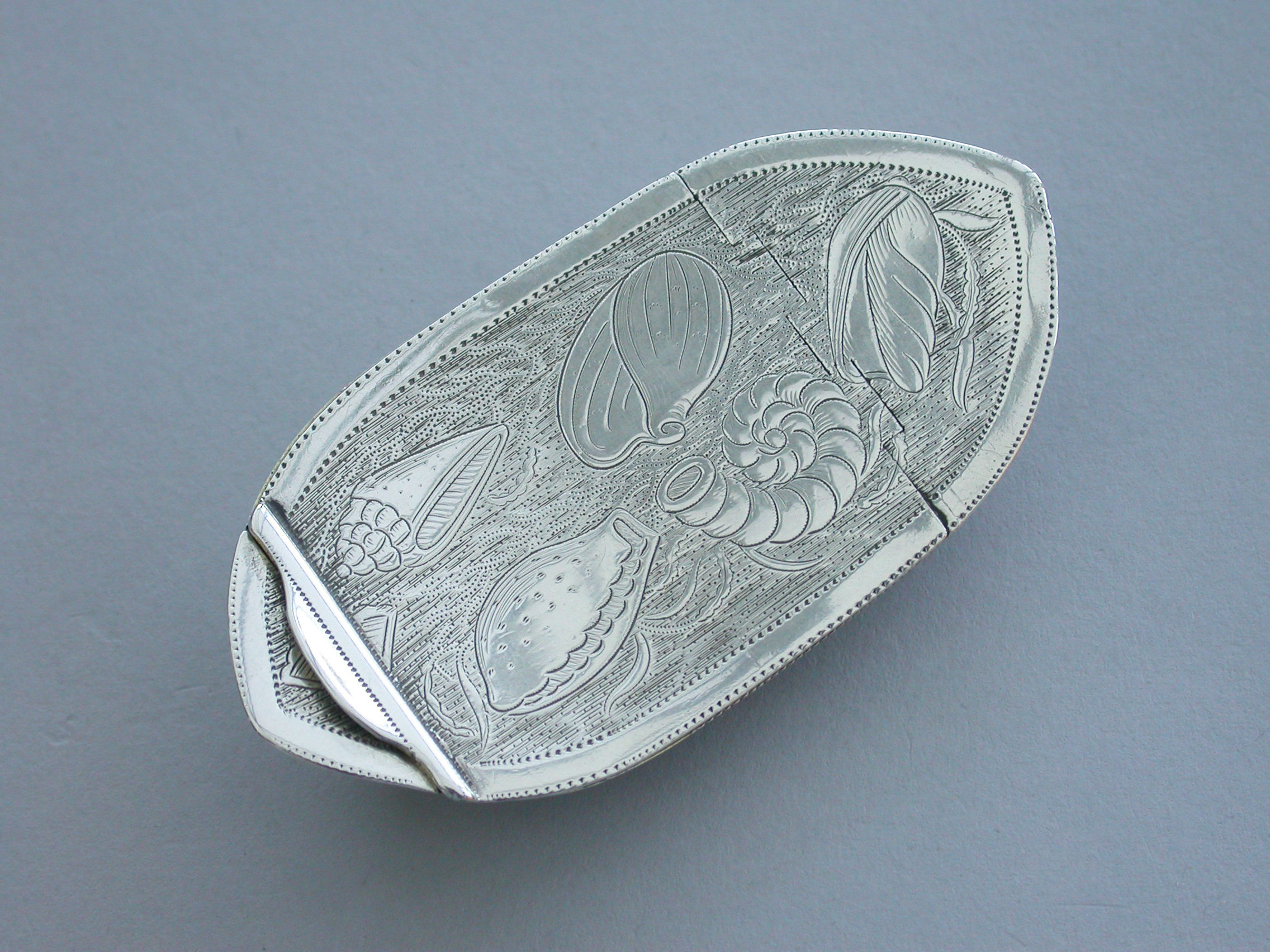 An extremely rare George III silver Snuff Box made in the form of a Skiff, with prick-dot engraved work to the base to simulate a clinker-built hull, the cover with bright-cut and prick-dot engraved decoration depicting various sea shells.