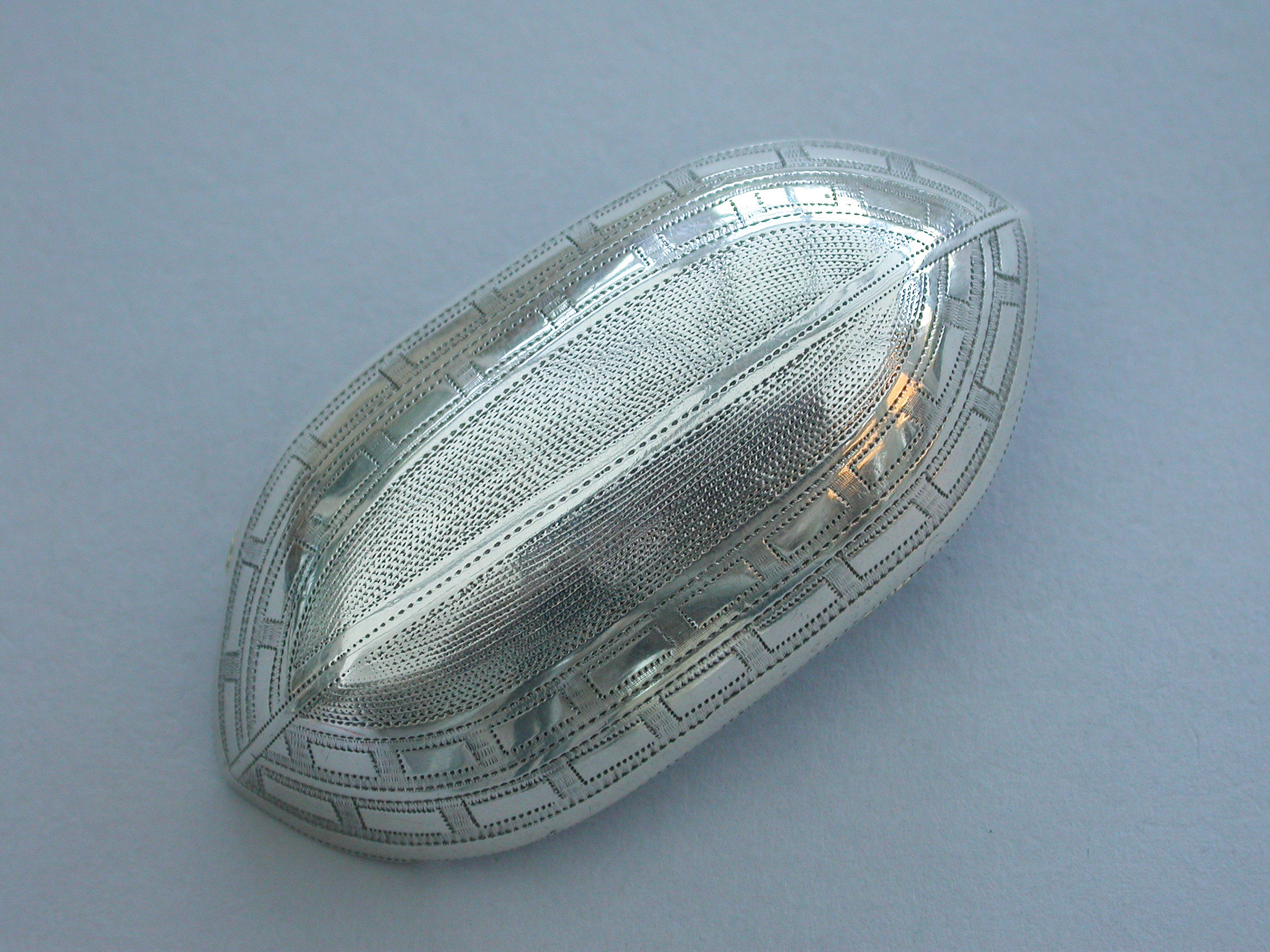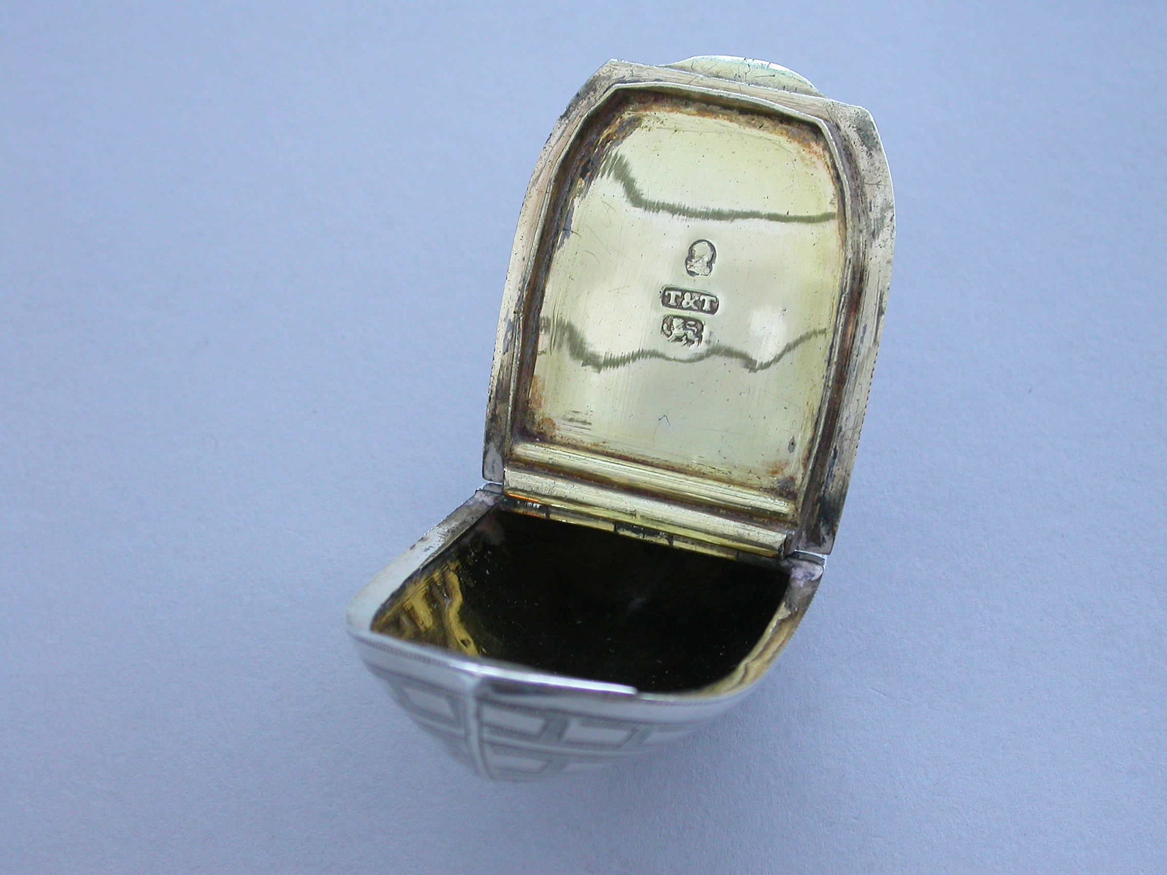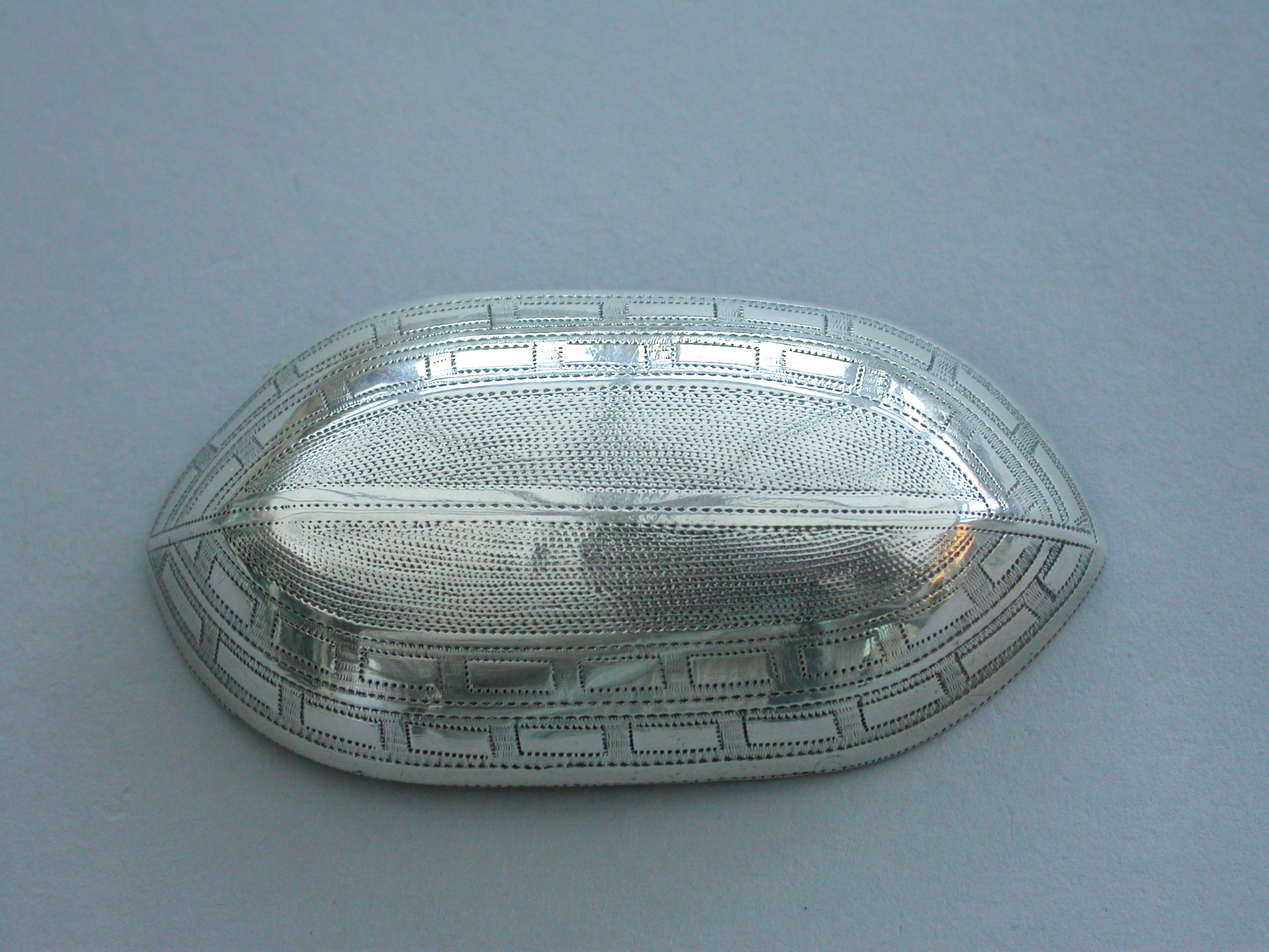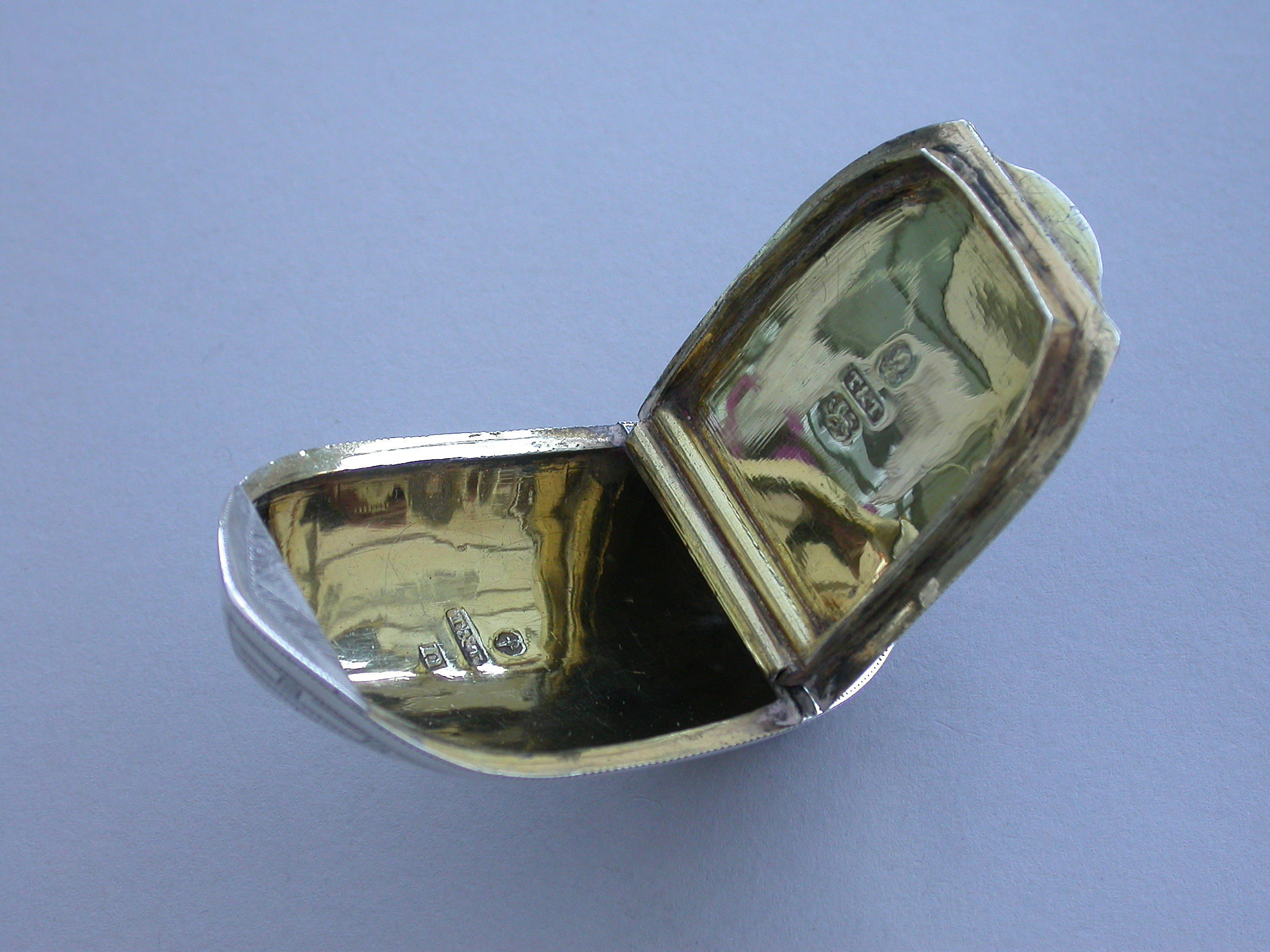 An extremely rare George III silver Snuff Box made in the form of a Skiff, with prick-dot engraved work to the base to simulate a clinker-built hull, the cover with bright-cut and prick-dot engraved decoration depicting various sea shells.