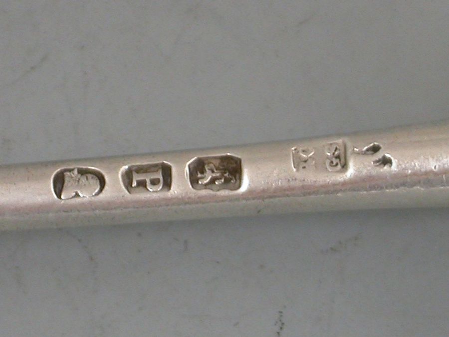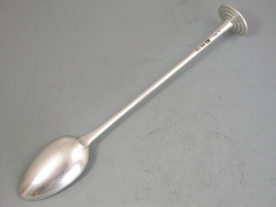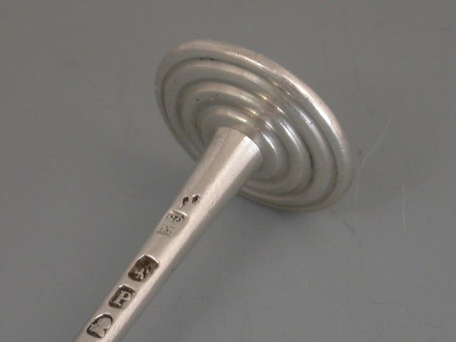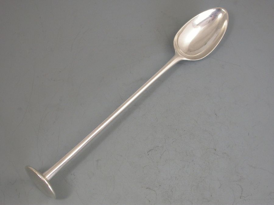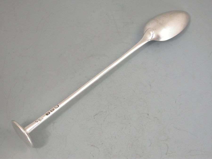 A rare George III silver Sugar Crusher with heavy flat circular crusher and teaspoon shaped bowl.