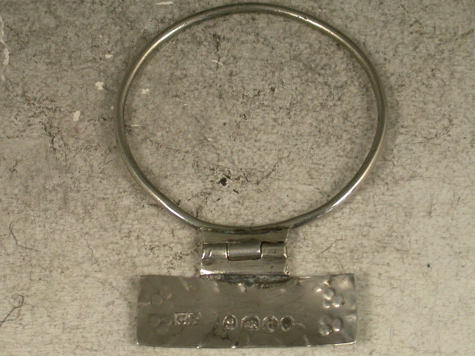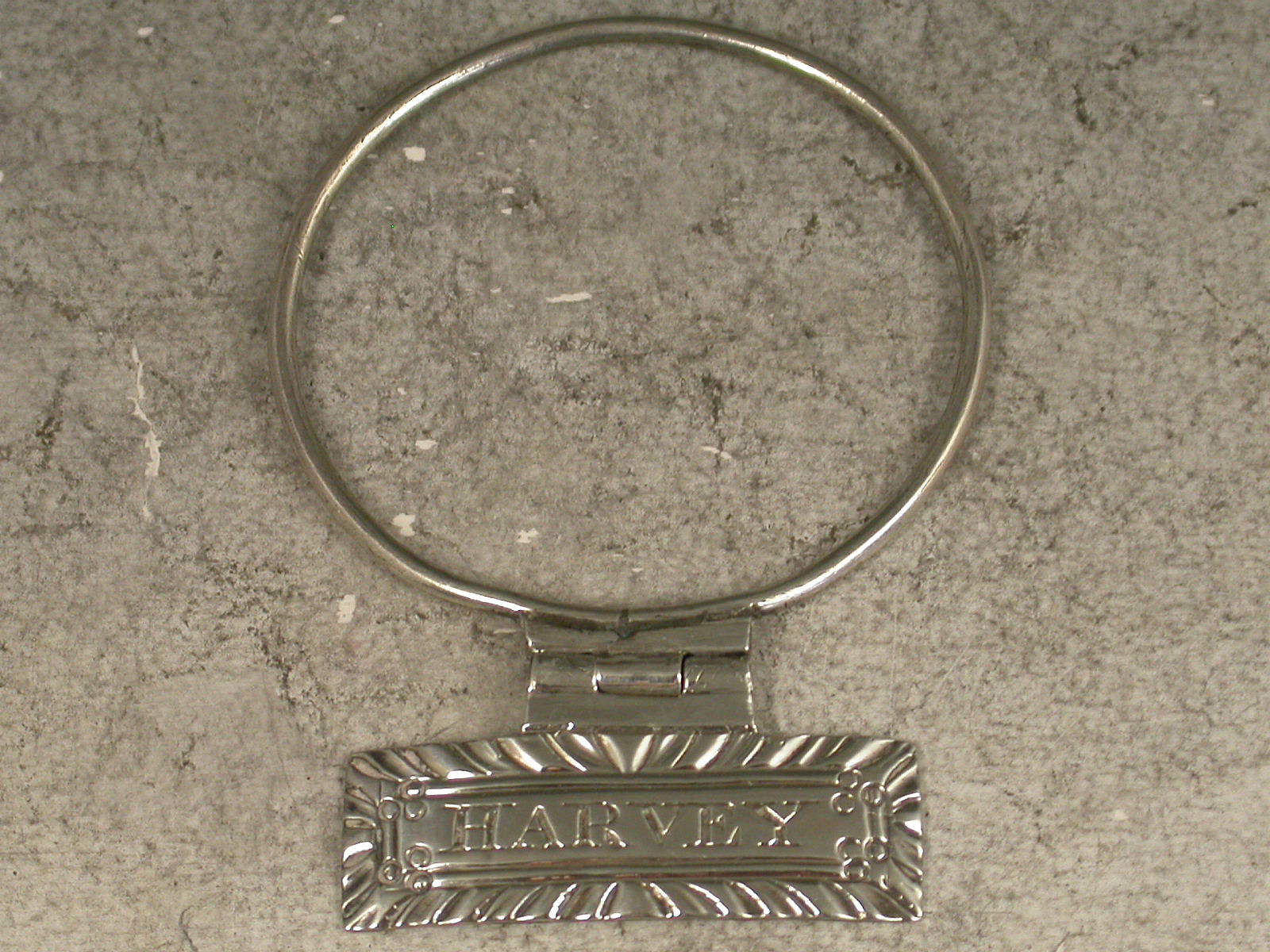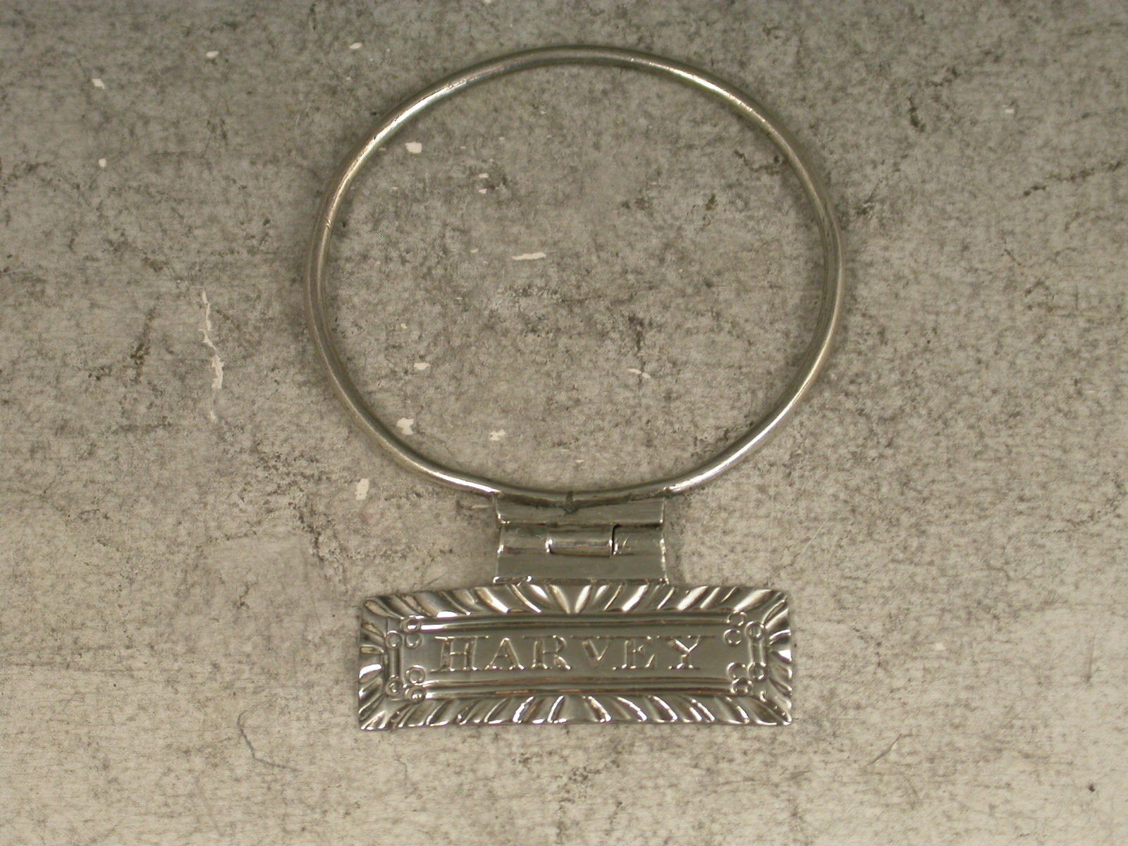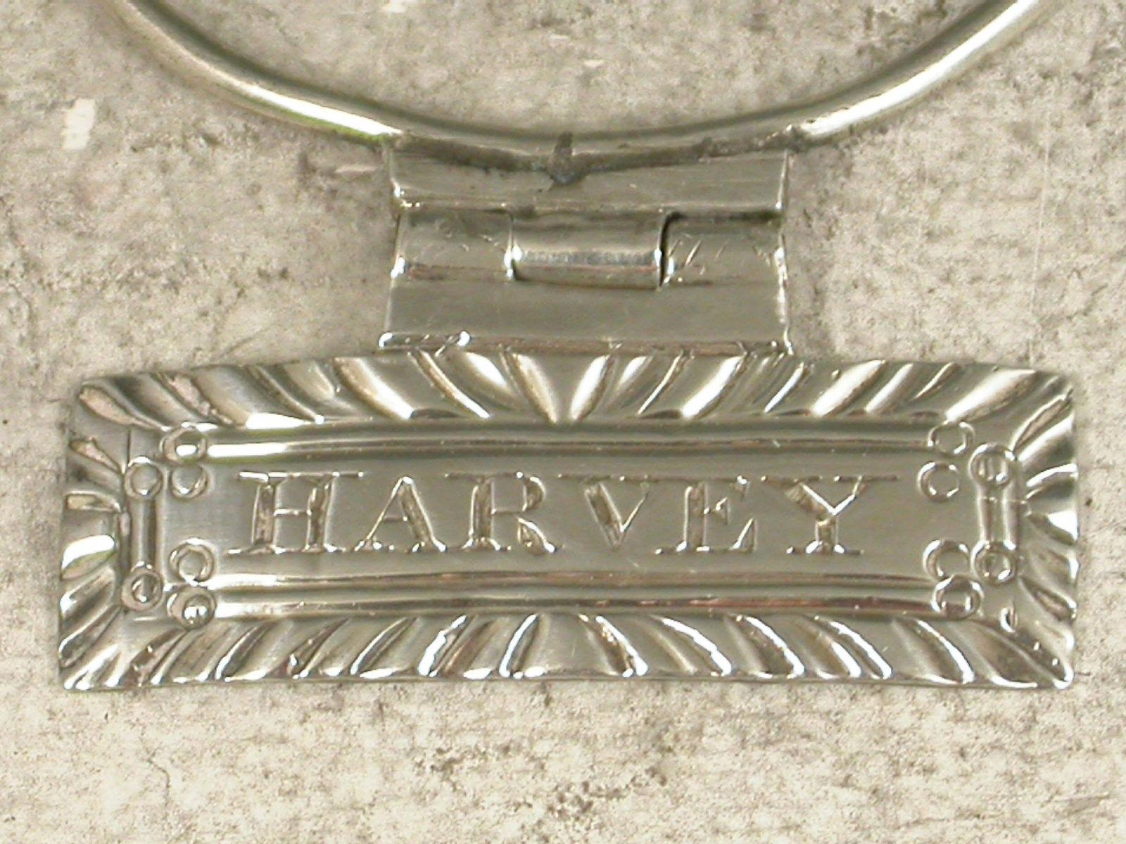 A rare Goerge IV silver Sauce Label of narrow rectangular form with gadrooned border, incised for Harvey, suspended by a hinge to a circular solid silver wire neck ring.
