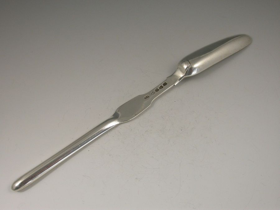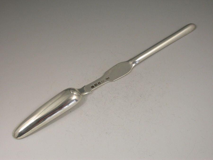 A rare George IV silver Marrow Scoop with two standard bowls, the unusual fiddle and shell pattern stem engraved with a crest of an arm in armour holding a star.