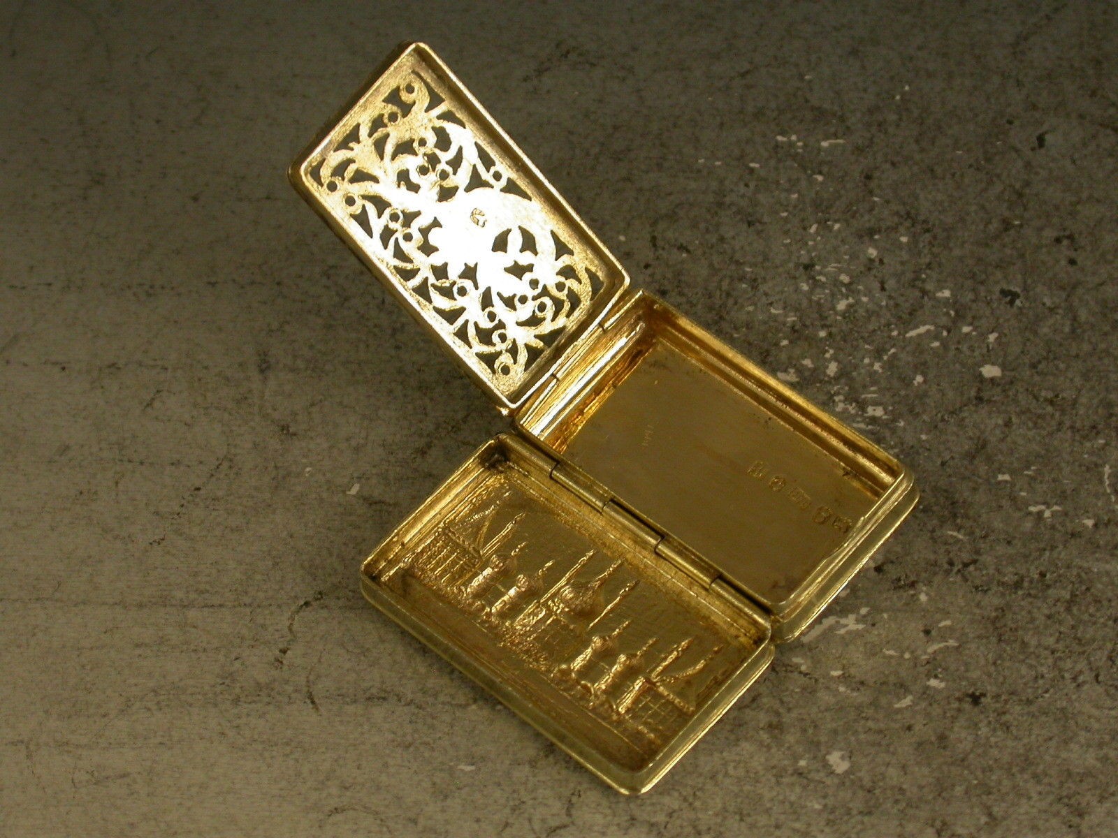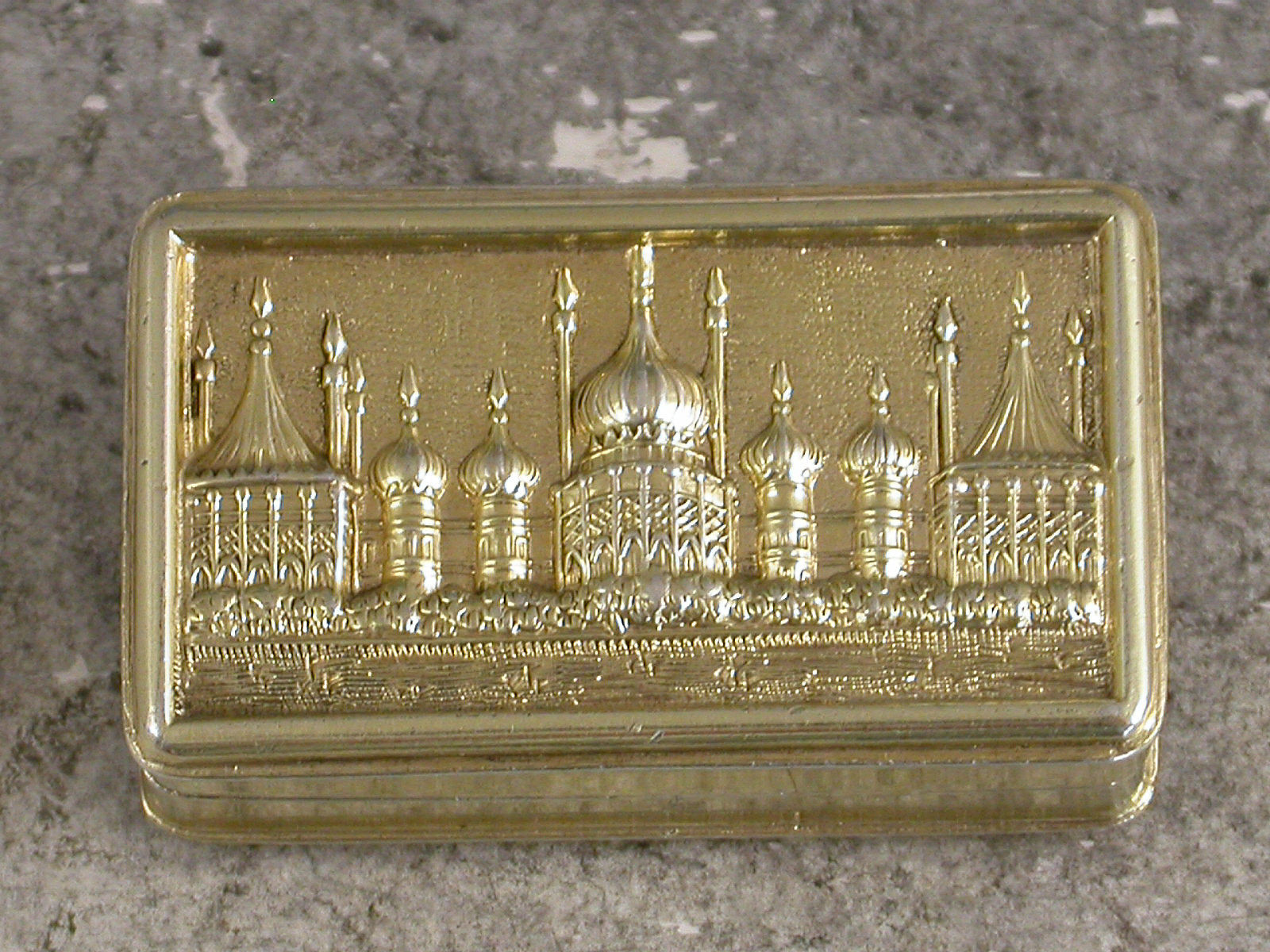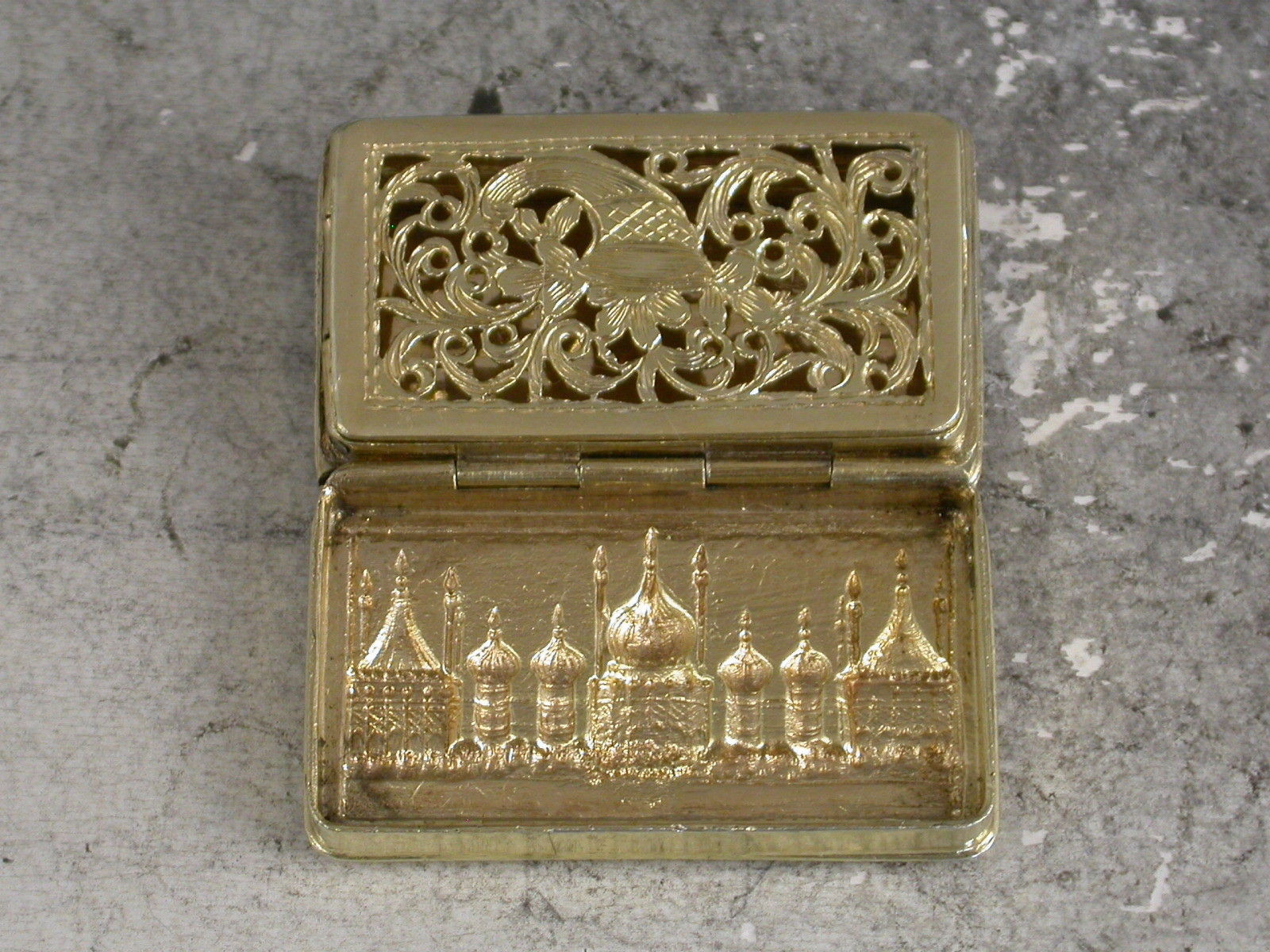 An extremely rare George IV silver gilt 'Castle Top' Vinaigrette of narrow rectangular form with engine turned decoration to the base and plain sides, the lid with die-stamped low relief view of The Royal Pavilion, Brighton. The silver gilt interior with intricately pierced foliate scroll grille including a cornucopia.