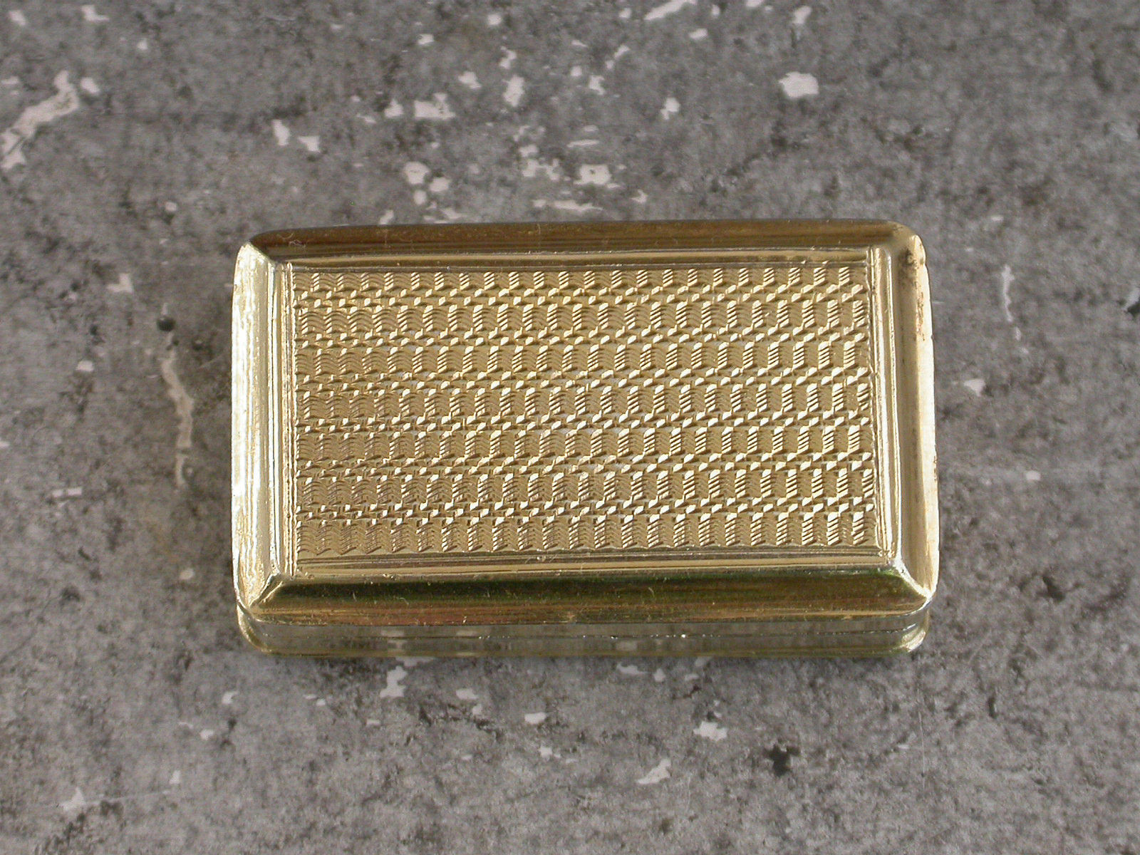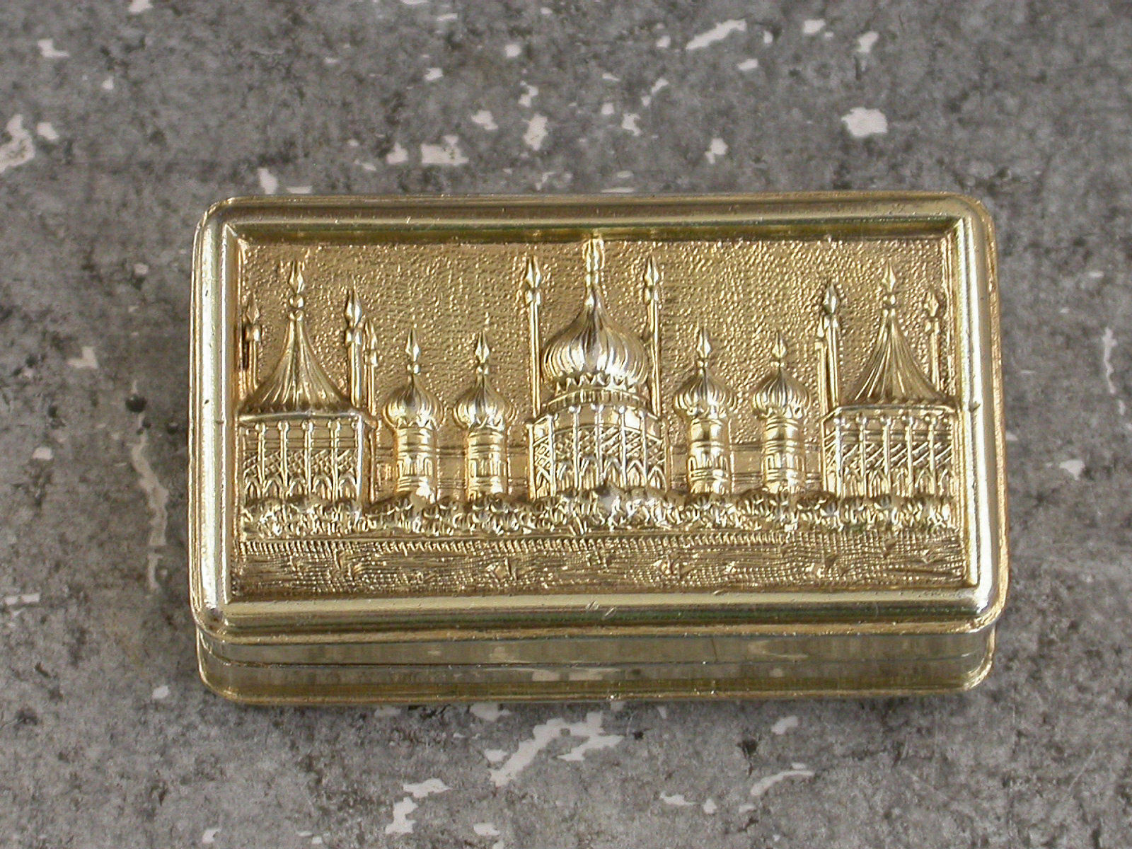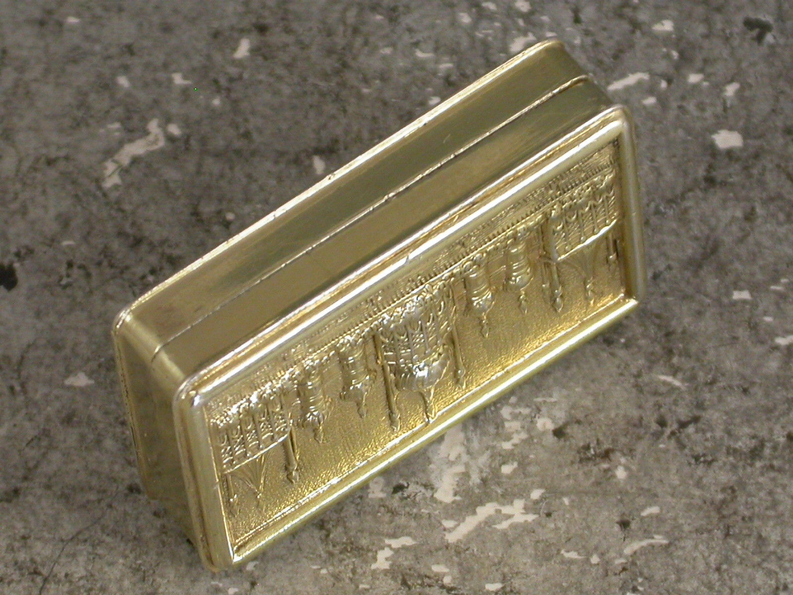 An extremely rare George IV silver gilt 'Castle Top' Vinaigrette of narrow rectangular form with engine turned decoration to the base and plain sides, the lid with die-stamped low relief view of The Royal Pavilion, Brighton. The silver gilt interior with intricately pierced foliate scroll grille including a cornucopia.