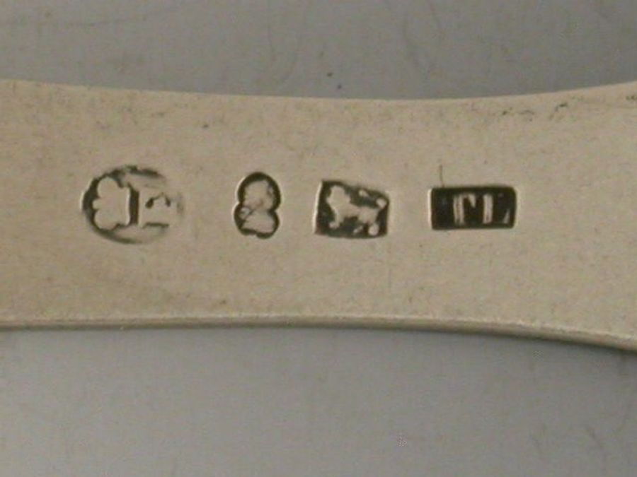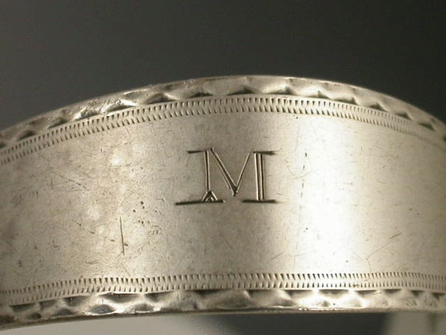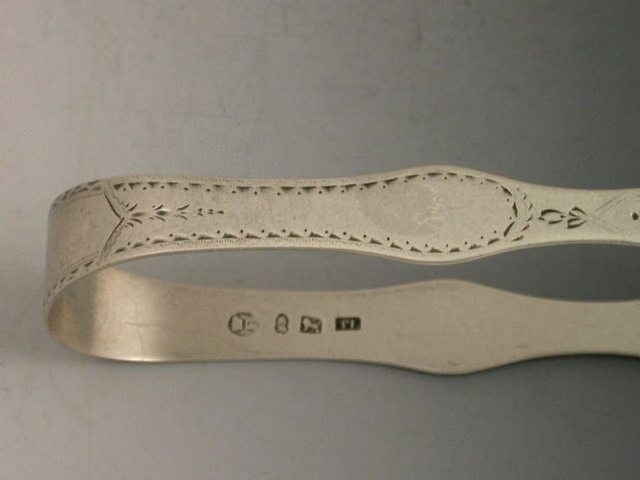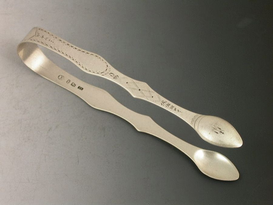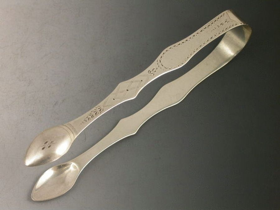 A rare pair of Georgian Provincial silver Sugar Tongs of large size with cut and shaped arms, bright cut engraved decoration. The bow engraved with initial M.