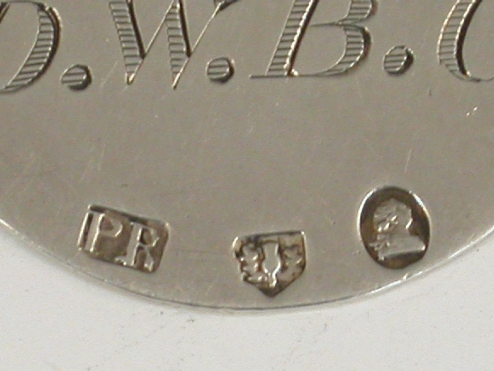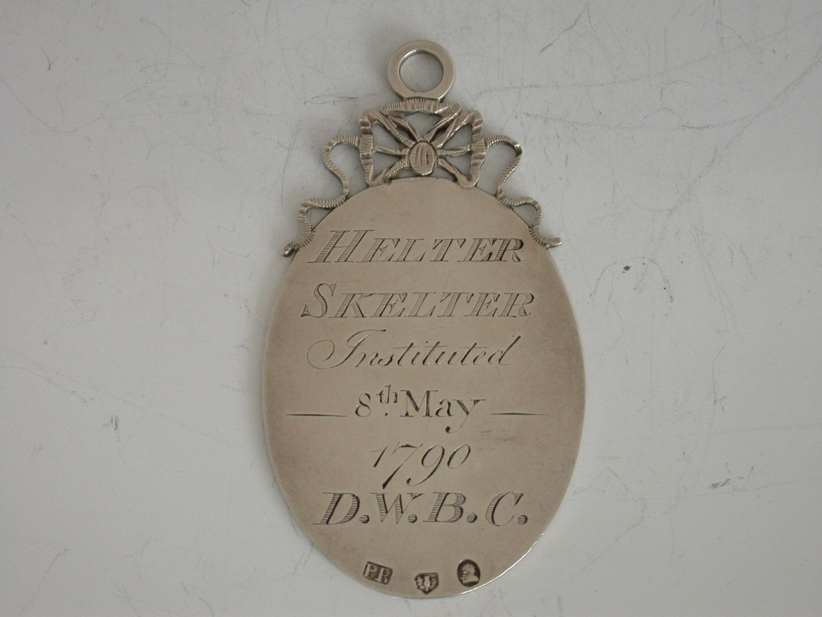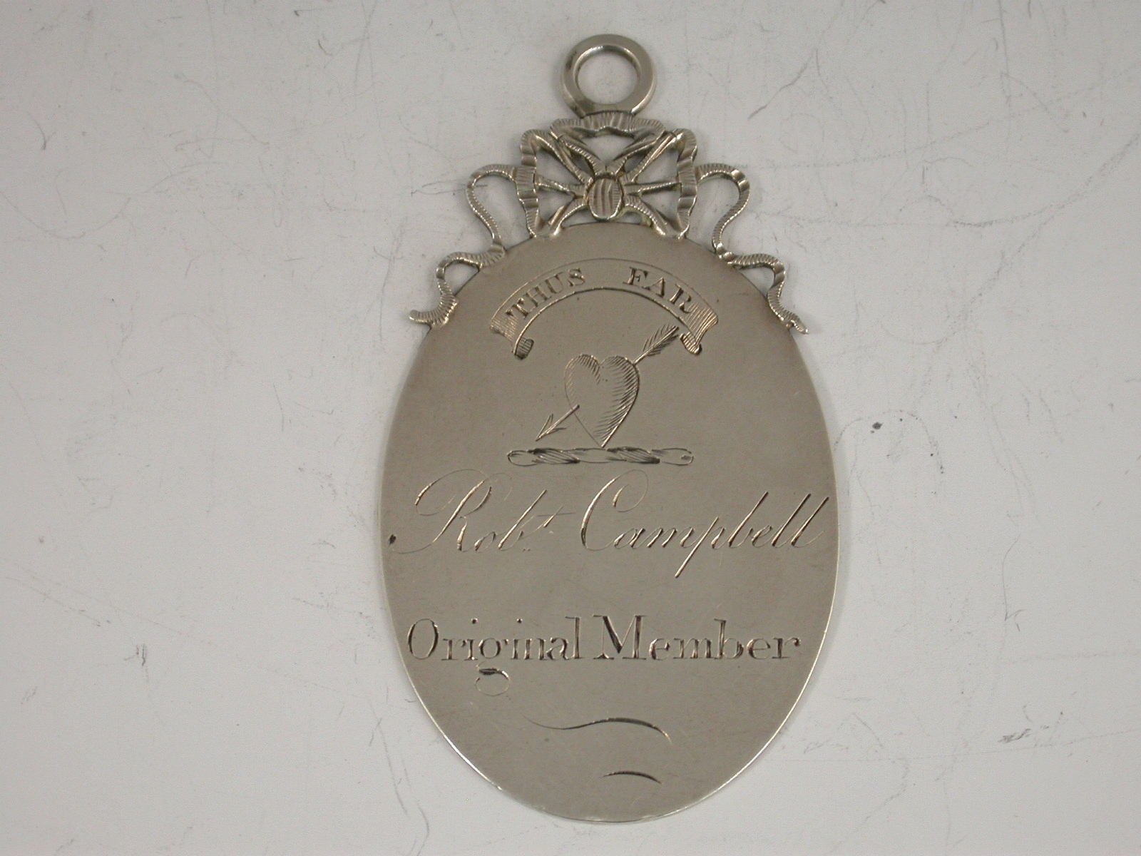 A rare Georgian Scottish silver Helter Skelter Club Badge of plain oval form with tied ribbon and ring surmount, the face engraved with a crest of a heart with an arrow through it below the motto ‘Thus Far’. To Robt Campbell Original Member. The reverse with the instituted date 8th May 1790 and the initials D.W.B.C.