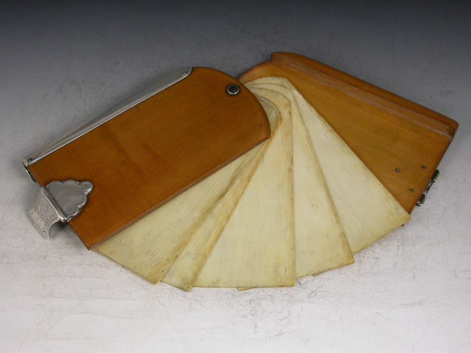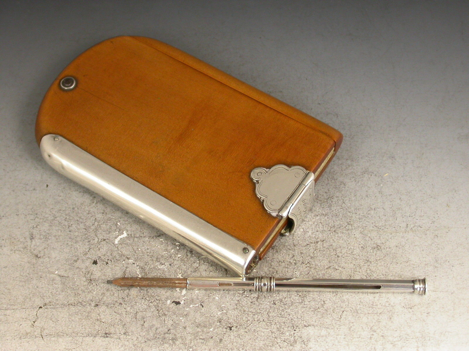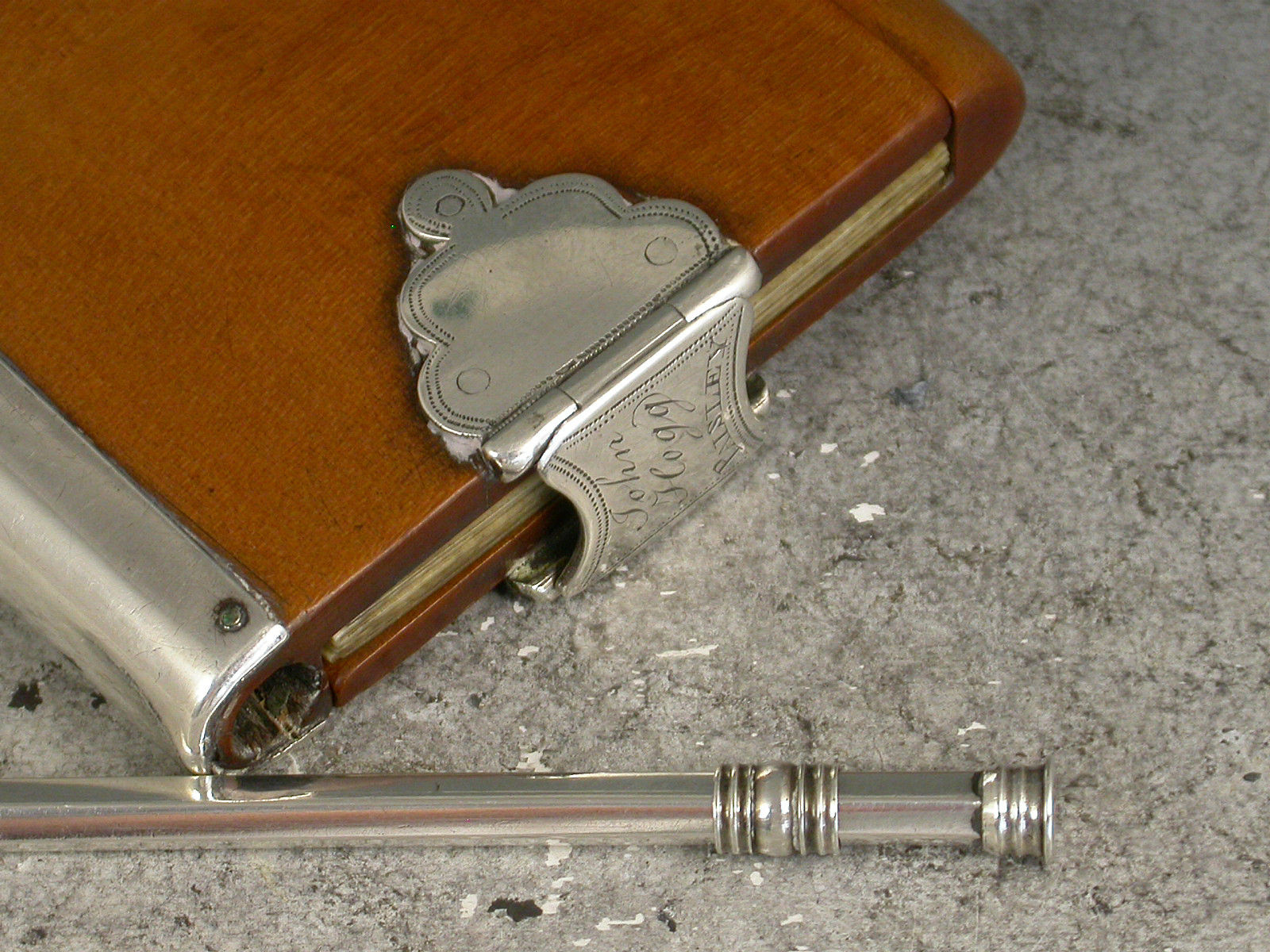 An extremely rare Georgian Scottish Provincial silver mounted sycamore wood and ivory Aide Memoire, the rounded rectangular covers swiveling open to reveal six ivory pages, the hinged silver clasp with scallop shaped mounts and engraved - ""James Hogg, Paisley"". The rounded edge with silver spine recessed to accept a contemporary hexagonal silver sliding pencil.