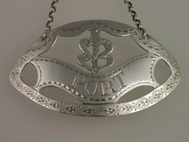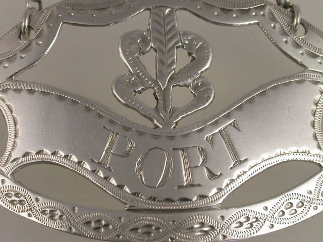 A superb 18th century Irish silver Wine Label of large pierced eye shape with fine bright-cut engraved decoration, the scrolled nameplate incised for PORT with a pierced arrow head design above. The reverse engraved with contemporary initials – W.M.