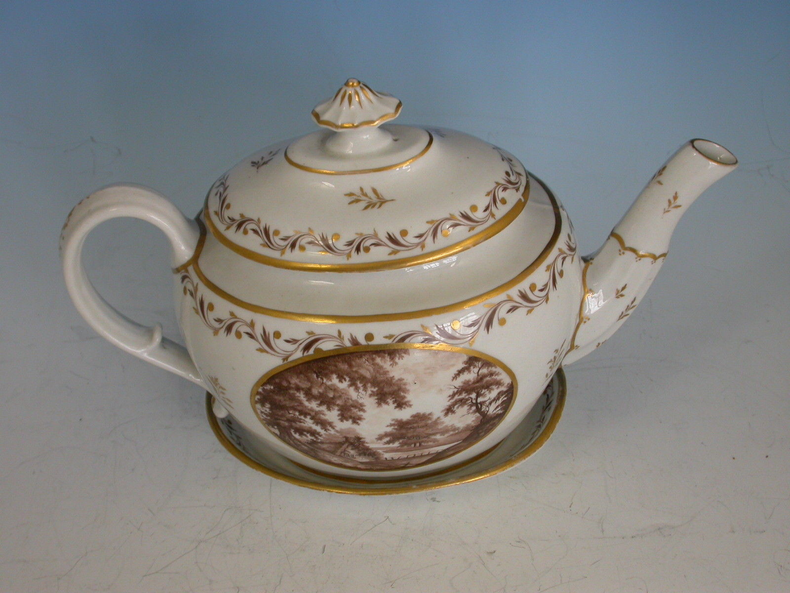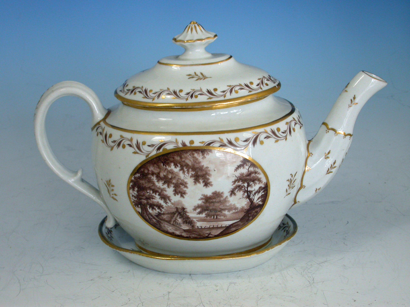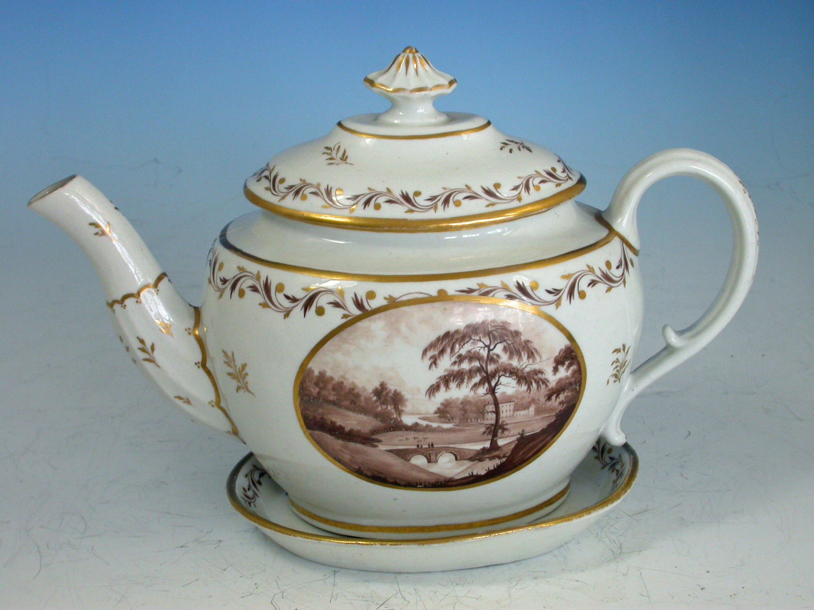 A very rare John Rose Coalport Teapot, Cover and Stand, of oval form with ear shaped handle and faceted spout, the cover with mushroom finial. Painted within the gilt enriched oval reserve with a landscape scene in sepia depicting a meandering river through a parkland scene with a tree in the foreground and a country house in the background, enclosed by a gilt leaf garland and foliate sprays.