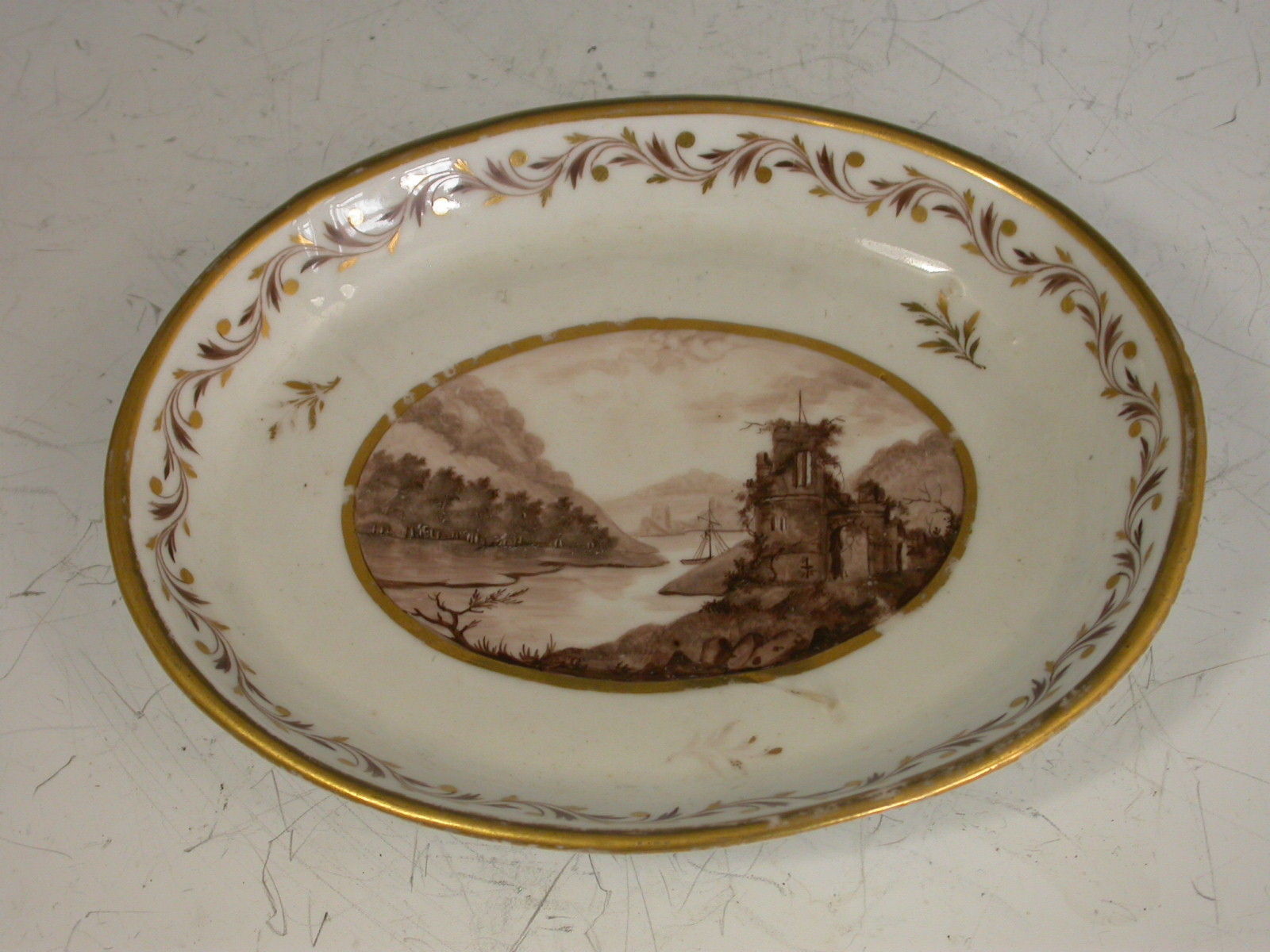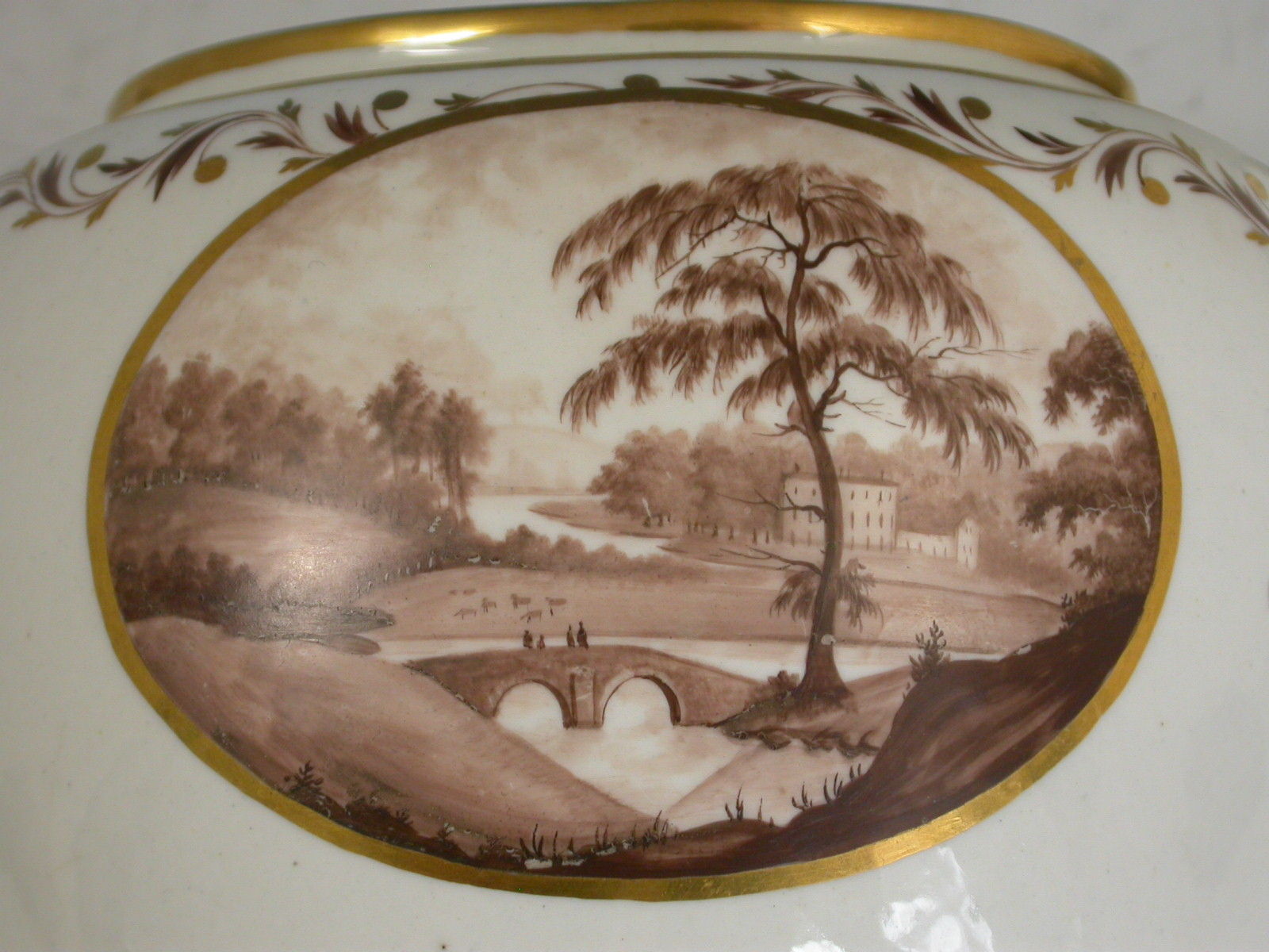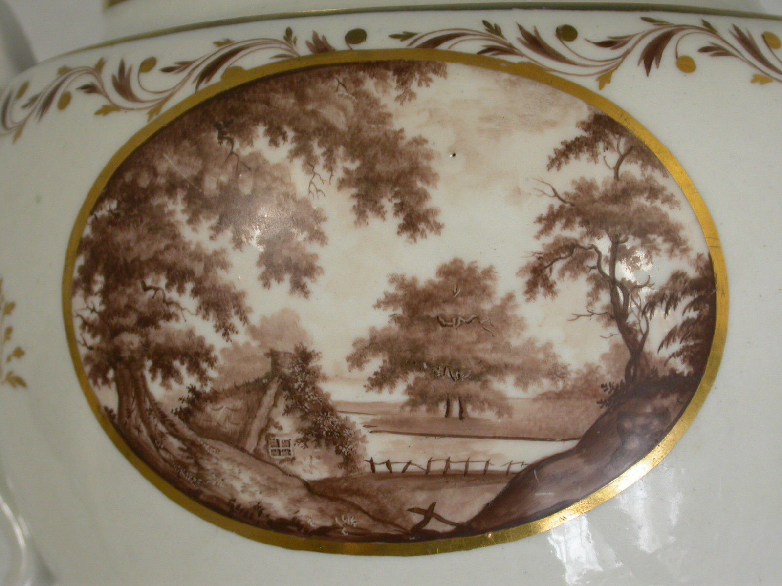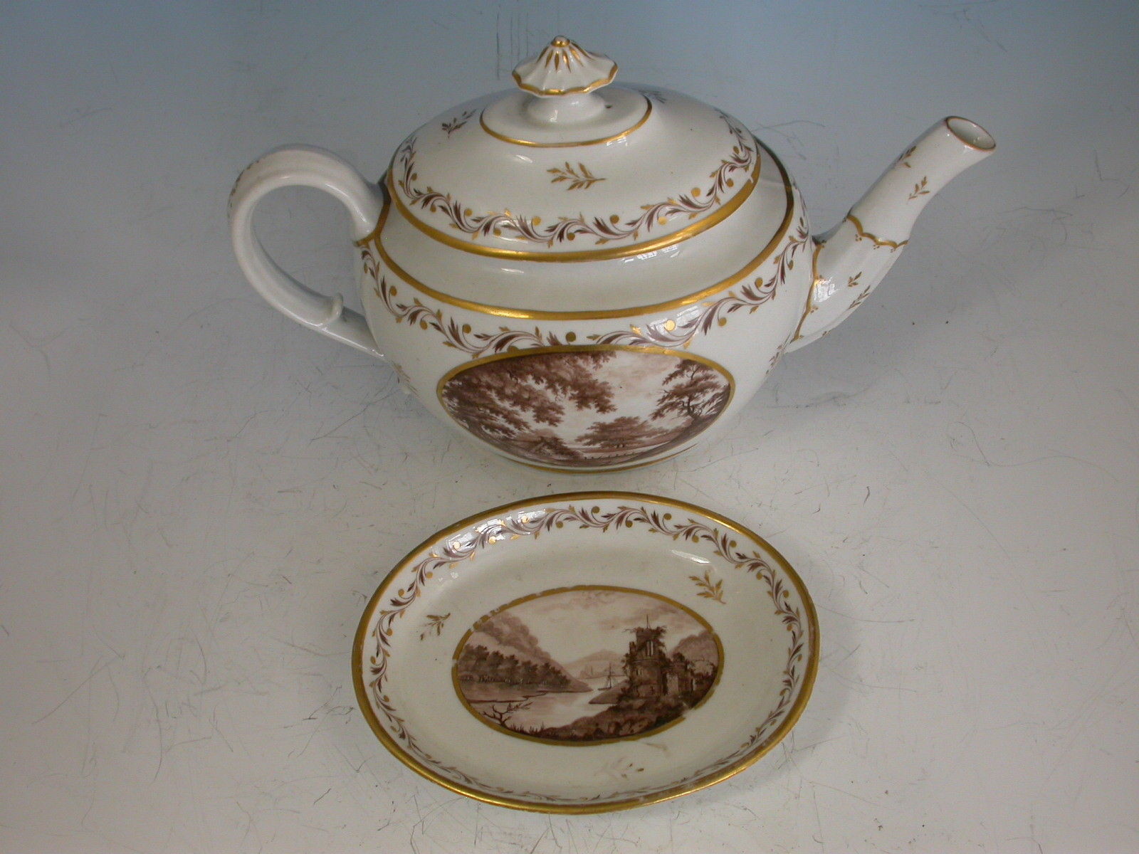 A very rare John Rose Coalport Teapot, Cover and Stand, of oval form with ear shaped handle and faceted spout, the cover with mushroom finial. Painted within the gilt enriched oval reserve with a landscape scene in sepia depicting a meandering river through a parkland scene with a tree in the foreground and a country house in the background, enclosed by a gilt leaf garland and foliate sprays.