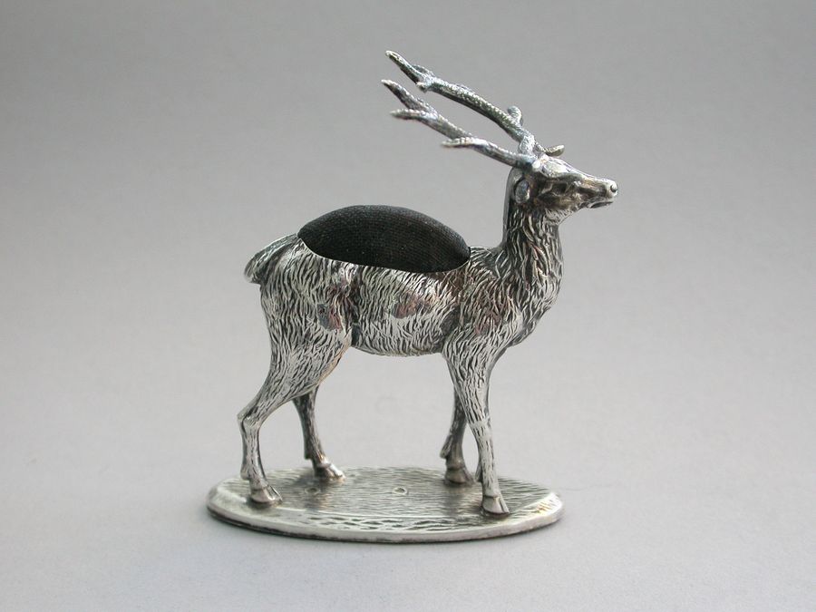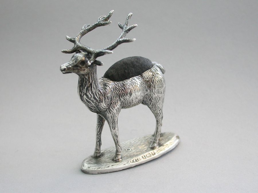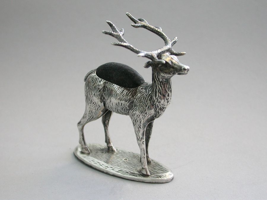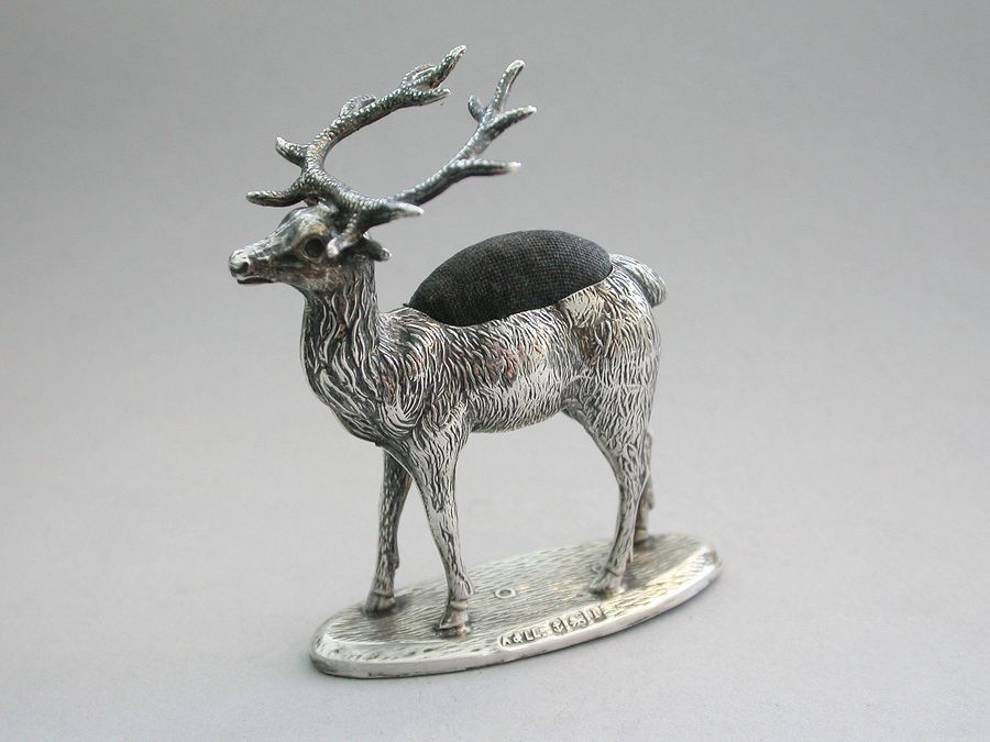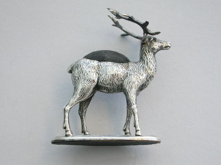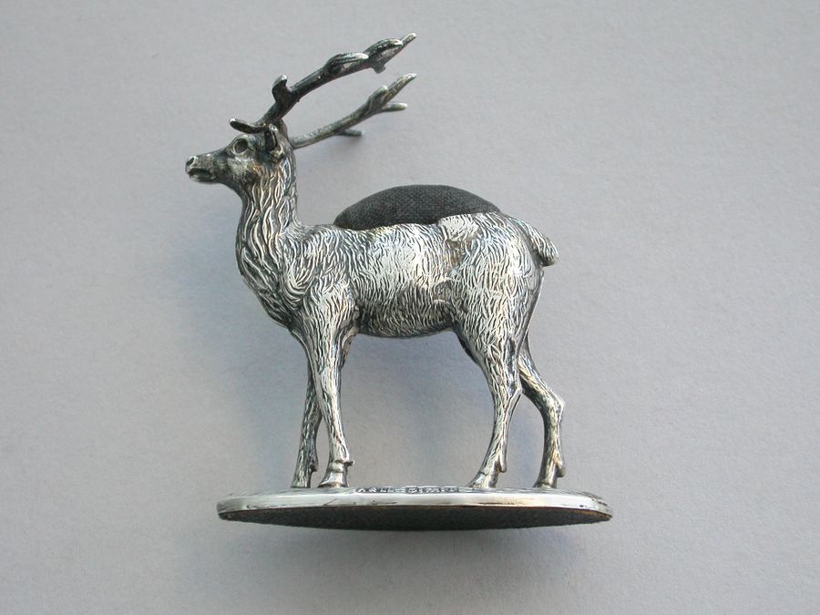 An extremely rare Edwardian novelty silver Pin Cushion, modelled as a standing Stag on a flat oval textured base. Complete with original faded blue velvet cushion.