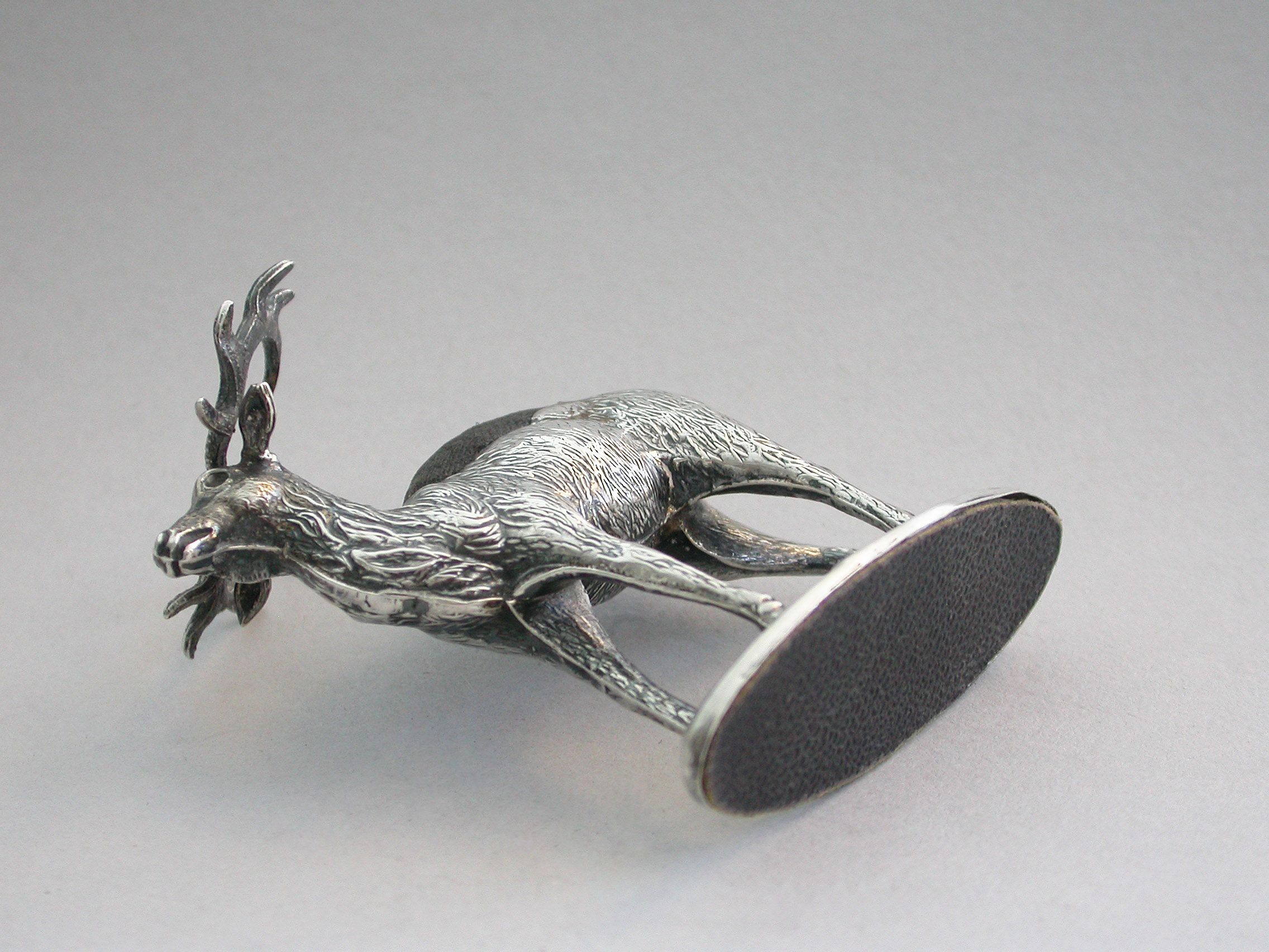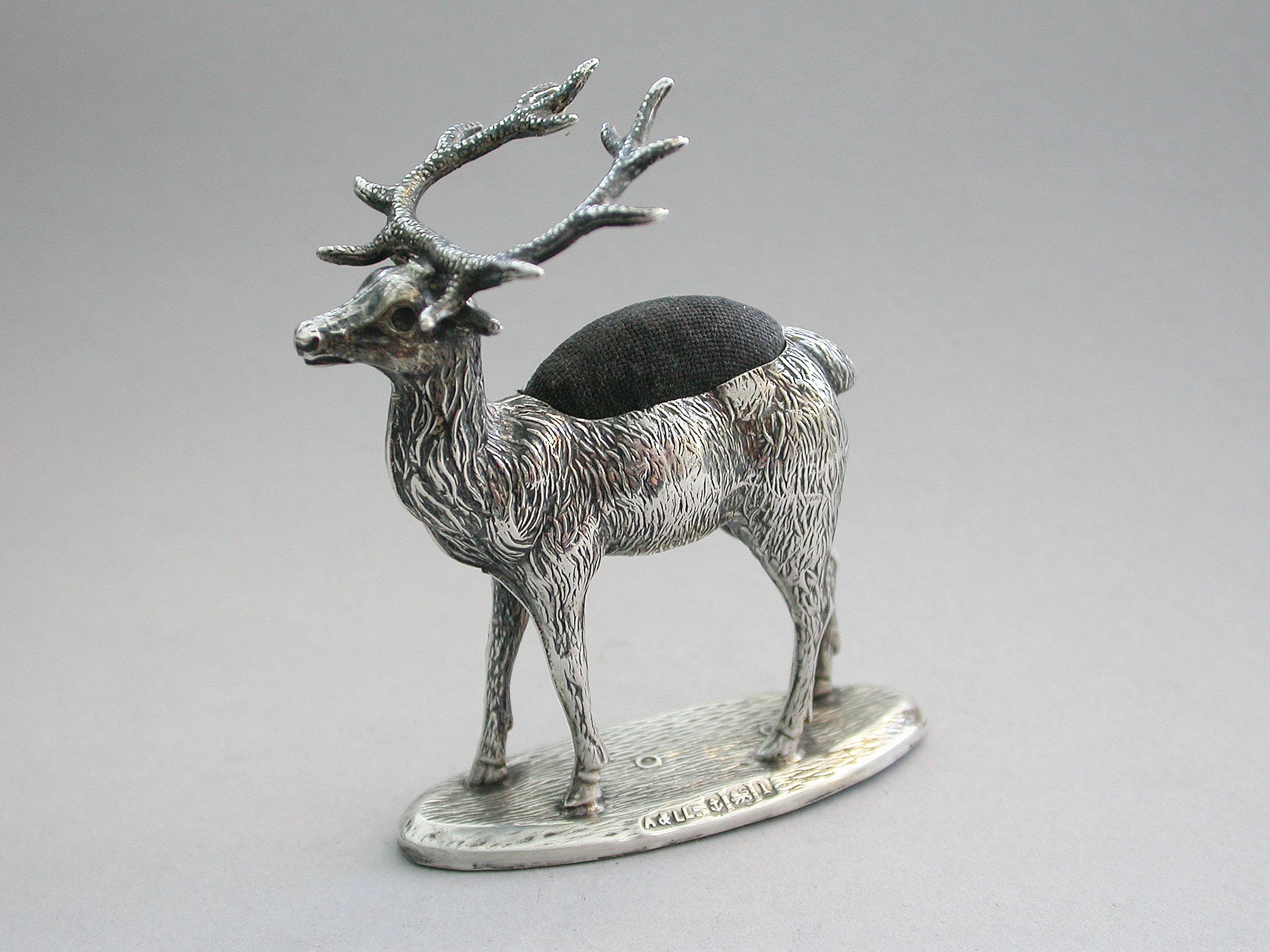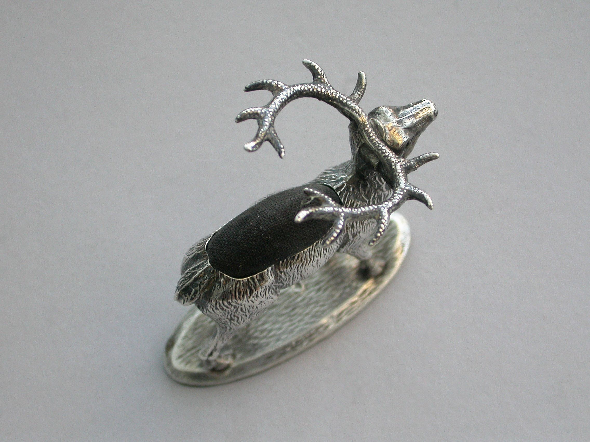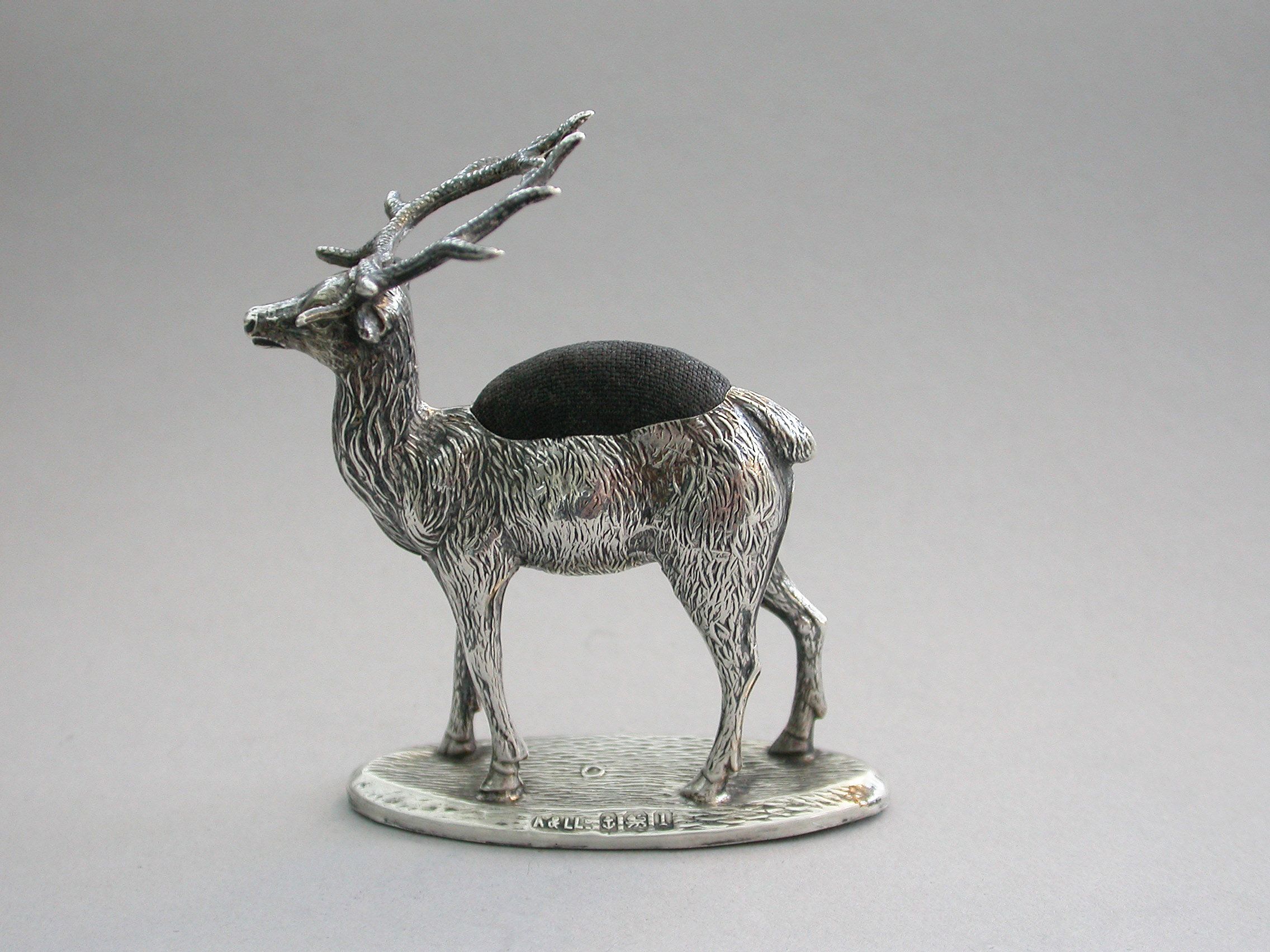 An extremely rare Edwardian novelty silver Pin Cushion, modelled as a standing Stag on a flat oval textured base. Complete with original faded blue velvet cushion.