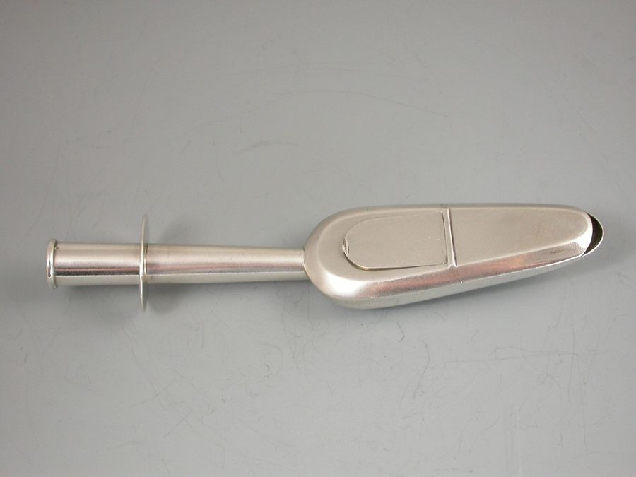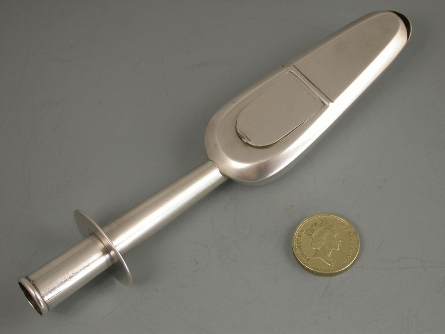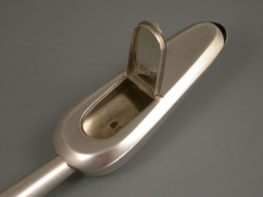 Rare Victorian silver 'Gibson's Patent' Medicine or Castor Oil Spoon of a large size, with hollow tubular handle and a covered bowl with hinged lid.