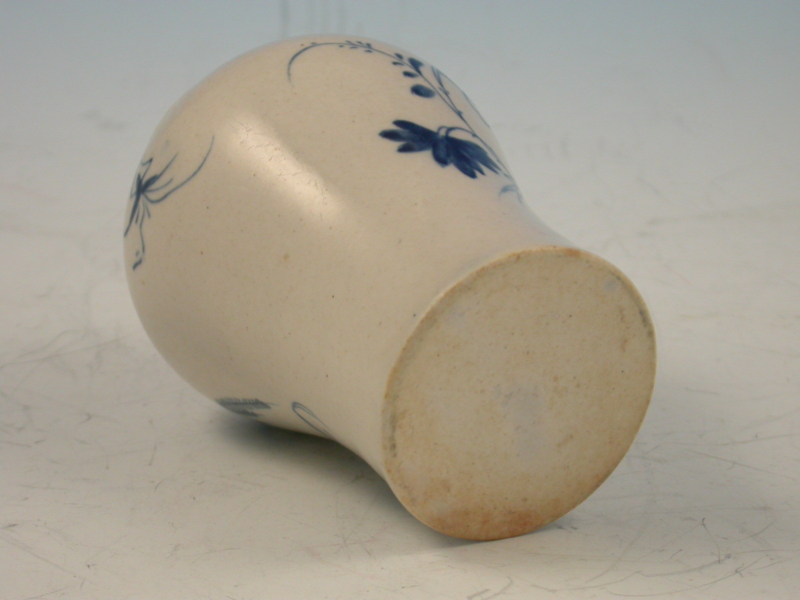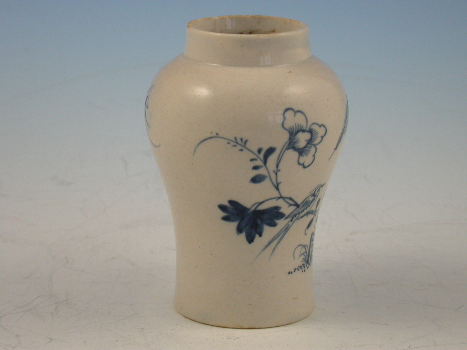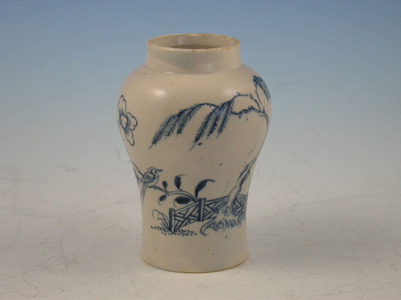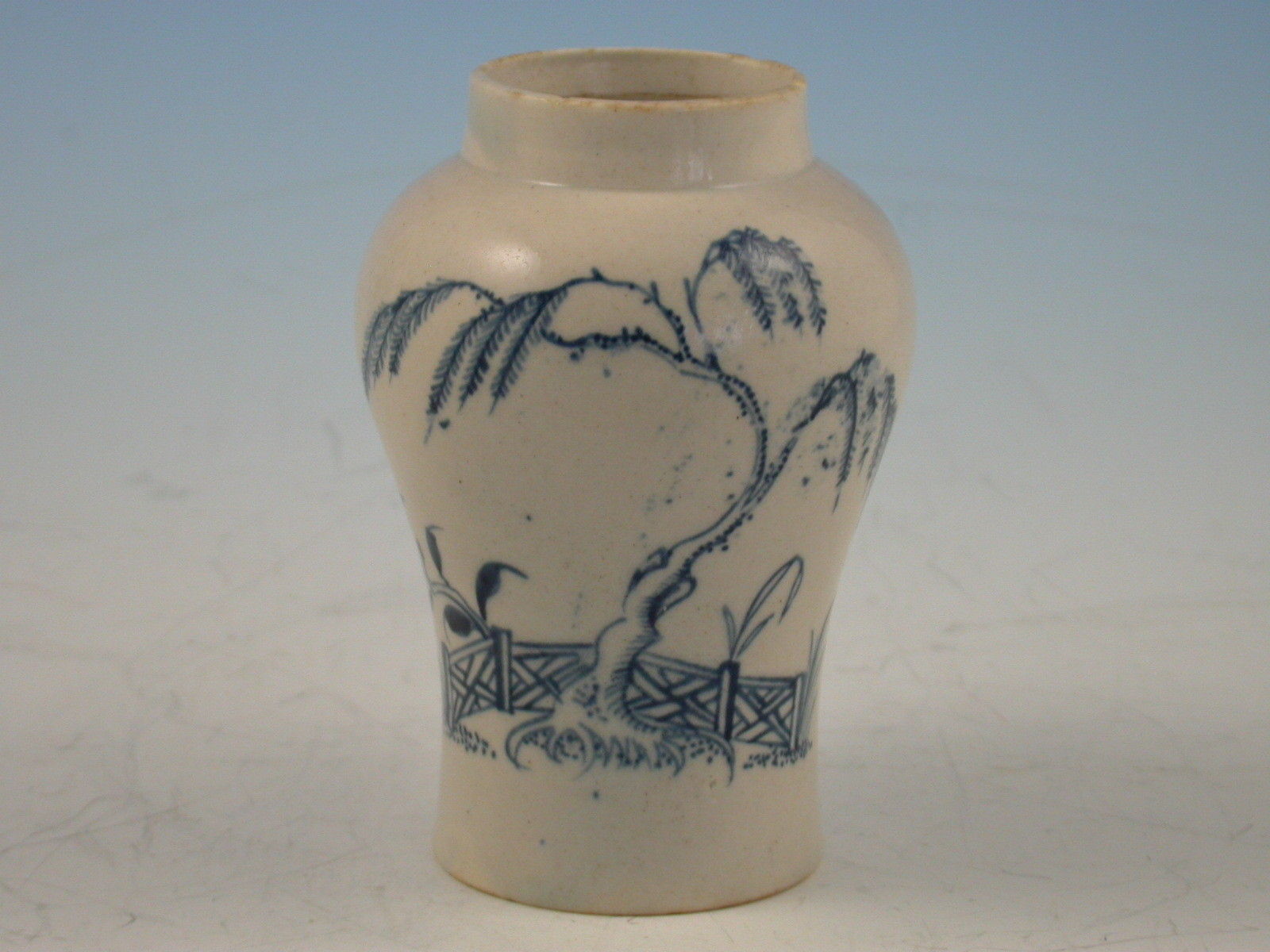 A very rare Liverpool baluster shaped Vase of unusually small size, painted in slate blue with a willow tree in a fenced enclosure and a fork tailed bird on a flower stem and hovering insect.