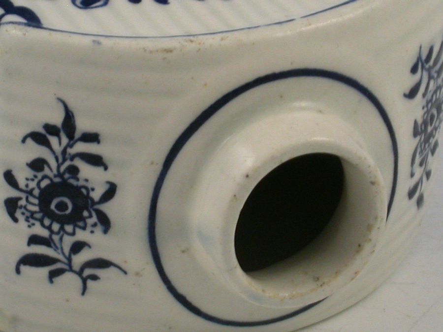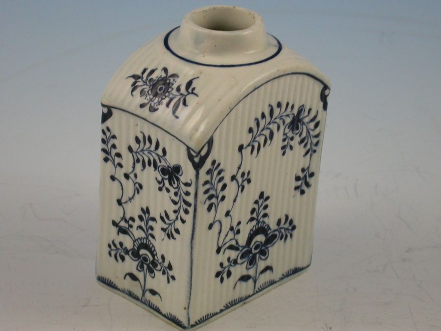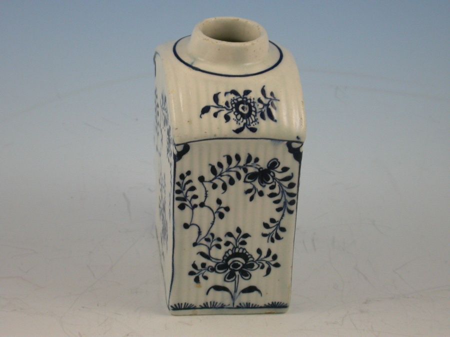 A rare rectangular Lowestoft Tea Canister with sloping shoulders, a circular opening above a short cylindrical neck ( the cover lacking) and a flat rectangular base. Moulded with narrow vertical ribs and decorated in a formal floral design, incorporating flowering small -leaved stems on the sides and two less formal sprays on the shoulders, copying the Meissen 'Immortelle' pattern. The upper and lower boundaries of the ribbing, and the four vertical edges are painted with a blue line and above this line at the base is a continuous string of rounded clumps of dashes. A blue line also encircles the neck.