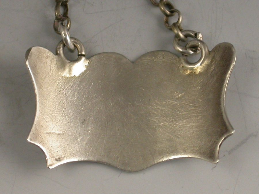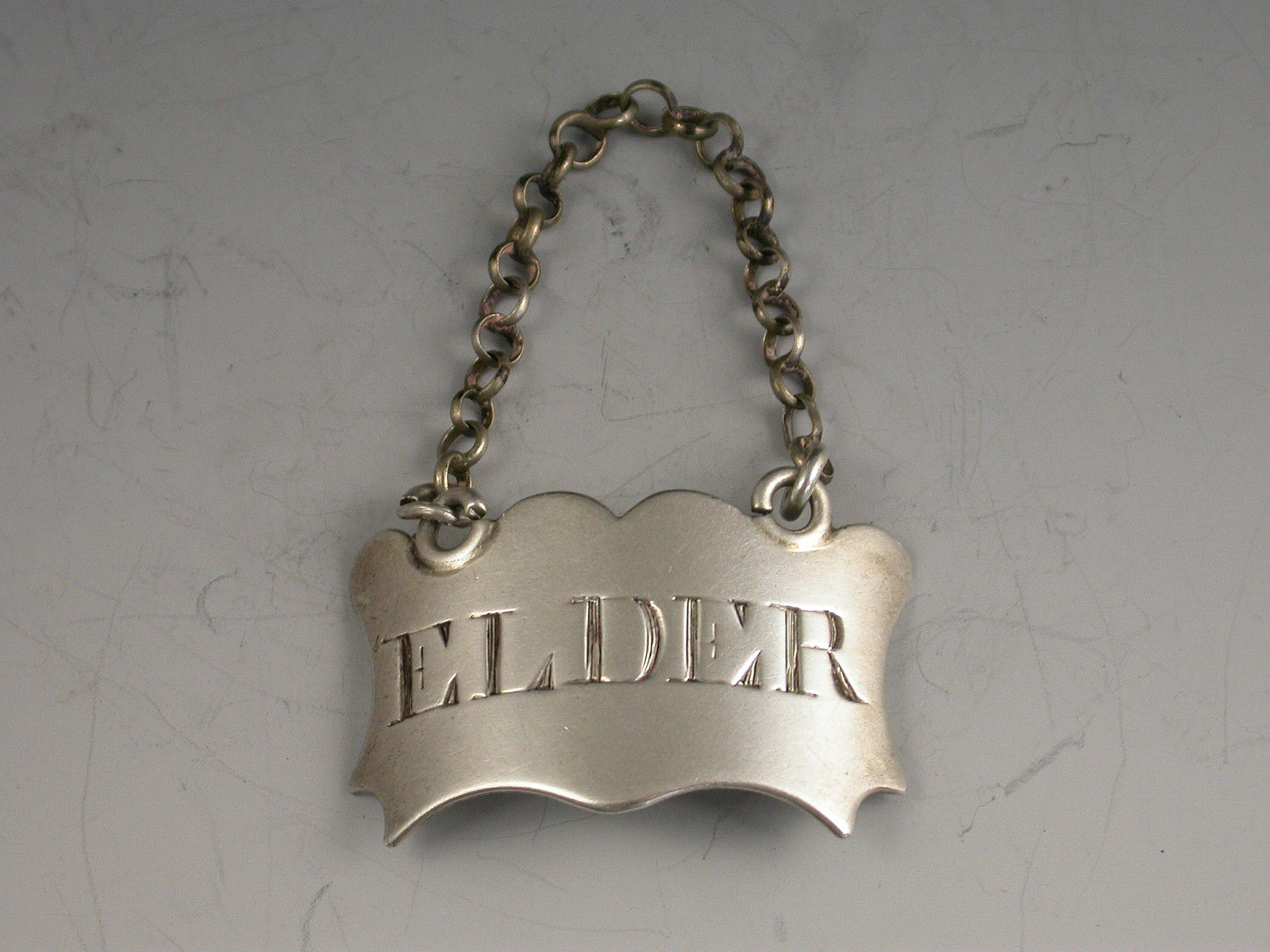 A rare and unusual mid 18th century silver Sauce Label of shaped escutcheon form with attached eyelets, incised for Elder (probably for Elder Vinegar).