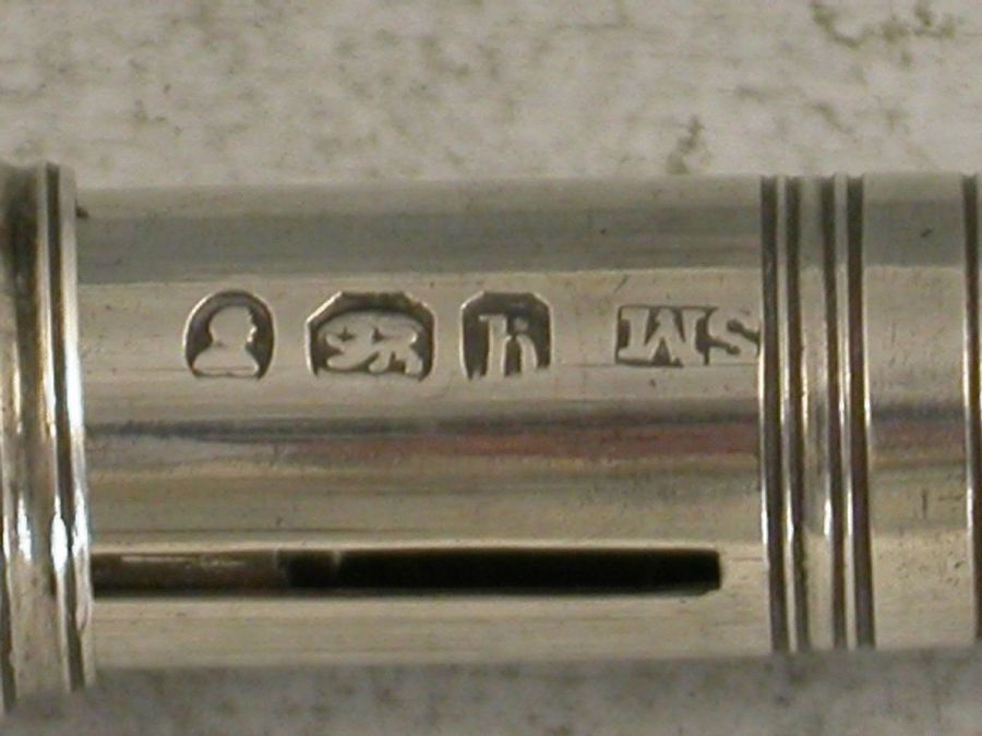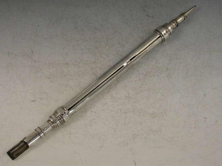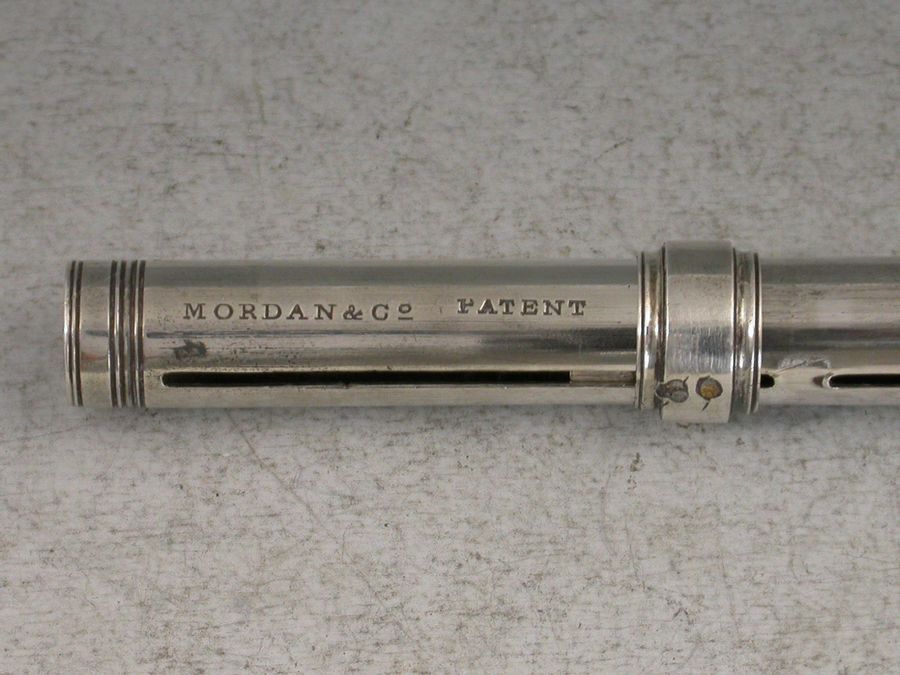 An extremely rare George IV silver double open ended pen and pencil combination with Bramah type nib holder, the plain cylindrical body with reeded decoration. Stamped Mordan & Co. Patent. The nib holder stamped S.Mordan’s improv’d. Also clearly hallmarked with the ‘S.M’ makers mark and date letter ‘h’ for London 1823.