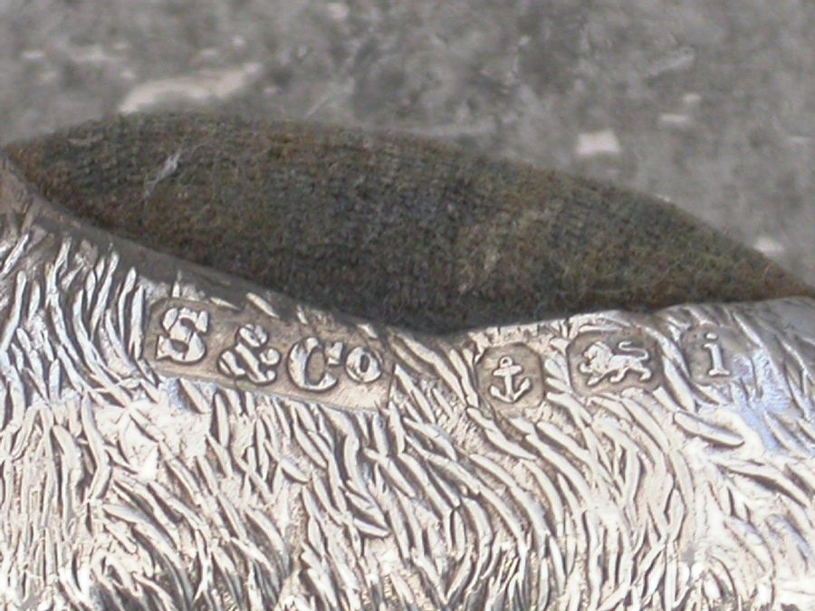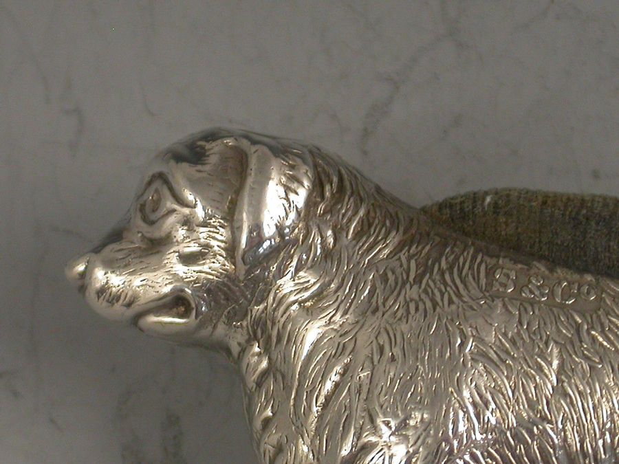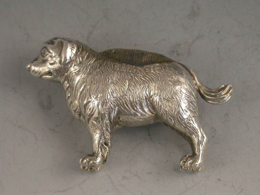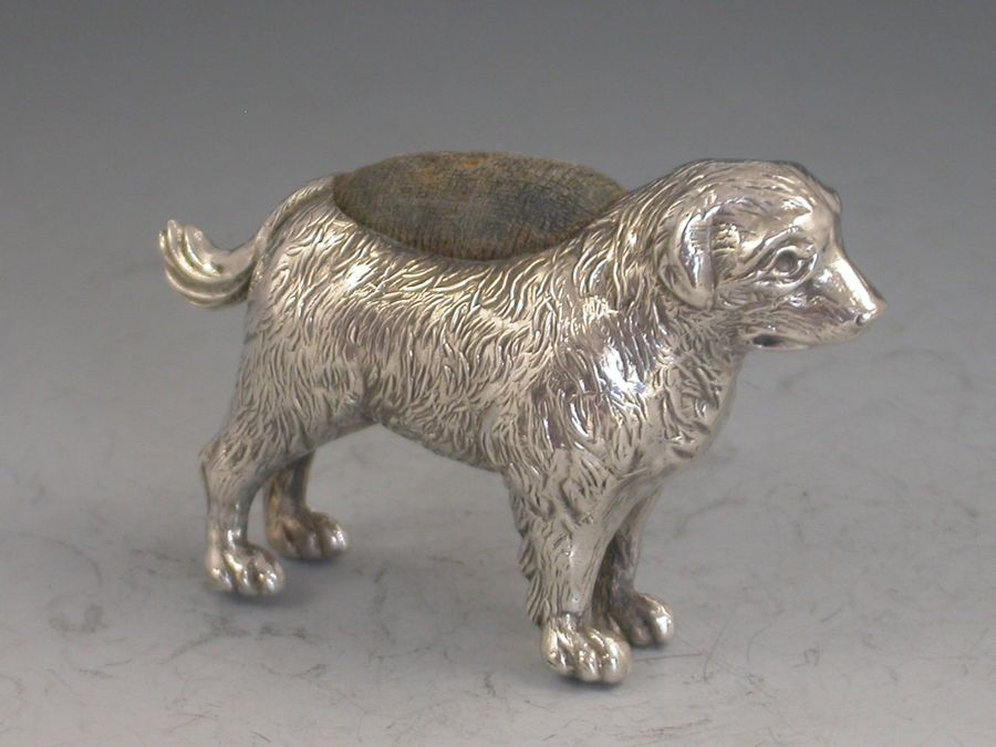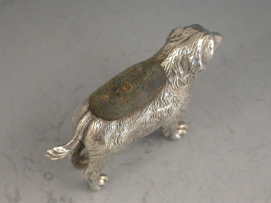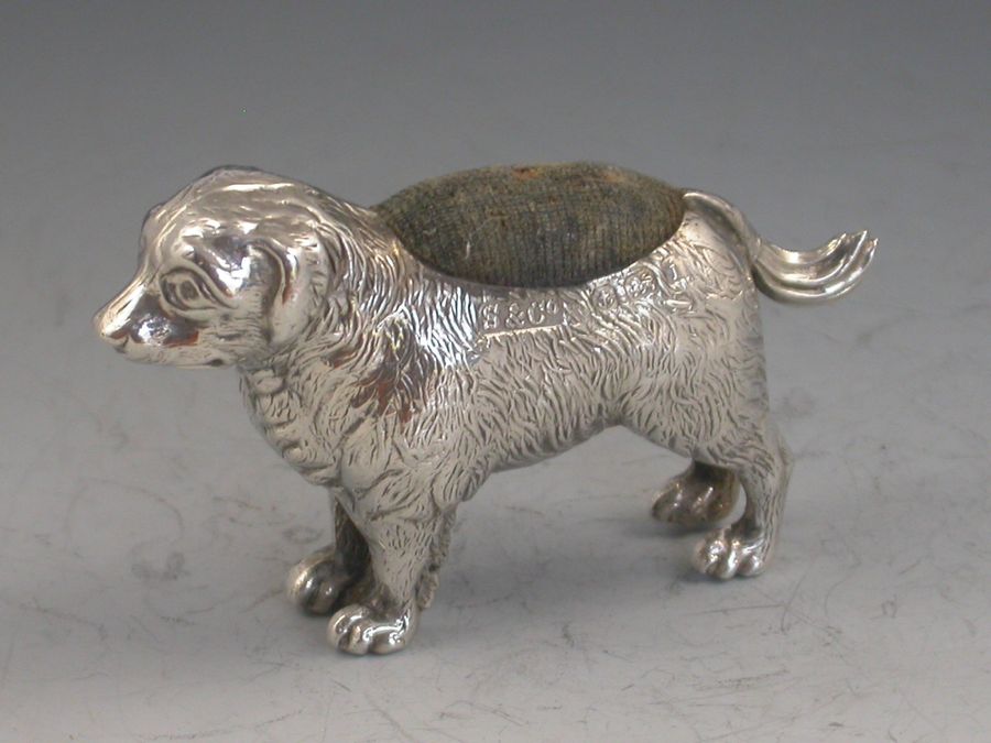 An extremely rare novelty silver Pin Cushion made in the form of a Dog with curled up tail.