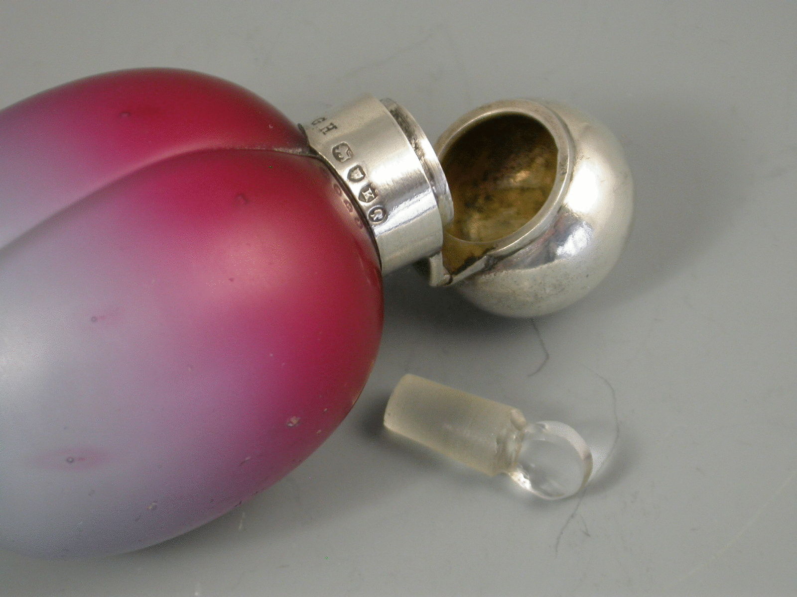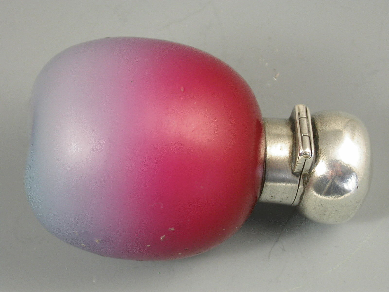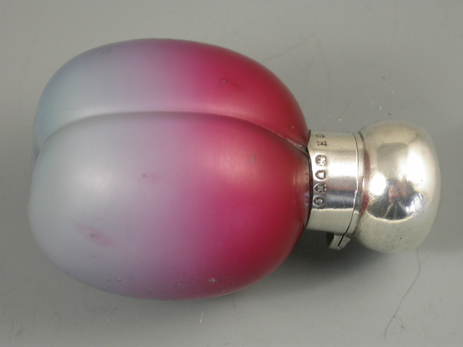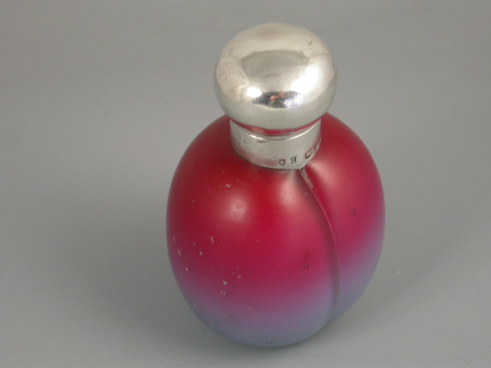 A rare Victorian novelty silver mounted glass Scent Bottle made in the form of a Victoria Plum, with realistic graduated colouring and speckling to the surface, the hinged silver lid opening to reveal a glass stopper.