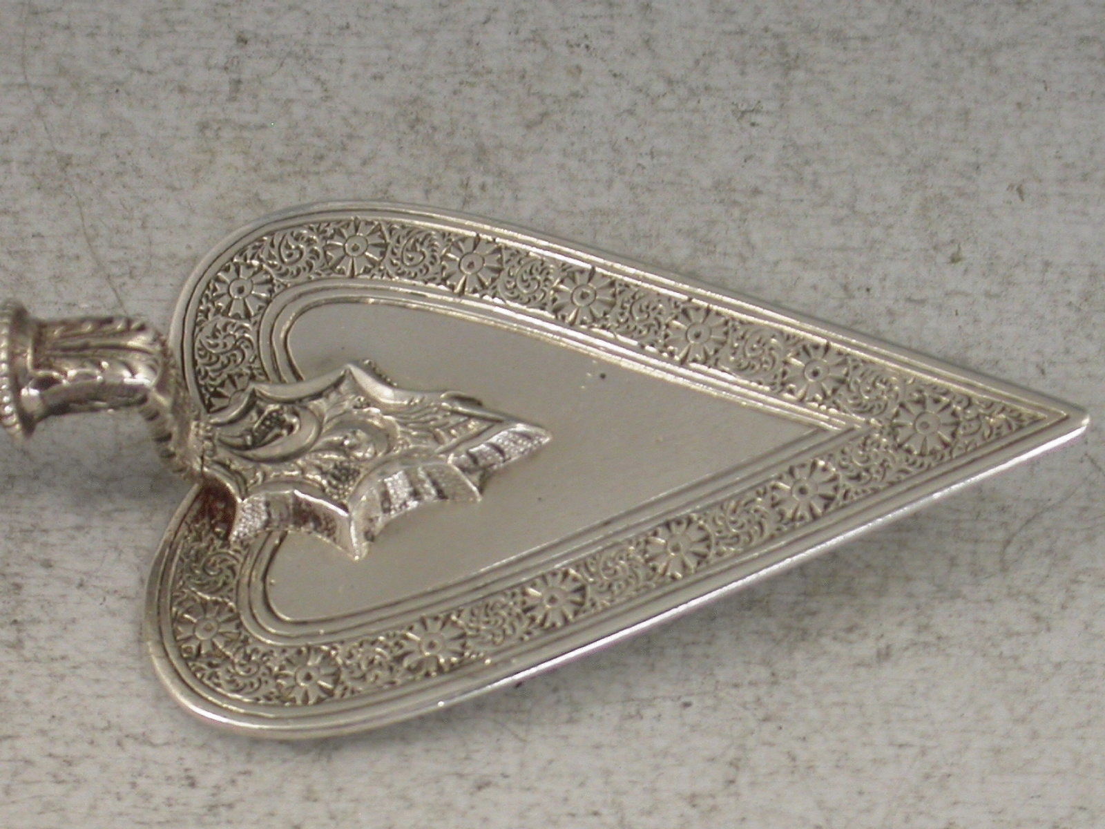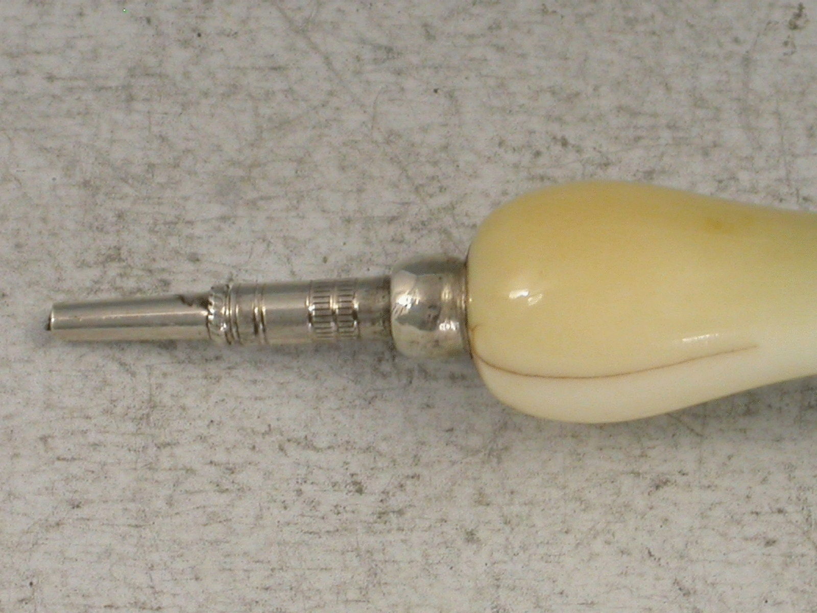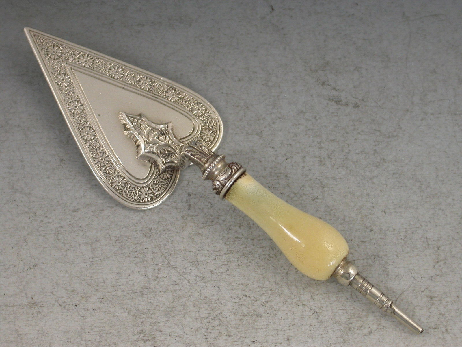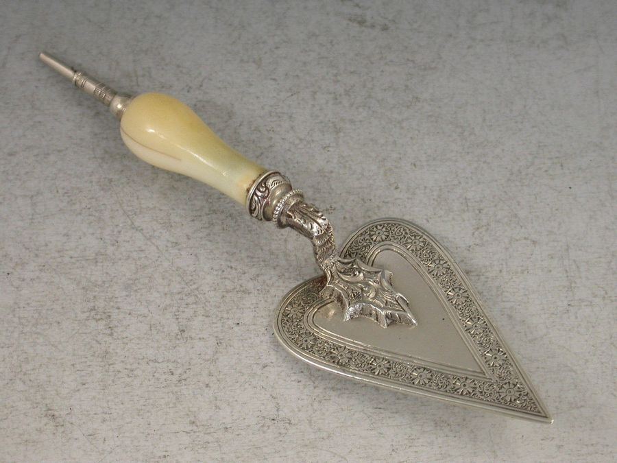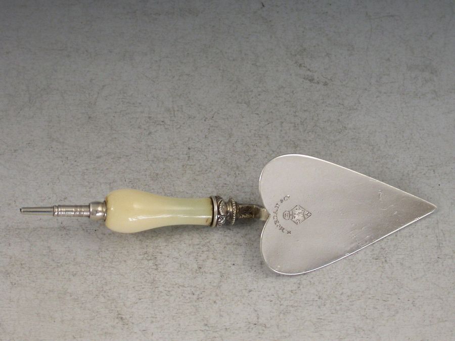 A very rare Victorian Novelty silver Propelling Pencil formed as a Presentation Trowel with shaped ivory handle. The blade of the trowel engraved with a band of foliate scroll decoration, the base stamped S. Mordan & Co with diamond registration mark for 5th December 1872. Twist mechanism to propel the pencil.