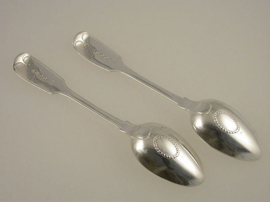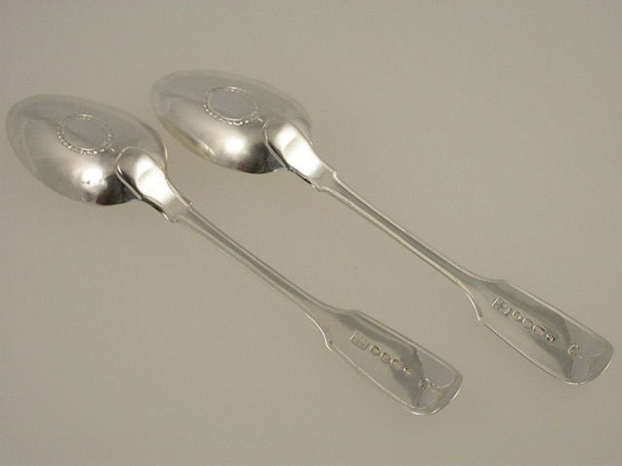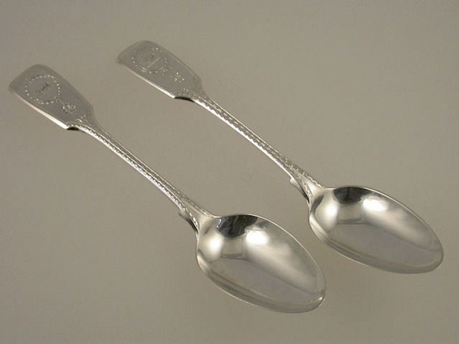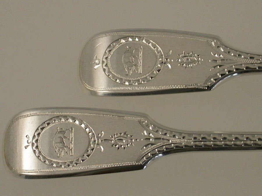 A rare pair of Victorian fiddle pattern Teaspoons with unusual and very fine bright cut engraved decoration including oval cartouches to the handles and bottom of the bowls, a crest depicting a Boar to the handles.