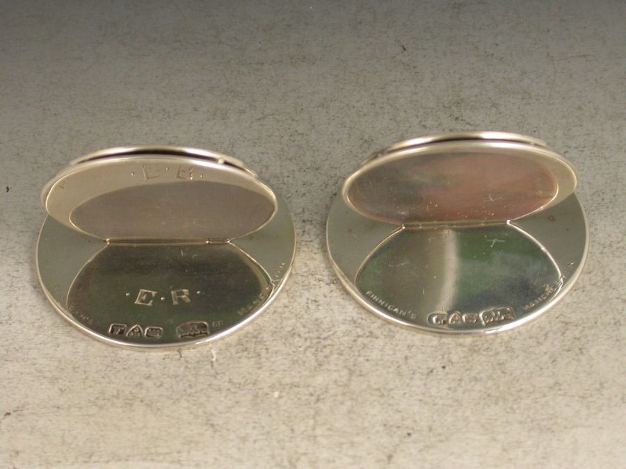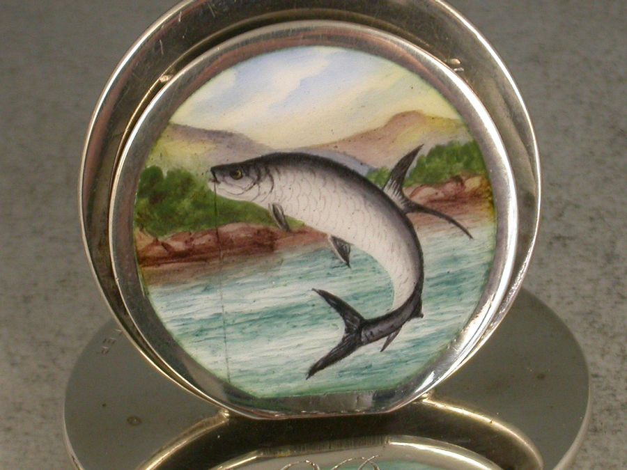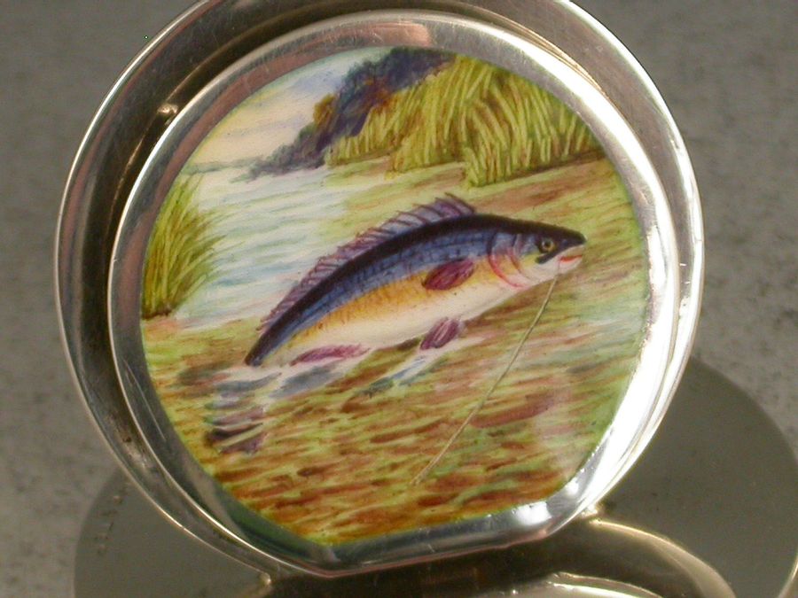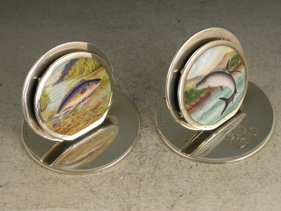 A fine and rare pair of Edwardian silver and enamel Menu Holders of double-disc form on circular bases, the sprung circular front panels finely enamelled with a Tarpon and a Black Bass in river landscape scenes. Engraved with contemporary initials ""ER"" and the retailers mark of Finnigan's of Manchester.