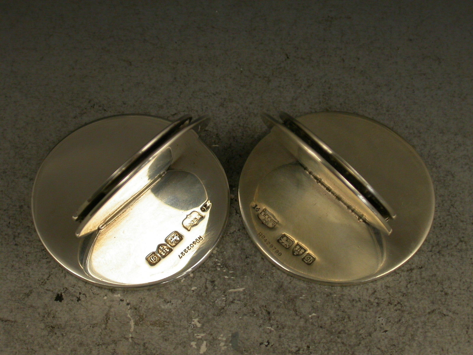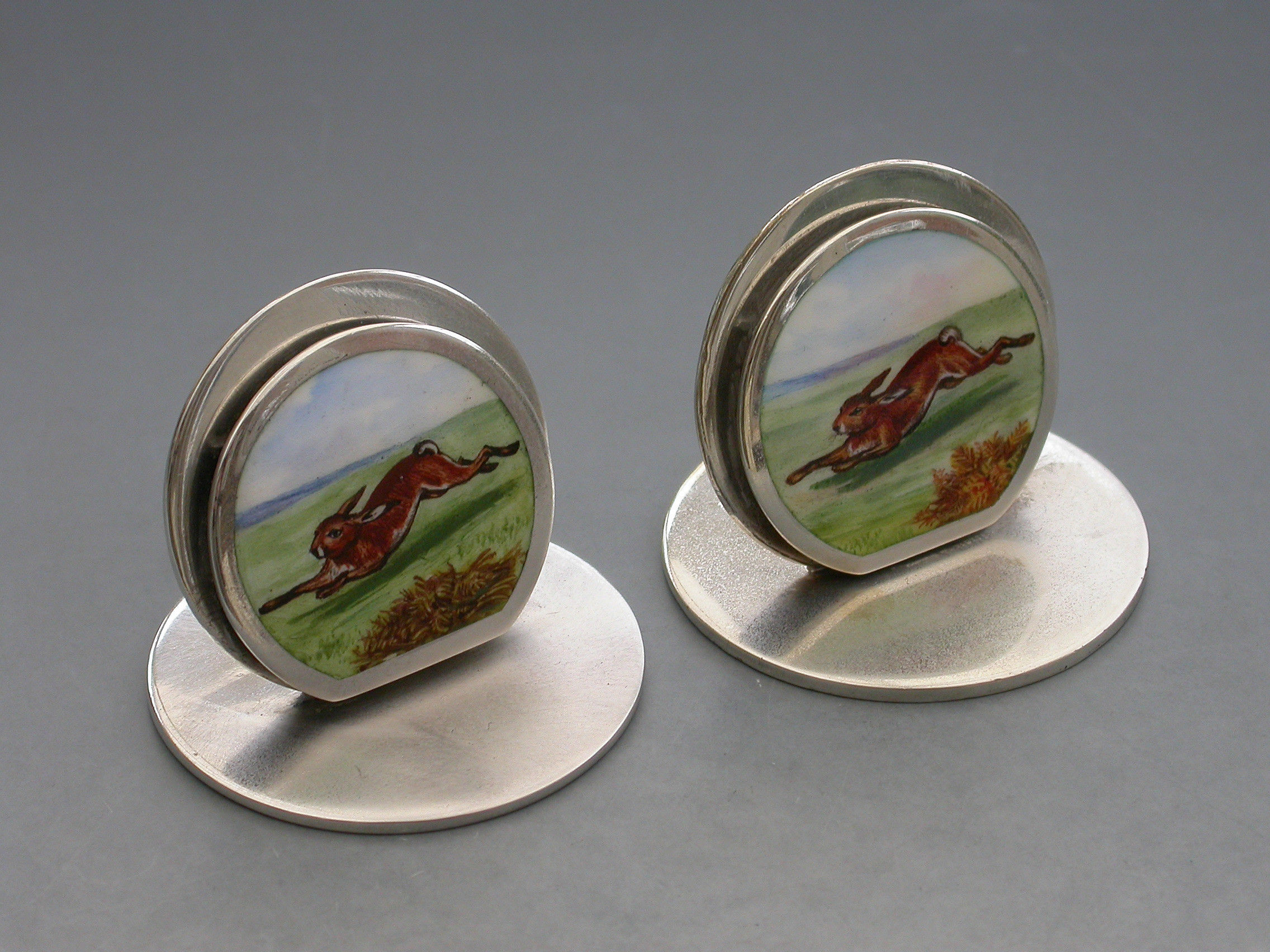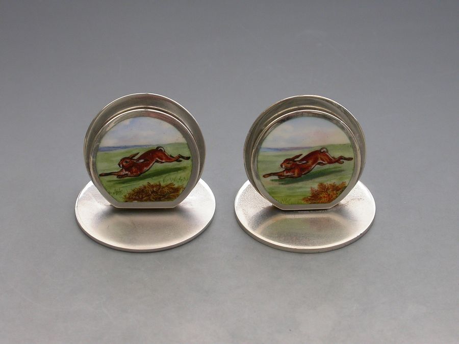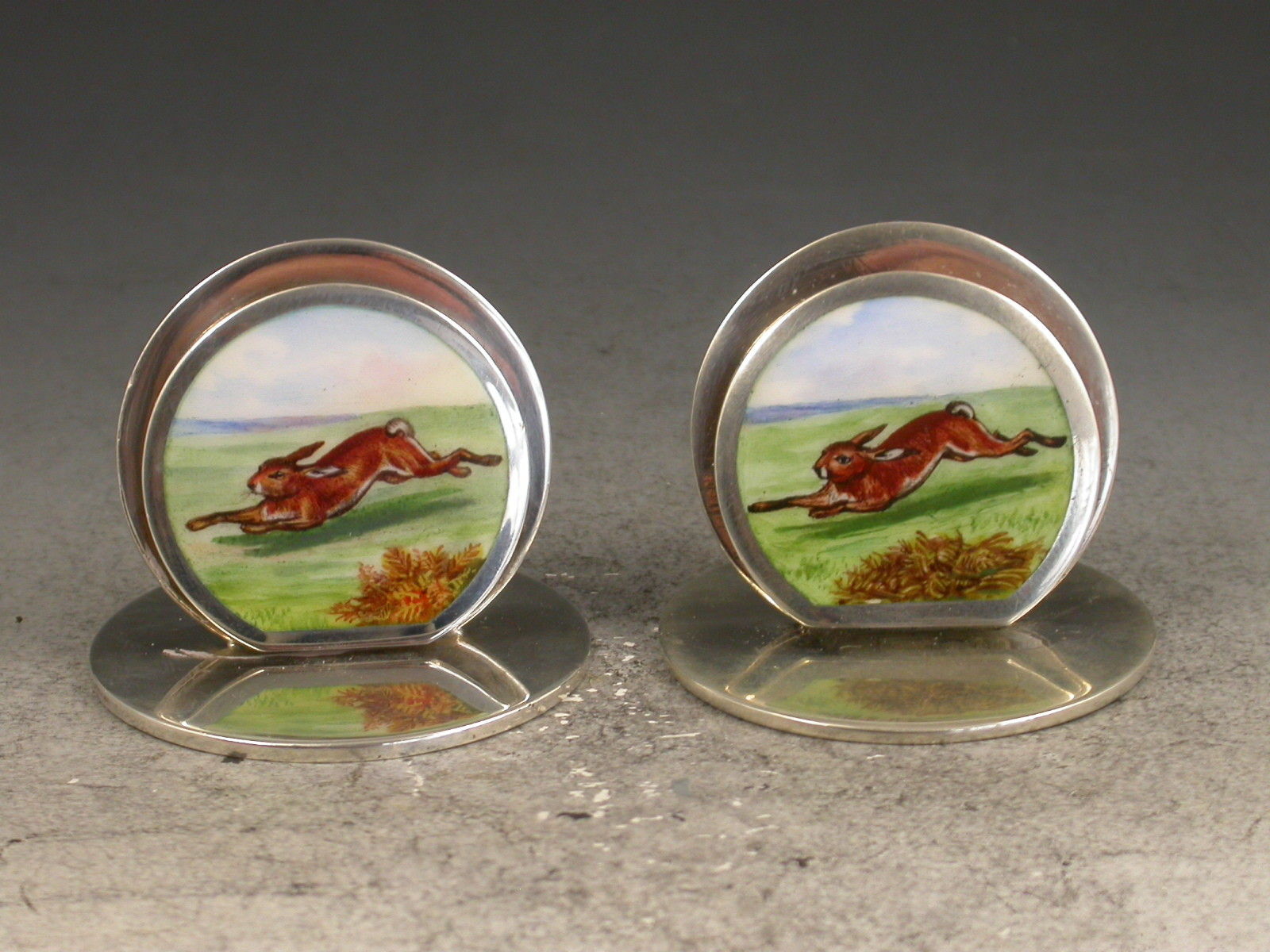 A fine and rare pair of Edwardian silver and enamel Menu Holders of double-disc form on circular bases, the sprung circular front panels finely enamelled with running hares in landscapes.