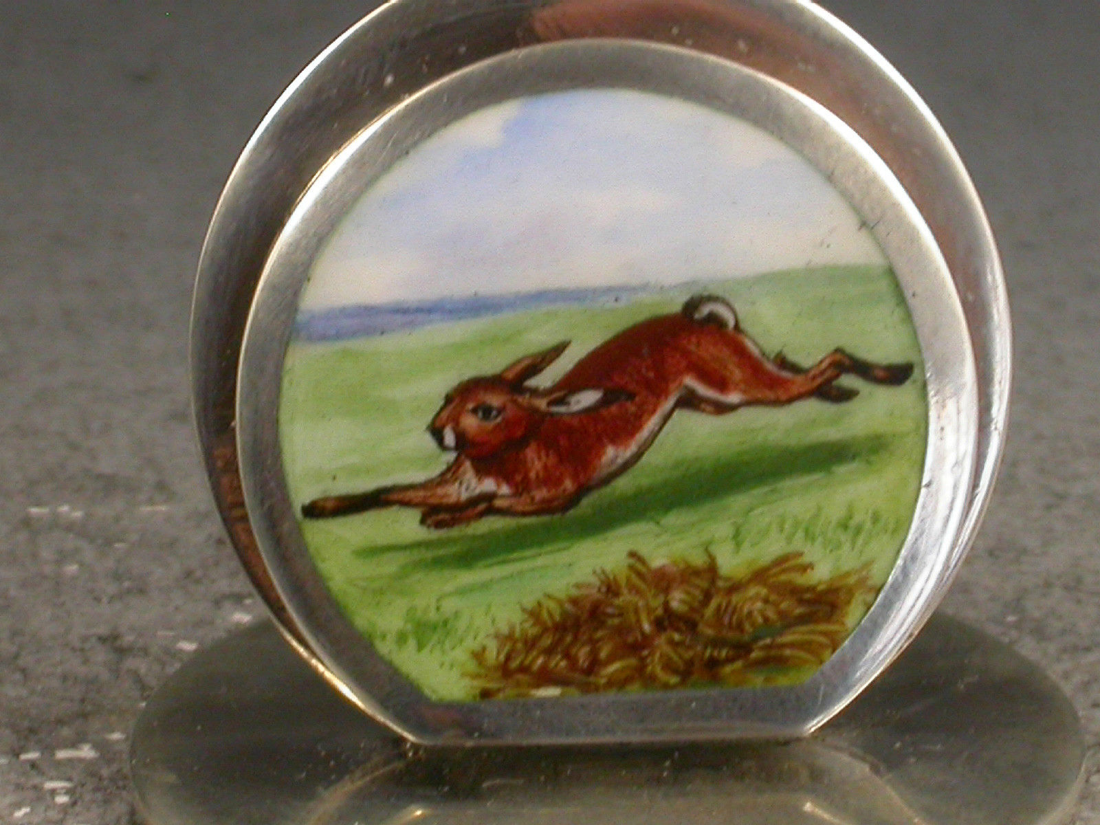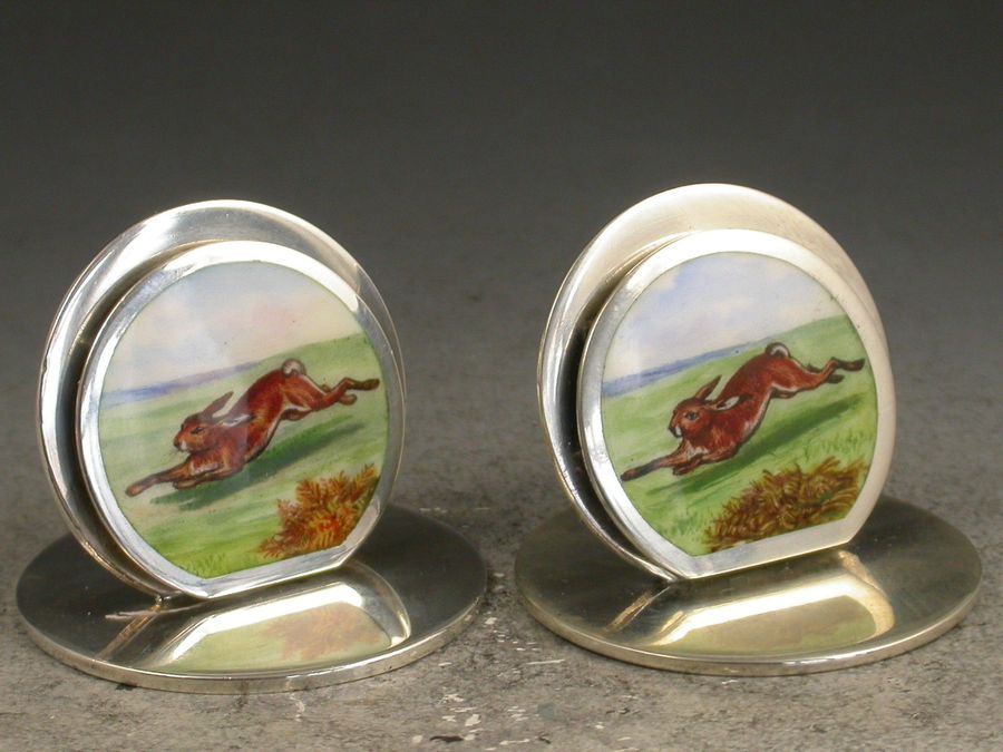 Rare Pair Edwardian Silver & Enamel 'Hare' Menu Holders