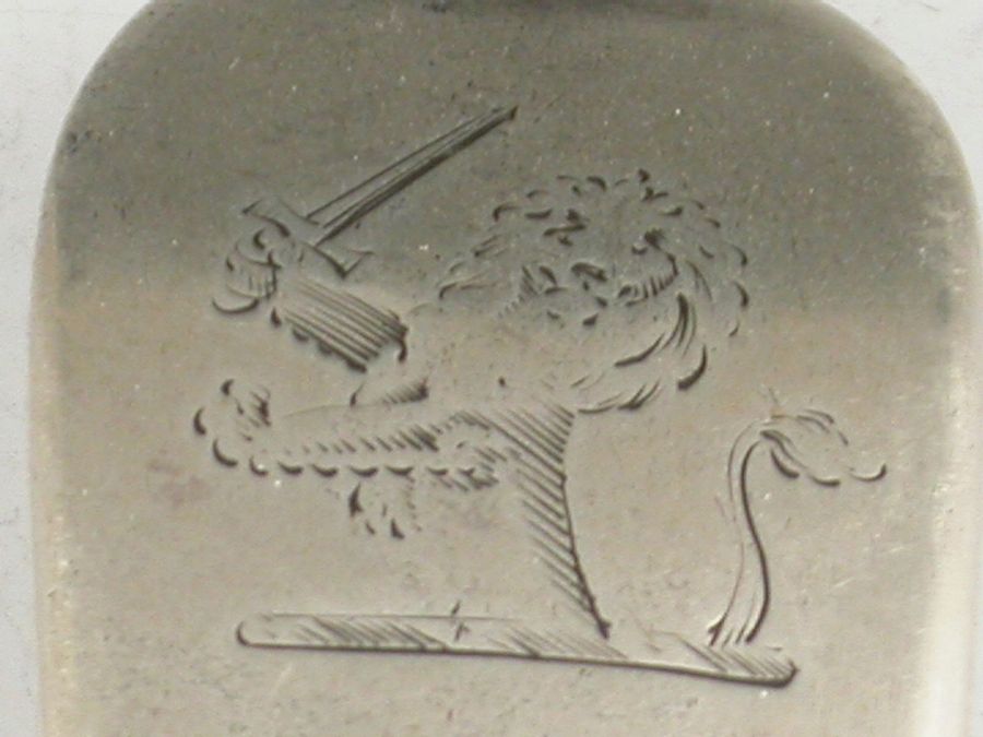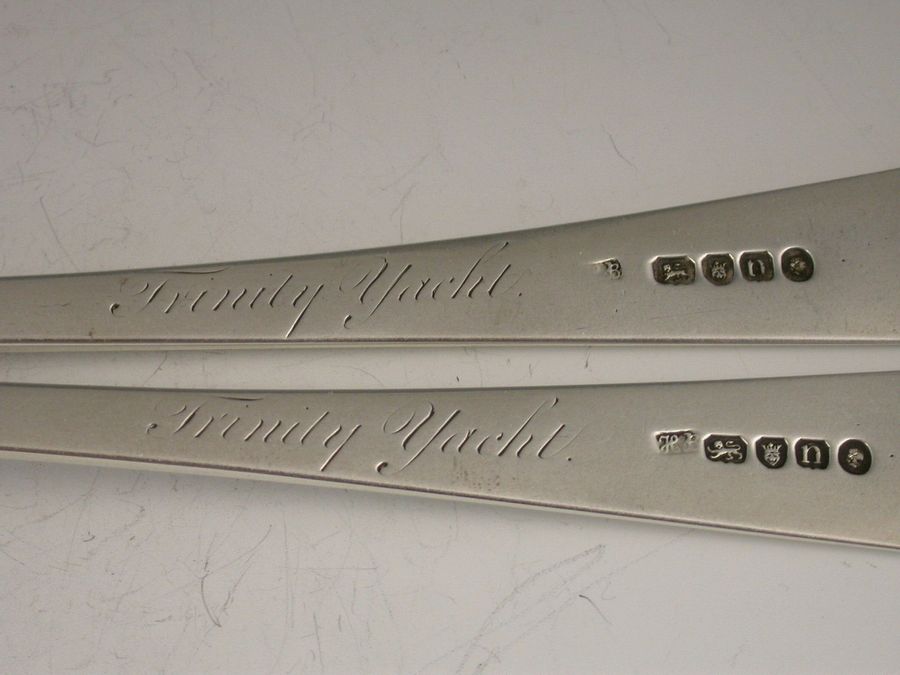 A rare pair of George III 18th century Old English pattern Basting Spoons, the handles engraved with a crest of a demi lion rampant holding a dagger, the reverse of the bowls and the handles engraved Trinity Yacht.