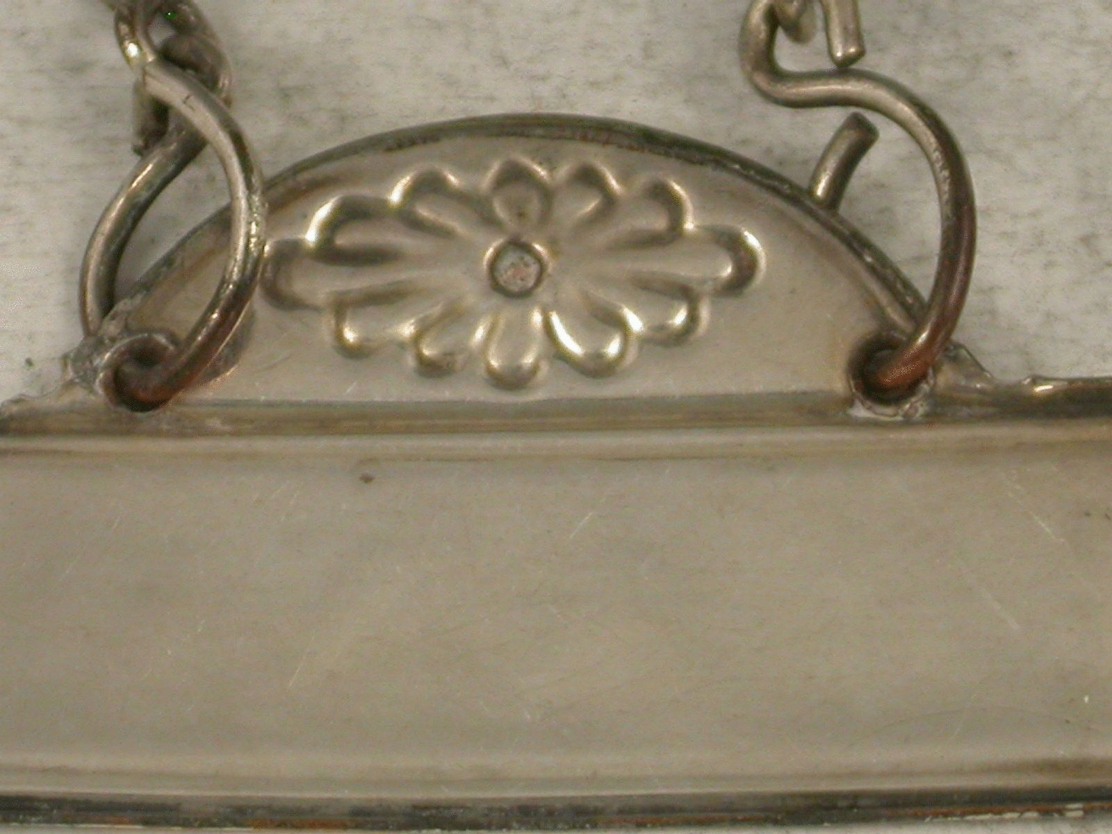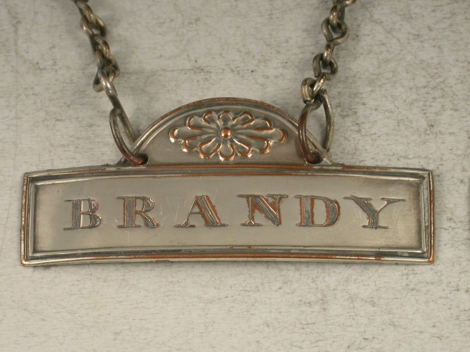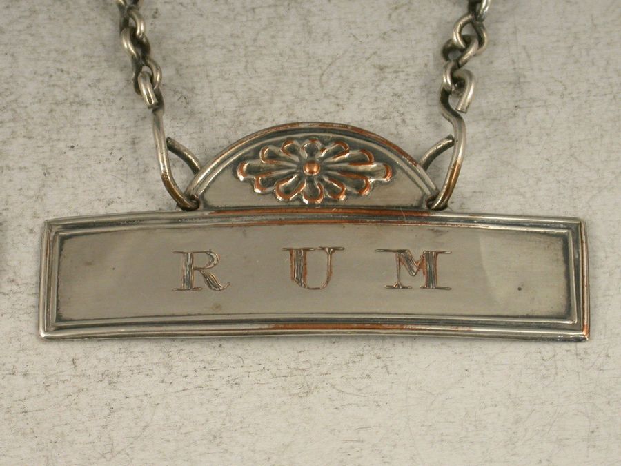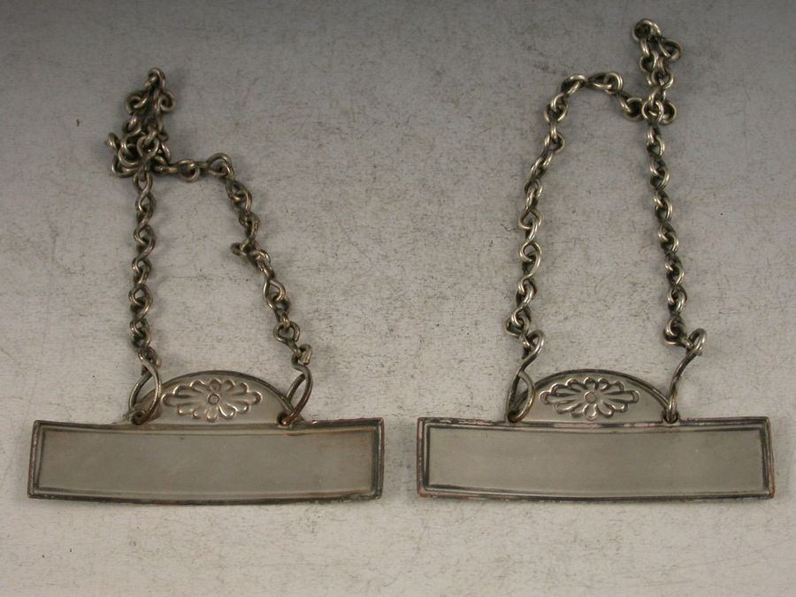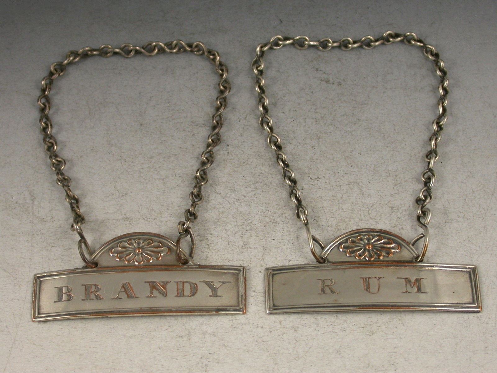 A fine pair of 18th century Old Sheffield Plate Wine Labels in the neo-classical style of reeded narrow rectangular form with domes stamped with fluted flower head devices, incised for Rum and Brandy. Complete with original suspension chains with distinctive figure of eight links.