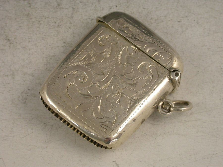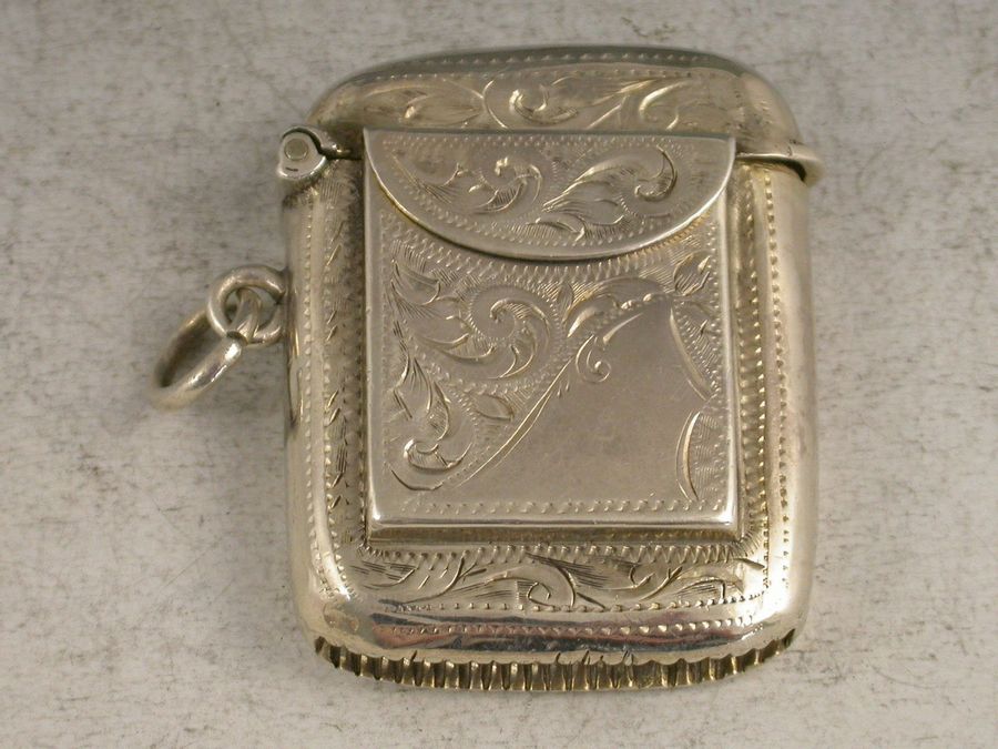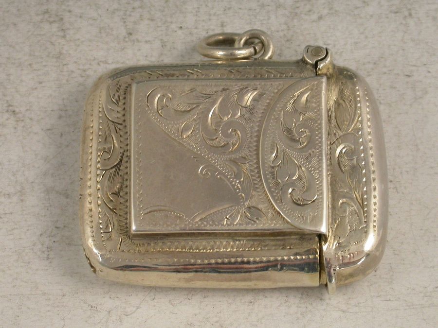 A rare Edwardian silver Vesta Case / combined Stamp Case of rounded rectangular form with hinged flip top lid and applied suspension ring, engraved with foliate scroll decoration.