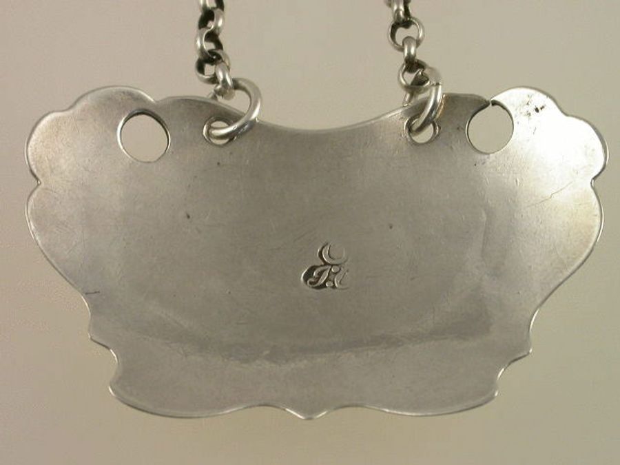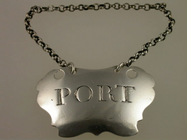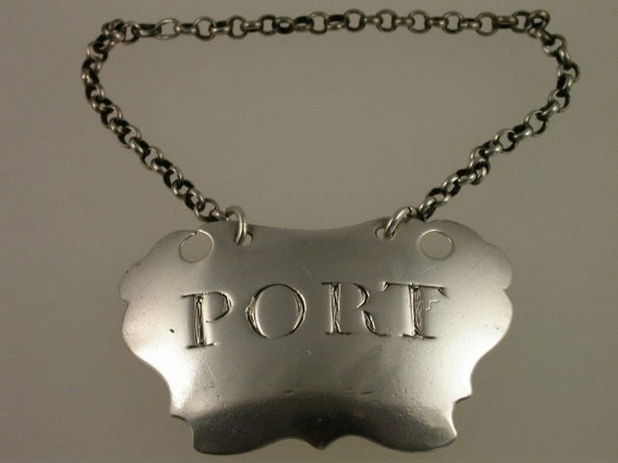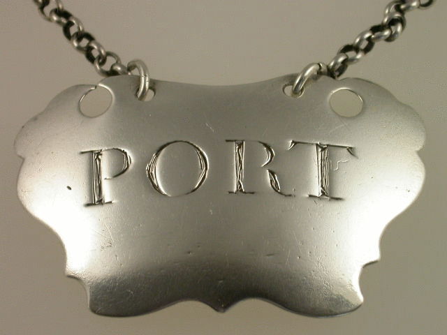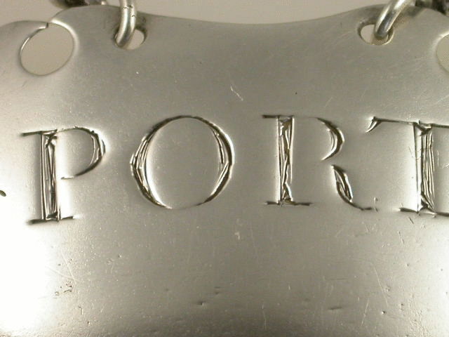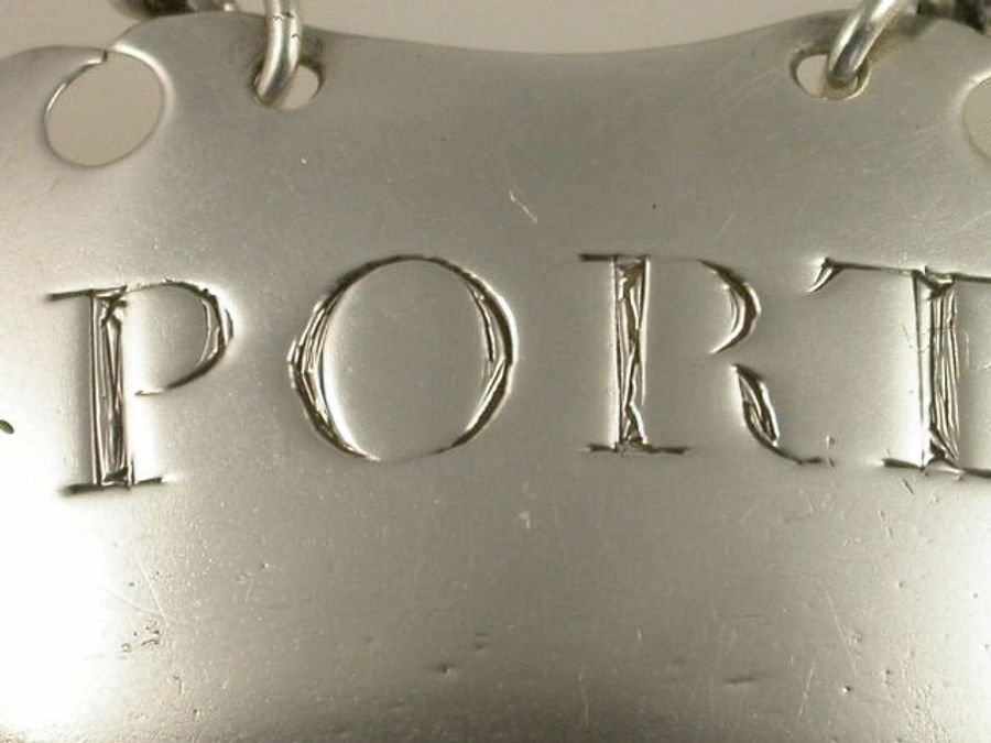 A very rare George II Provincial silver Wine Label of plain escutcheon form, incised for PORT. Exhibiting the typical Newcastle feature with the horns closed to form circles (Rt hand horn, not cut out. Lt hand horn almost solid).