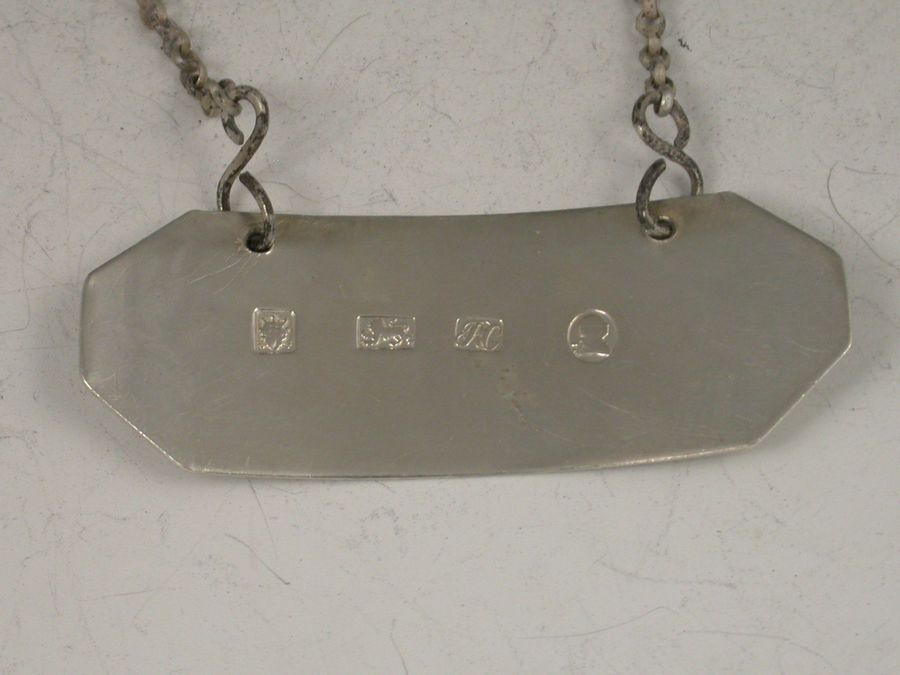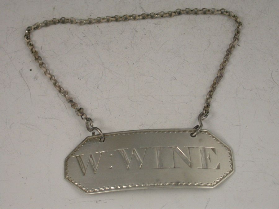 An extremely rare George III Provincial silver Wine Label of narrow rectangular form with distinctively broad cut-corners and feather edge border, incised for W : Wine.