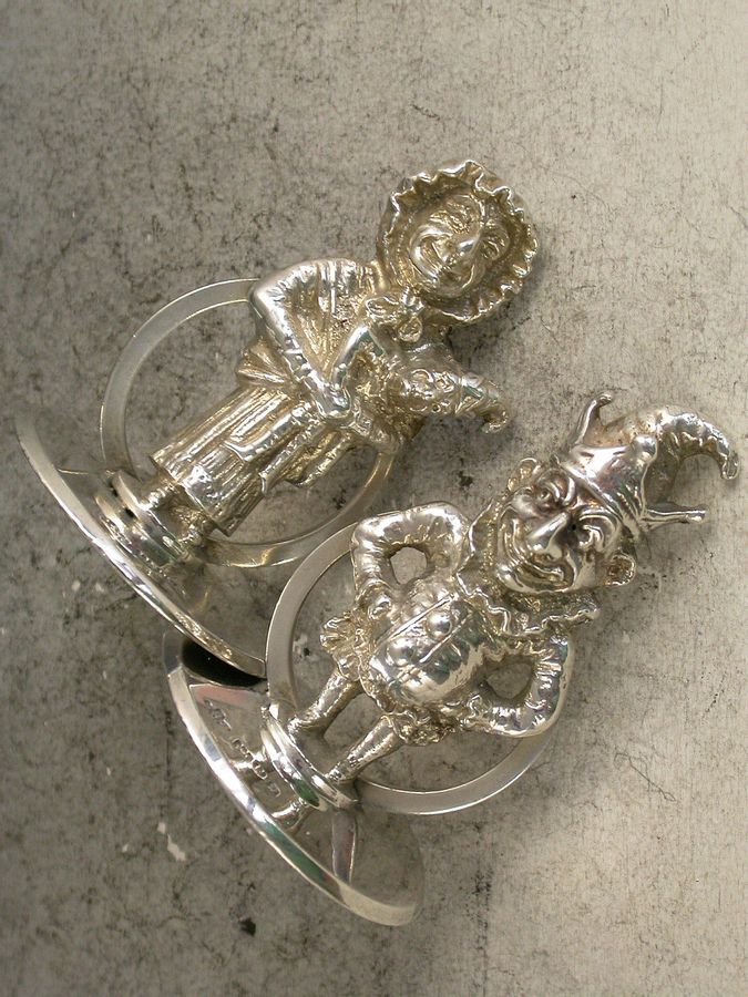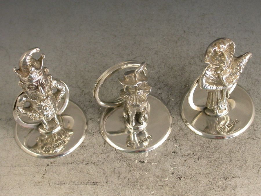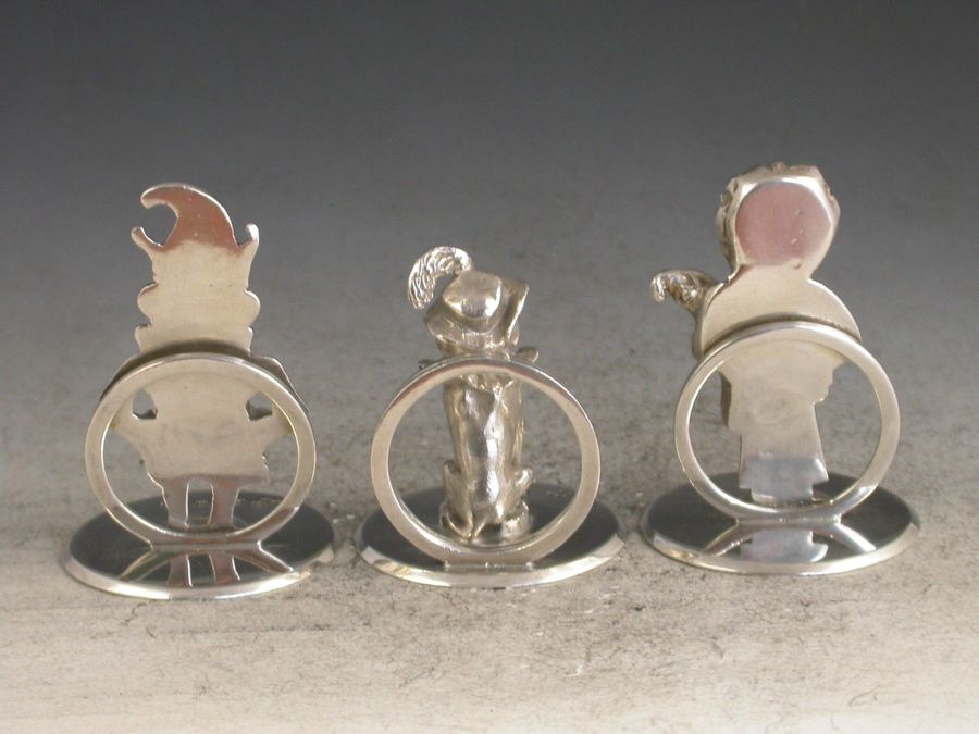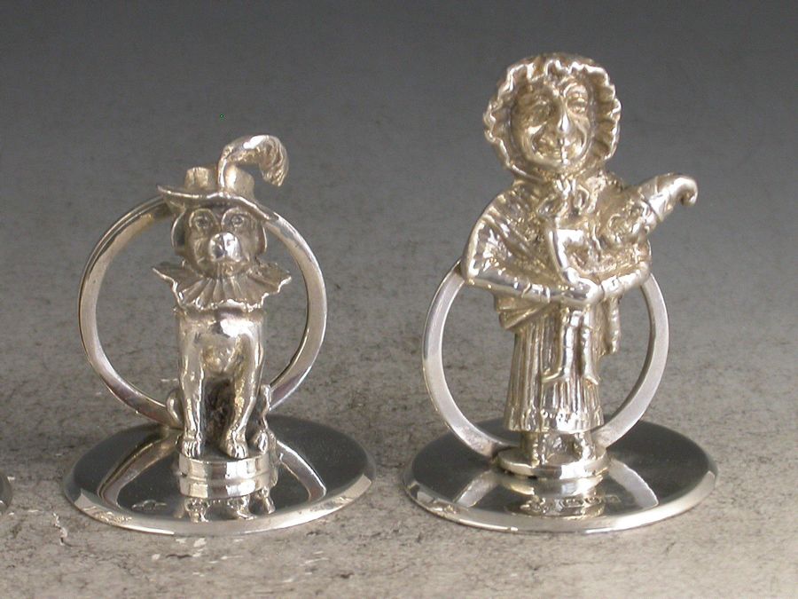 Rare Set 3 Edwardian Silver Menu Holders 'Mr Punch, Judy & Dog Toby'