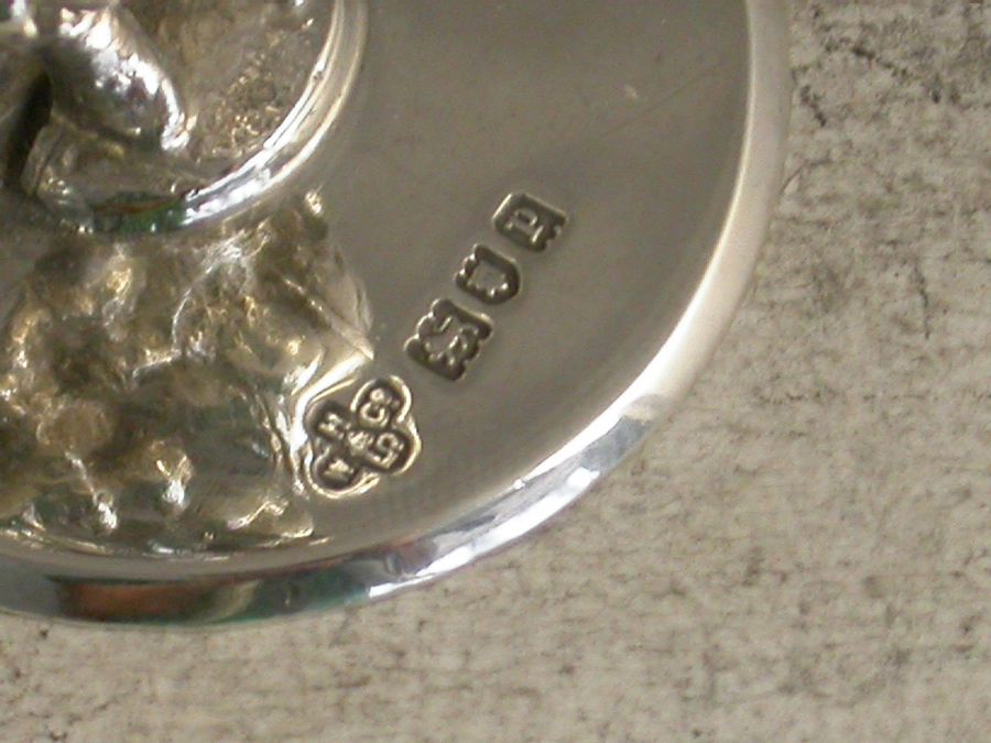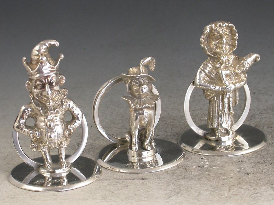 A fine quality and rare set three Edwardian cast silver Menu Holders formed as Mr Punch, his wife Judy and Dog Toby, on plain circular bases.