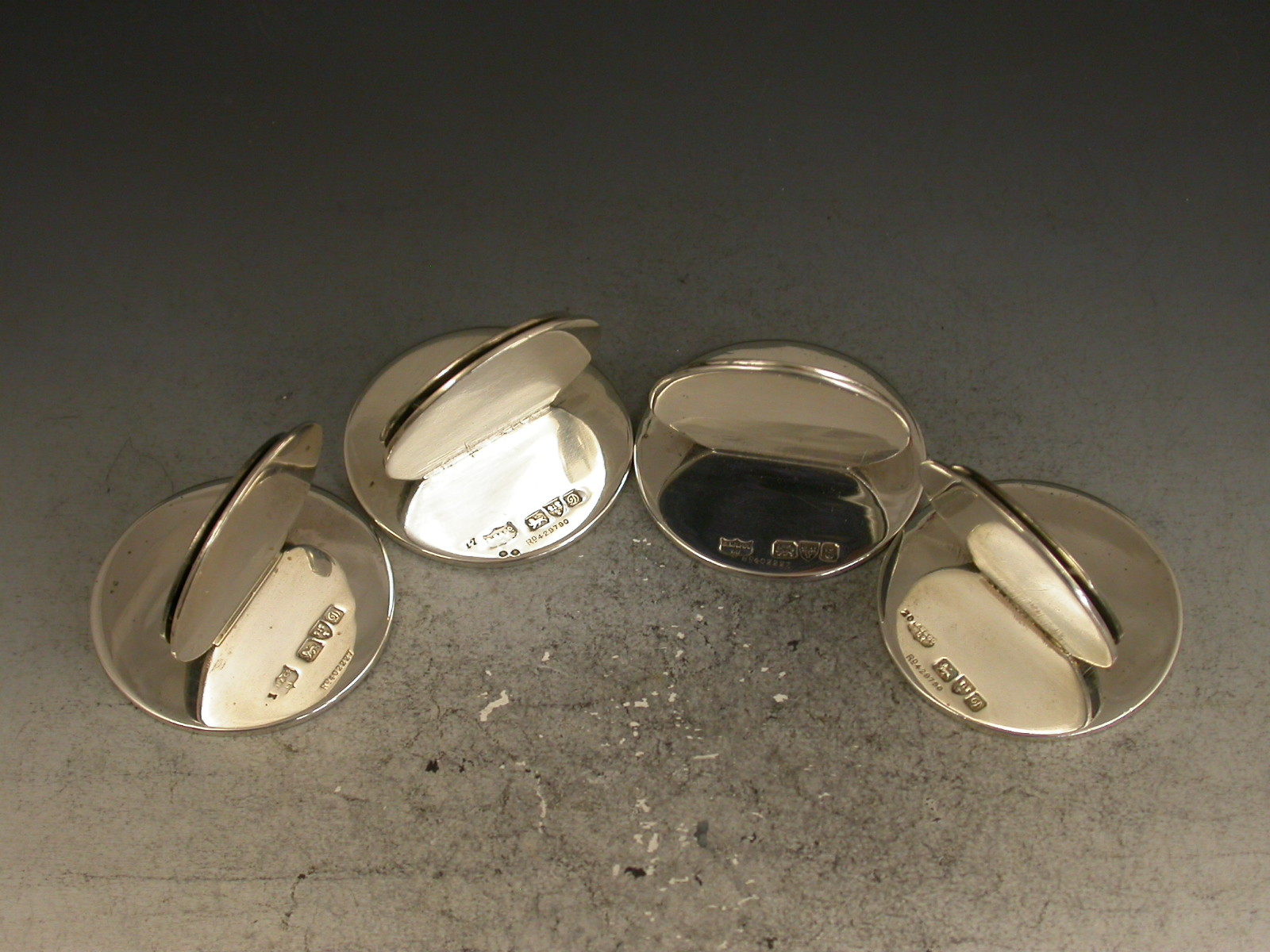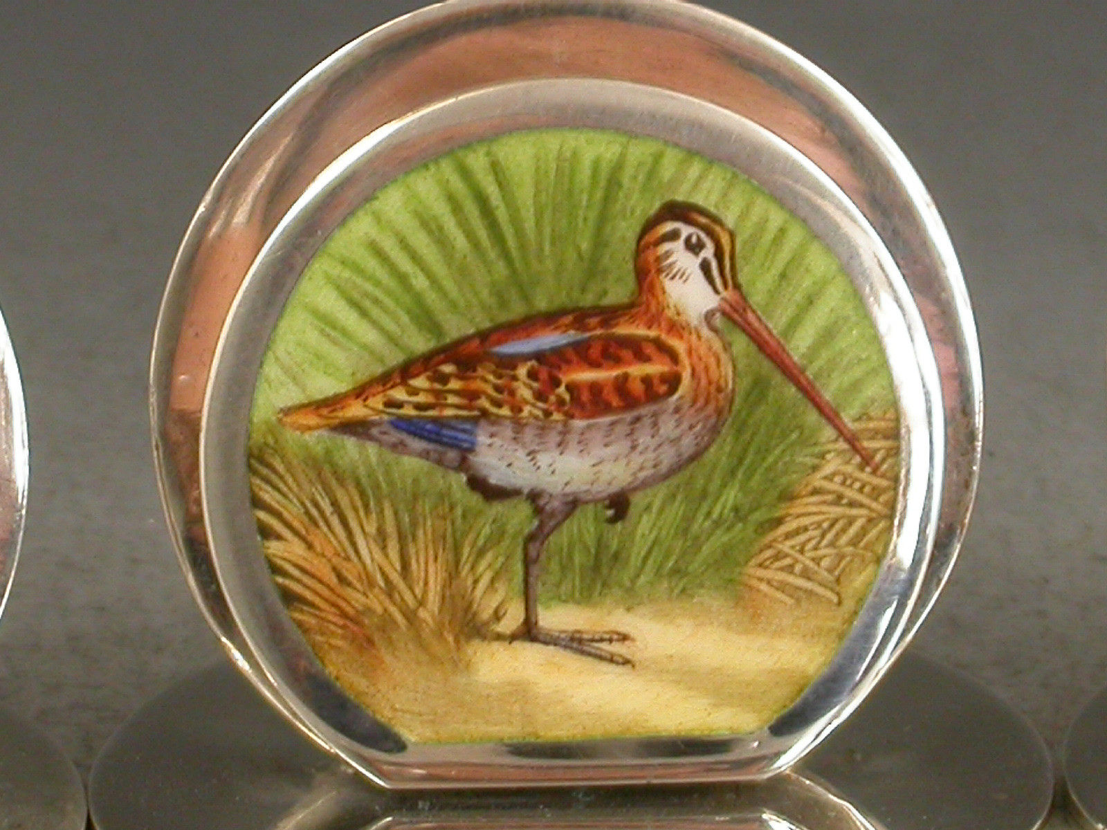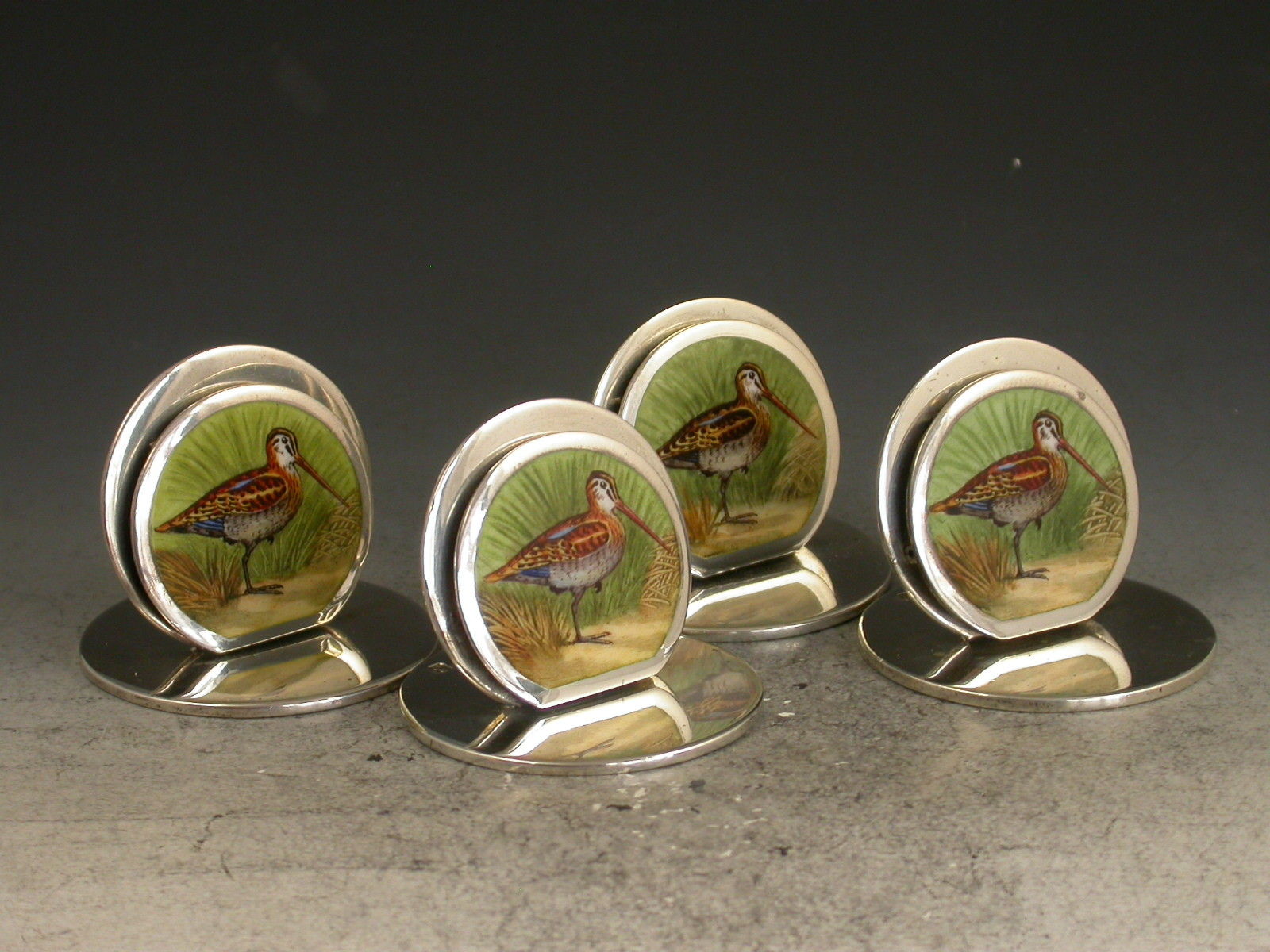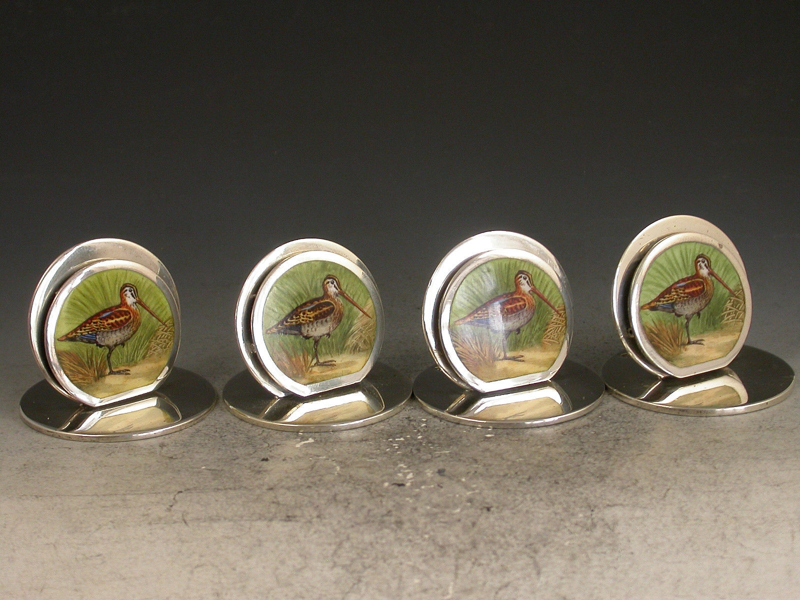 A fine and rare assembled set of four Edwardian silver and enamel Menu Holders of double- disc form on circular bases, the sprung circular front panels finely enamelled with Snipe amongst rushes.